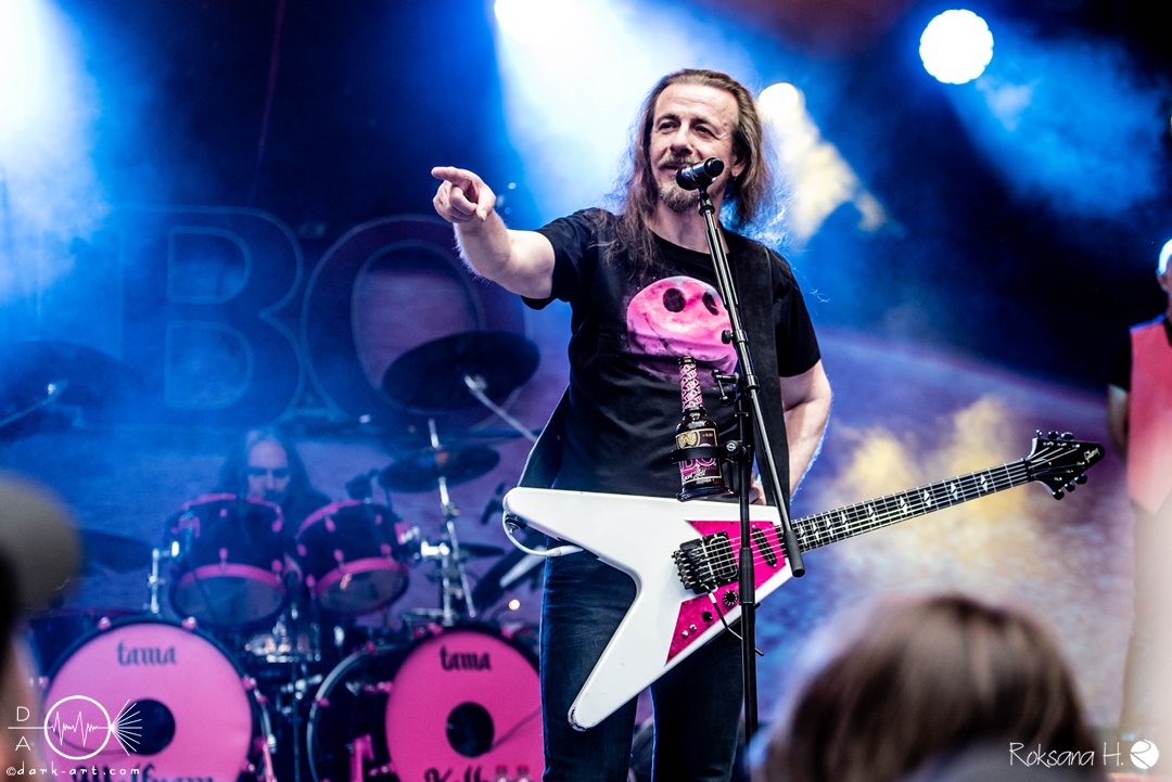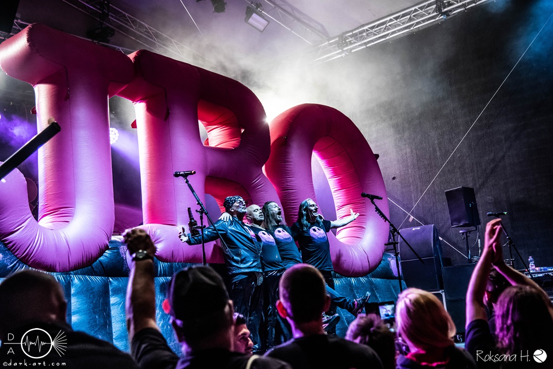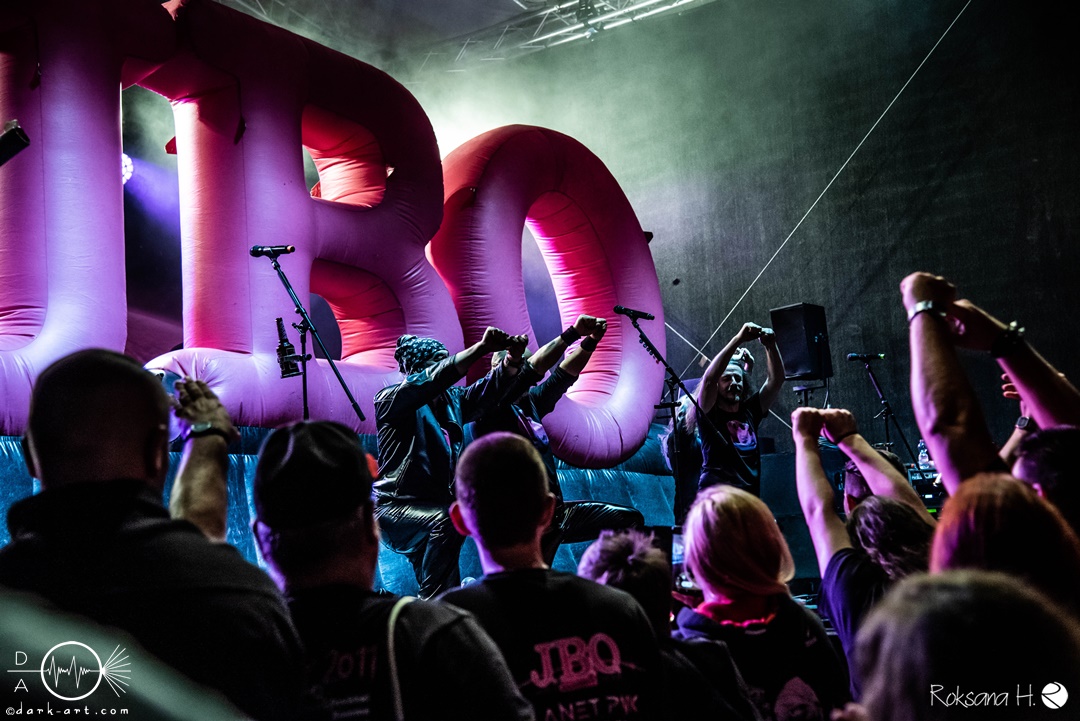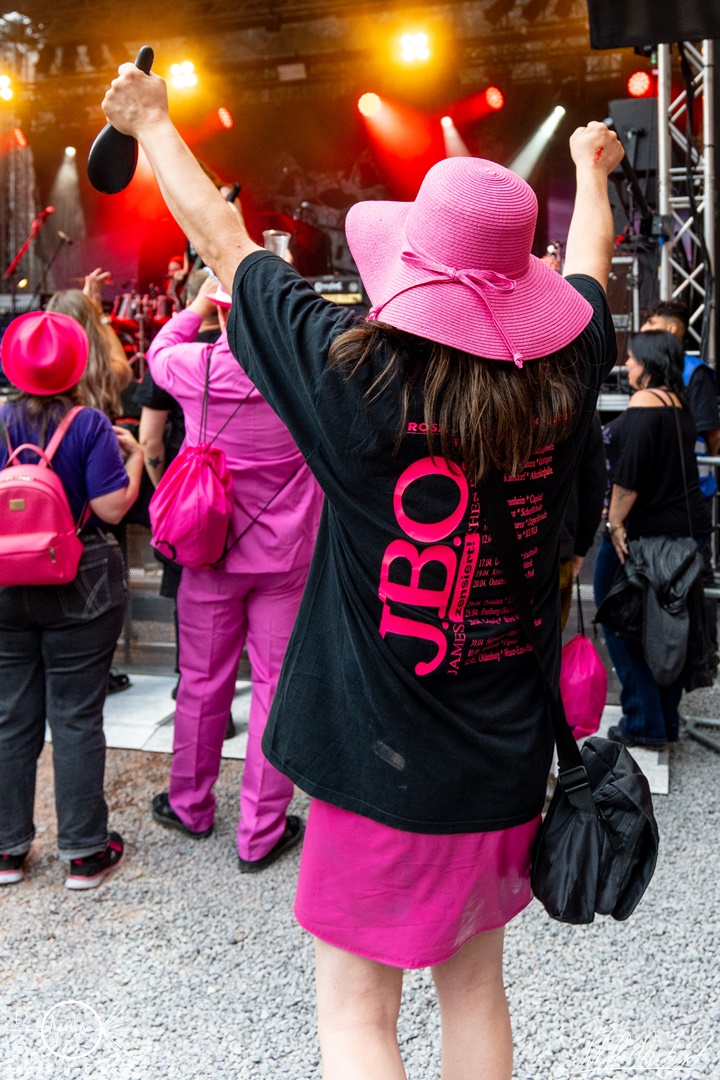Aber dass die vier nicht nur Blödsinn können, bewiesen sie mit der Ansage zur leider immer noch kritischen Situation in der Ukraine und dem Song Keep on Rockin‘ in the Free World, welcher im Original von Neil Young ist. Darauf hin verließen die Fun- Metaler erstmal die Bühne, um für die erste Zugabe unter Jubel zurück zu kommen und das Lied zu spielen, welches ihnen auf den Leib geschneidert ist. Zu Verteidiger des wahren Blödsinns erlebte die Stimmung im Publikum einen neuen Höhepunkt und die pinken riesigen Ballons, welche von den „Showfuzzies“ in die Zuhörer entlassen wurden, taten ihr übriges. Wenn erwachsene Menschen wieder zu Kids mutieren, ist J.B.O im Haus. Auch bei dem nächsten Titel Alles nur geklaut wurde amtlich gefeiert, gemosht, getanzt und lauthals mitgesungen. Dann ging es nach ganz kurzer Pause weiter mit der zweiten Zugabe. Wacken ist nur einmal im Jahr wurde ausgiebig zelebriert und zu Ein Fest wurde dann der riesige, pinke J.B.O. Schriftzug aufgeblasen, welcher bei der Crowd ein kollektives Handy zücken auslöste. Ich bin ja immer noch für eine Hüpfburg auf der Bühne, vielleicht eines Tages. Denn wie wir wissen, sind die vier immer für eine Überraschung gut. Und da ja bekanntlich irgendwann mal Schluss sein muss, ging auch dieser Gig dann zu Ende.
