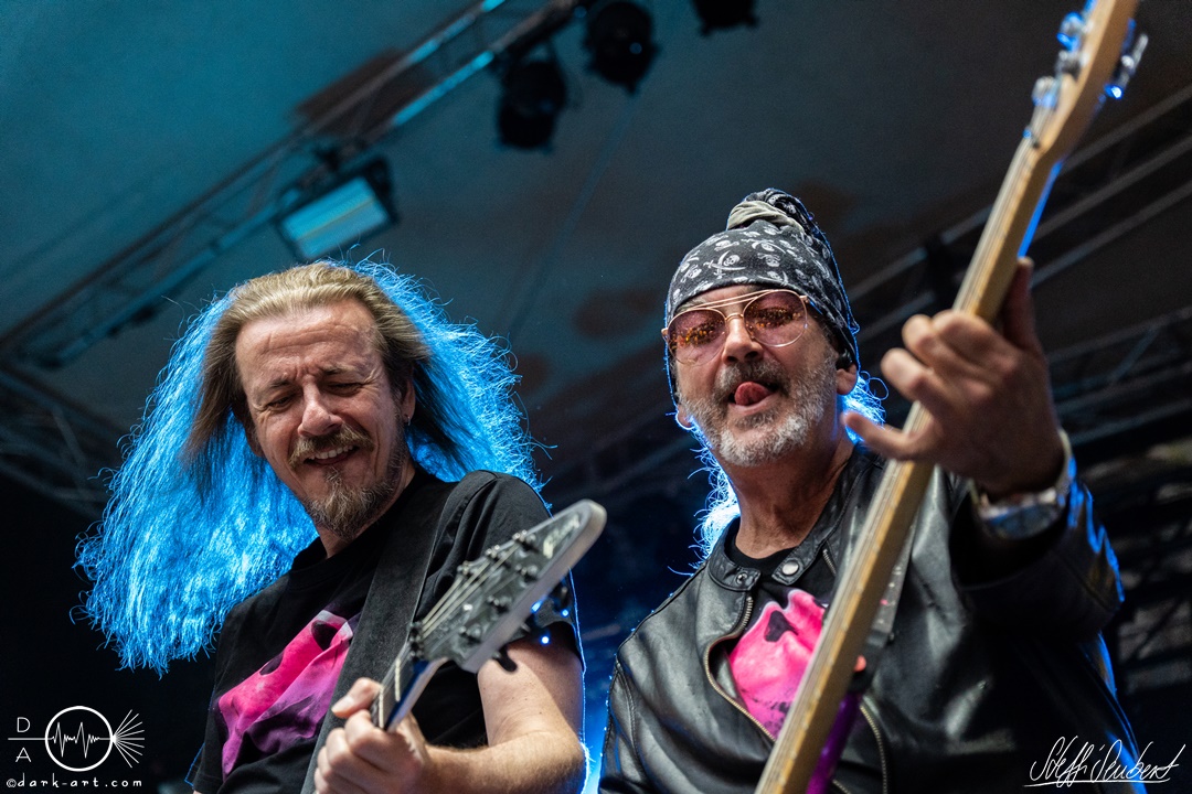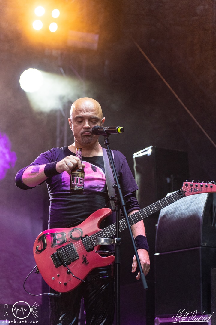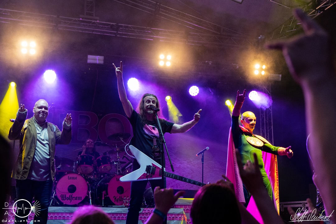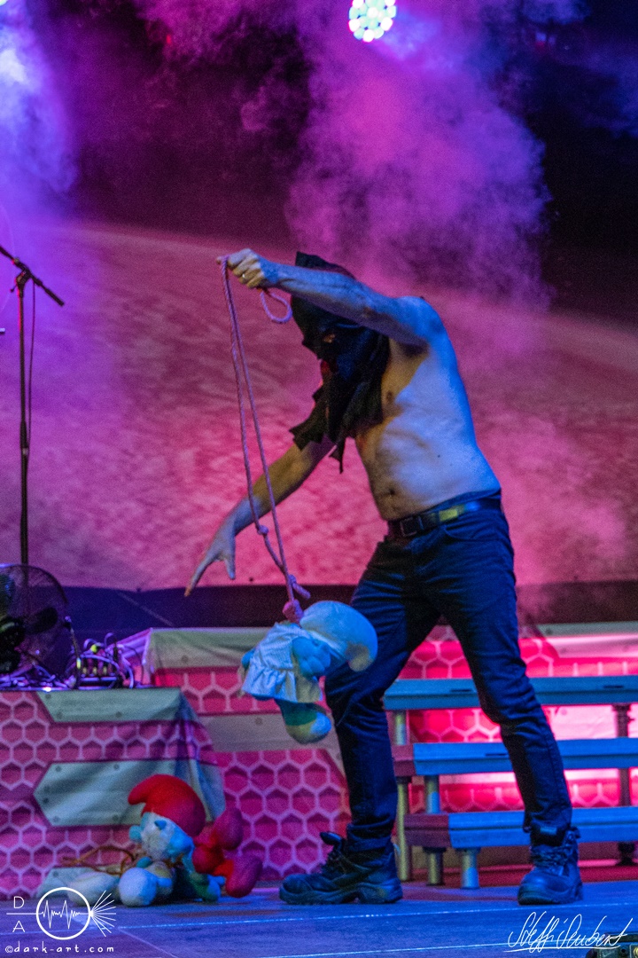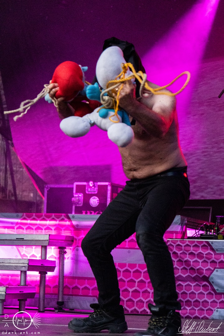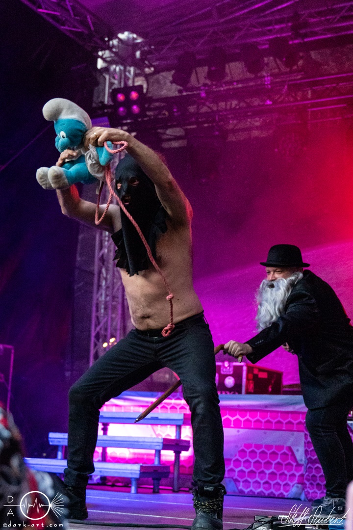 Mit dem Klassiker Bolle, der bei keinem Auftritt fehlen darf, ging es in die nächste Runde. Textsicher sangen alle lautstark mit. Es folgten I Don’t Like Metal und die herrlich bescheuerte, überaus zweideutige Eigenkomposition Einhorn, bei welchem auch tatsächlich, sehr zur Freude von Vito und Hannes, eines im Publikum gesichtet wurde. Mit Hofnarr stand dann wieder ein älterer Song auf dem Plan, welcher mit großem Applaus seitens der Zuhörer (und auch meinerseits) quittiert wurde. Der alte Quatsch geht tatsächlich immer, was wahrscheinlich auch dem relativ hohen Altersdurchschnitt der Crowd geschuldet ist. Mit Metal Was My First Love, Ich sag J.B.O (mit Seitenhieben über das Klischee des dödeligen Drummers) und Kuschelmetal ging es Schlag auf Schlag weiter, immer wieder unterbrochen durch Sticheleien seitens Vito gegen Hannes, was aber zu einer ordentlichen Sause der Jungs dazu gehört. Bei der Ansage zum nächsten Track, sie holen sich gleich ihren ältesten Gastsänger auf die Bühne, wusste schon jeder im Publikum was jetzt folgte. Es war Zeit für Schlumfozid im Stadtgebiet, bei welchem einer ihrer Showjungs als Vader Abraham mit Bart und Stock verkleidet über die Bühne hüpfte. Auch hatten sie einen Henker im Gepäck, der Papaschlumpf, Schlumpfine und einen bisher nicht identifizierten Schlumpf an zwei Stricken munter durch die Gegend schleuderte, sehr zur allgemeinen Erheiterung der anwesenden Crowd. Vielleicht war es ja der, der immer so schief gesungen hat. Aber wenn die Blödelkapelle eines nicht verlernt hat, dann wie `ne ordentliche Party geschmissen wird. Die Stimmung war überragend und es sollte noch besser werden.
