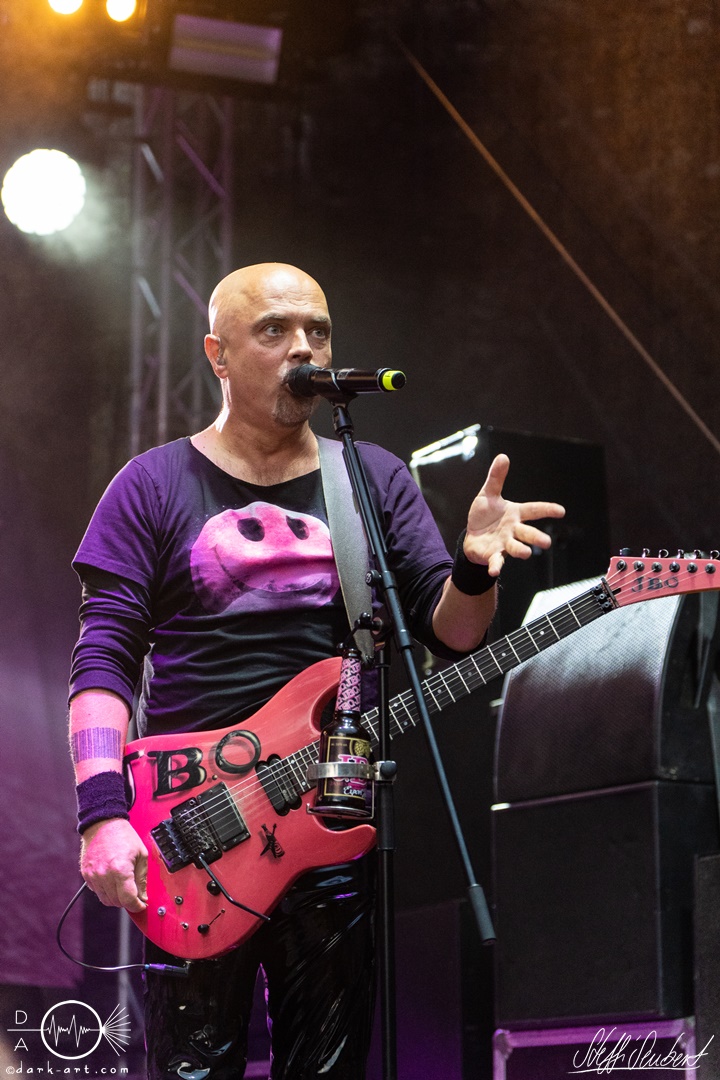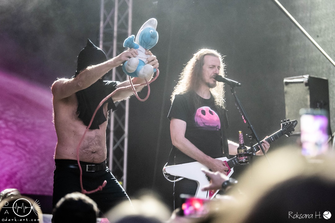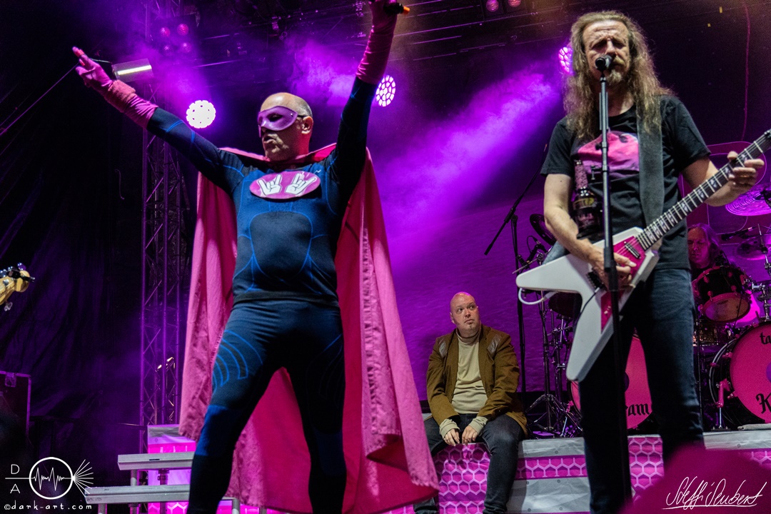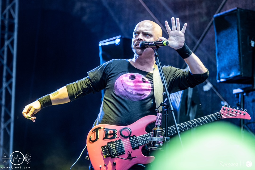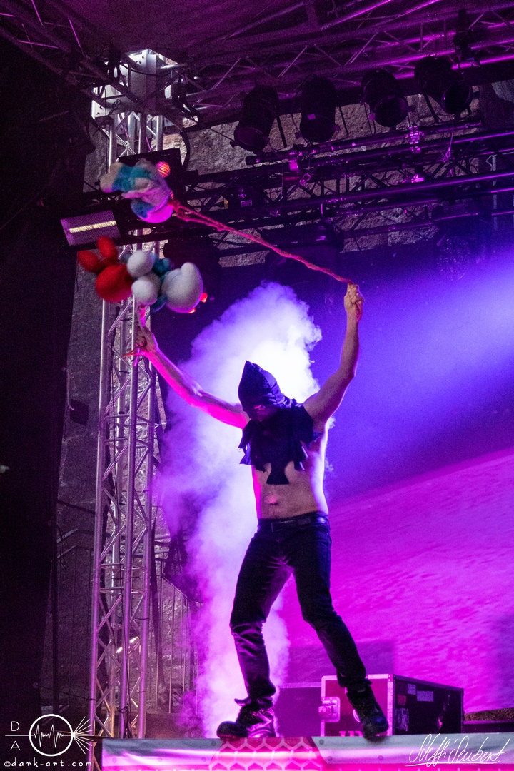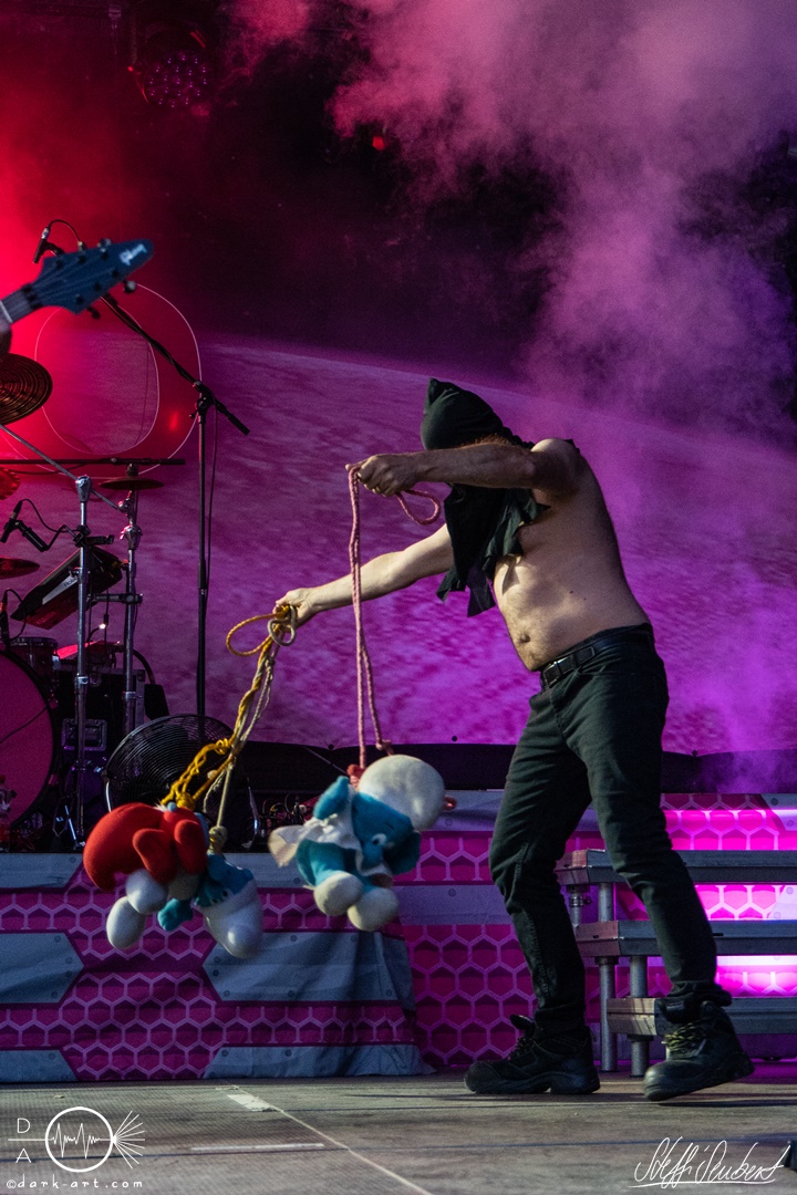 Mit dem Klassiker Bolle, der bei keinem Auftritt fehlen darf, ging es in die nächste Runde. Textsicher sangen alle lautstark mit. Es folgten I Don’t Like Metal und die herrlich bescheuerte, überaus zweideutige Eigenkomposition Einhorn, bei welchem auch tatsächlich, sehr zur Freude von Vito und Hannes, eines im Publikum gesichtet wurde. Mit Hofnarr stand dann wieder ein älterer Song auf dem Plan, welcher mit großem Applaus seitens der Zuhörer (und auch meinerseits) quittiert wurde. Der alte Quatsch geht tatsächlich immer, was wahrscheinlich auch dem relativ hohen Altersdurchschnitt der Crowd geschuldet ist. Mit Metal Was My First Love, Ich sag J.B.O (mit Seitenhieben über das Klischee des dödeligen Drummers) und Kuschelmetal ging es Schlag auf Schlag weiter, immer wieder unterbrochen durch Sticheleien seitens Vito gegen Hannes, was aber zu einer ordentlichen Sause der Jungs dazu gehört. Bei der Ansage zum nächsten Track, sie holen sich gleich ihren ältesten Gastsänger auf die Bühne, wusste schon jeder im Publikum was jetzt folgte. Es war Zeit für Schlumfozid im Stadtgebiet, bei welchem einer ihrer Showjungs als Vader Abraham mit Bart und Stock verkleidet über die Bühne hüpfte. Auch hatten sie einen Henker im Gepäck, der Papaschlumpf, Schlumpfine und einen bisher nicht identifizierten Schlumpf an zwei Stricken munter durch die Gegend schleuderte, sehr zur allgemeinen Erheiterung der anwesenden Crowd. Vielleicht war es ja der, der immer so schief gesungen hat. Aber wenn die Blödelkapelle eines nicht verlernt hat, dann wie `ne ordentliche Party geschmissen wird. Die Stimmung war überragend und es sollte noch besser werden.