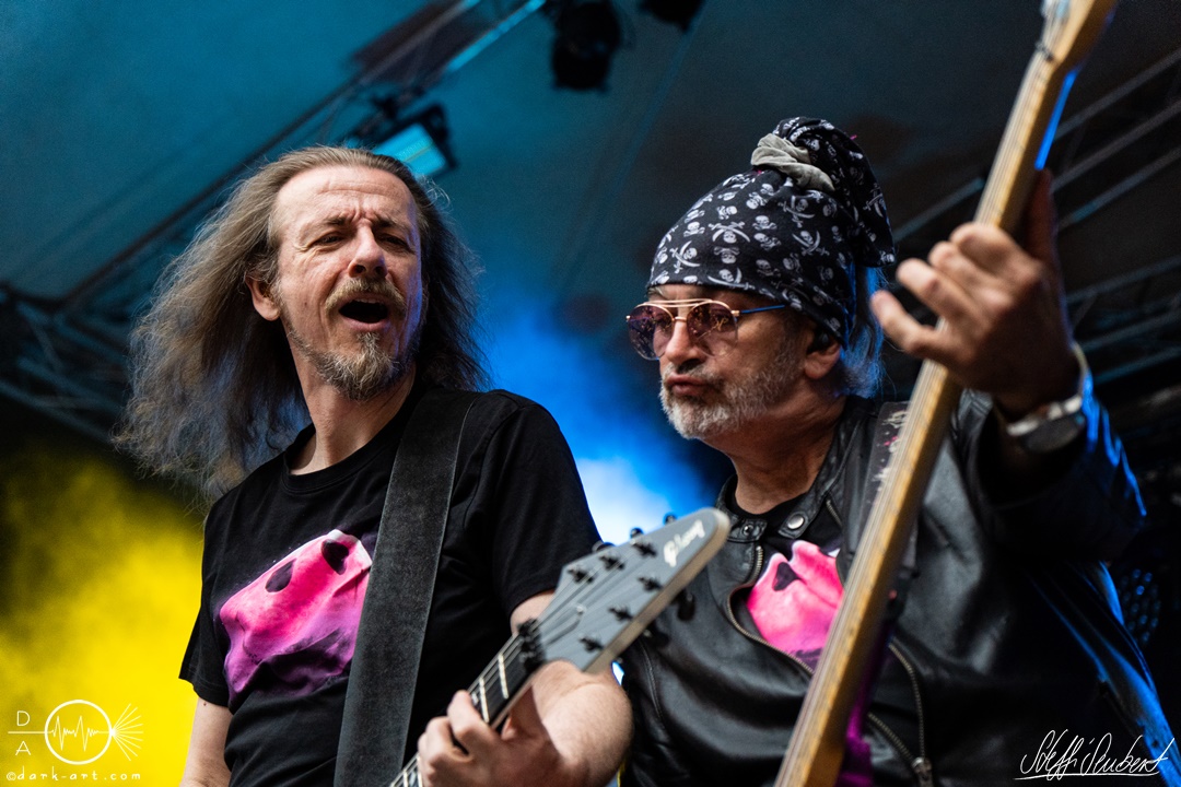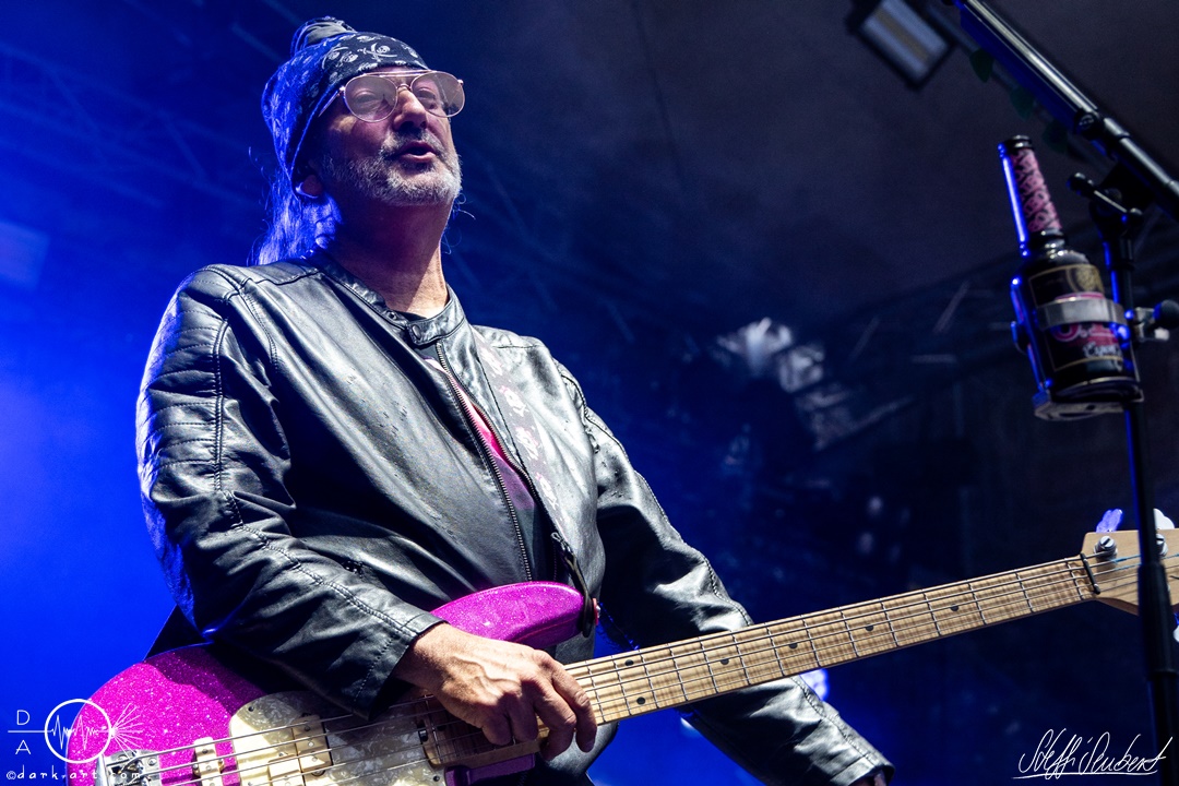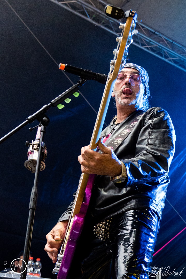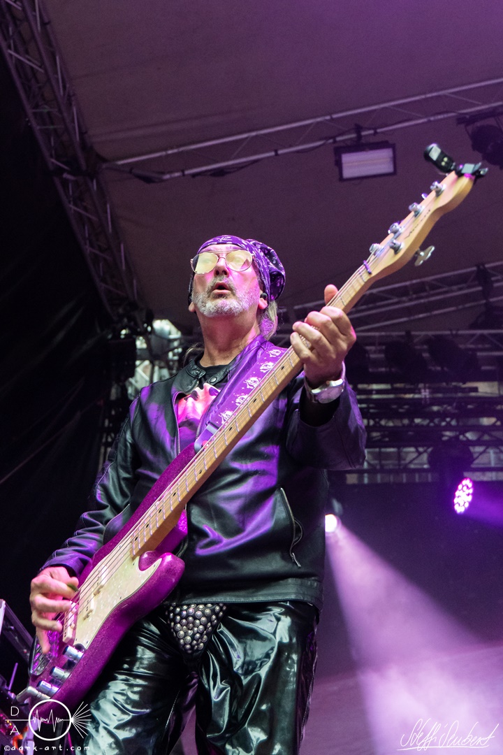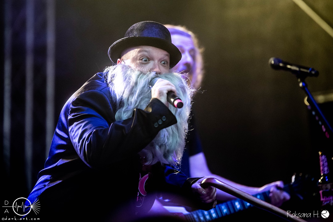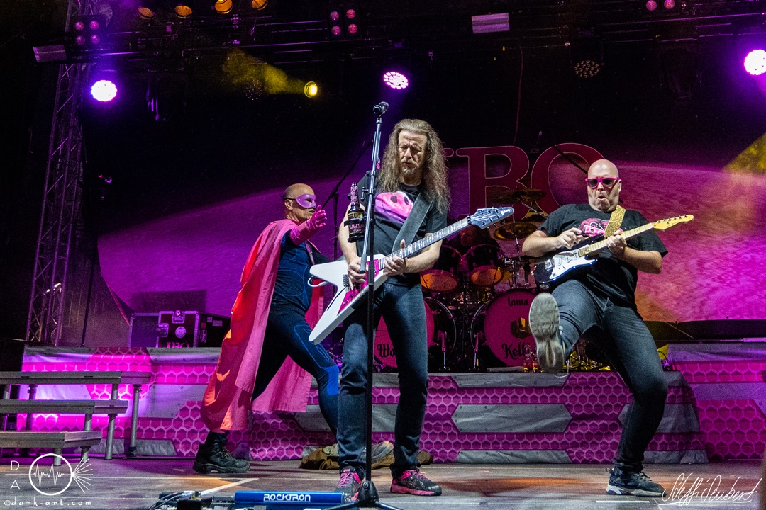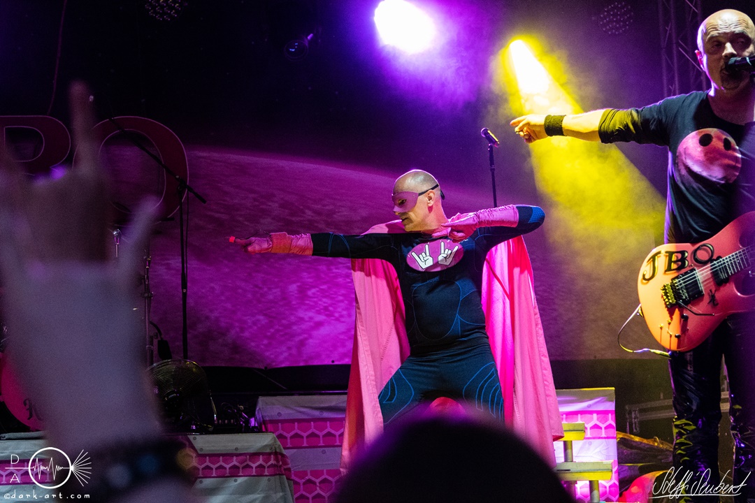Mit dem Klassiker Bolle, der bei keinem Auftritt fehlen darf, ging es in die nächste Runde. Textsicher sangen alle lautstark mit. Es folgten I Don’t Like Metal und die herrlich bescheuerte, überaus zweideutige Eigenkomposition Einhorn, bei welchem auch tatsächlich, sehr zur Freude von Vito und Hannes, eines im Publikum gesichtet wurde. Mit Hofnarr stand dann wieder ein älterer Song auf dem Plan, welcher mit großem Applaus seitens der Zuhörer (und auch meinerseits) quittiert wurde. Der alte Quatsch geht tatsächlich immer, was wahrscheinlich auch dem relativ hohen Altersdurchschnitt der Crowd geschuldet ist. Mit Metal Was My First Love, Ich sag J.B.O (mit Seitenhieben über das Klischee des dödeligen Drummers) und Kuschelmetal ging es Schlag auf Schlag weiter, immer wieder unterbrochen durch Sticheleien seitens Vito gegen Hannes, was aber zu einer ordentlichen Sause der Jungs dazu gehört. Bei der Ansage zum nächsten Track, sie holen sich gleich ihren ältesten Gastsänger auf die Bühne, wusste schon jeder im Publikum was jetzt folgte. Es war Zeit für Schlumfozid im Stadtgebiet, bei welchem einer ihrer Showjungs als Vader Abraham mit Bart und Stock verkleidet über die Bühne hüpfte. Auch hatten sie einen Henker im Gepäck, der Papaschlumpf, Schlumpfine und einen bisher nicht identifizierten Schlumpf an zwei Stricken munter durch die Gegend schleuderte, sehr zur allgemeinen Erheiterung der anwesenden Crowd. Vielleicht war es ja der, der immer so schief gesungen hat. Aber wenn die Blödelkapelle eines nicht verlernt hat, dann wie `ne ordentliche Party geschmissen wird. Die Stimmung war überragend und es sollte noch besser werden.
