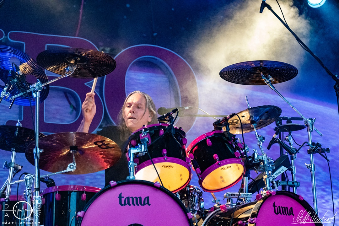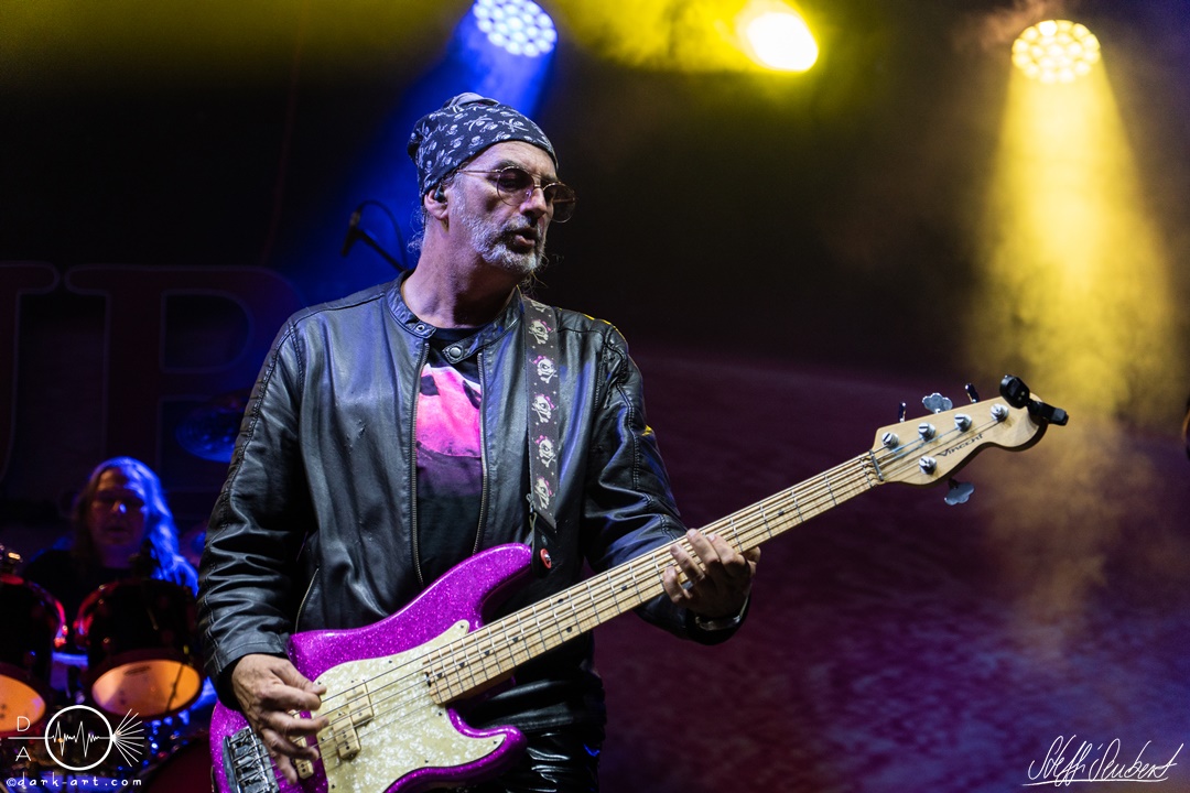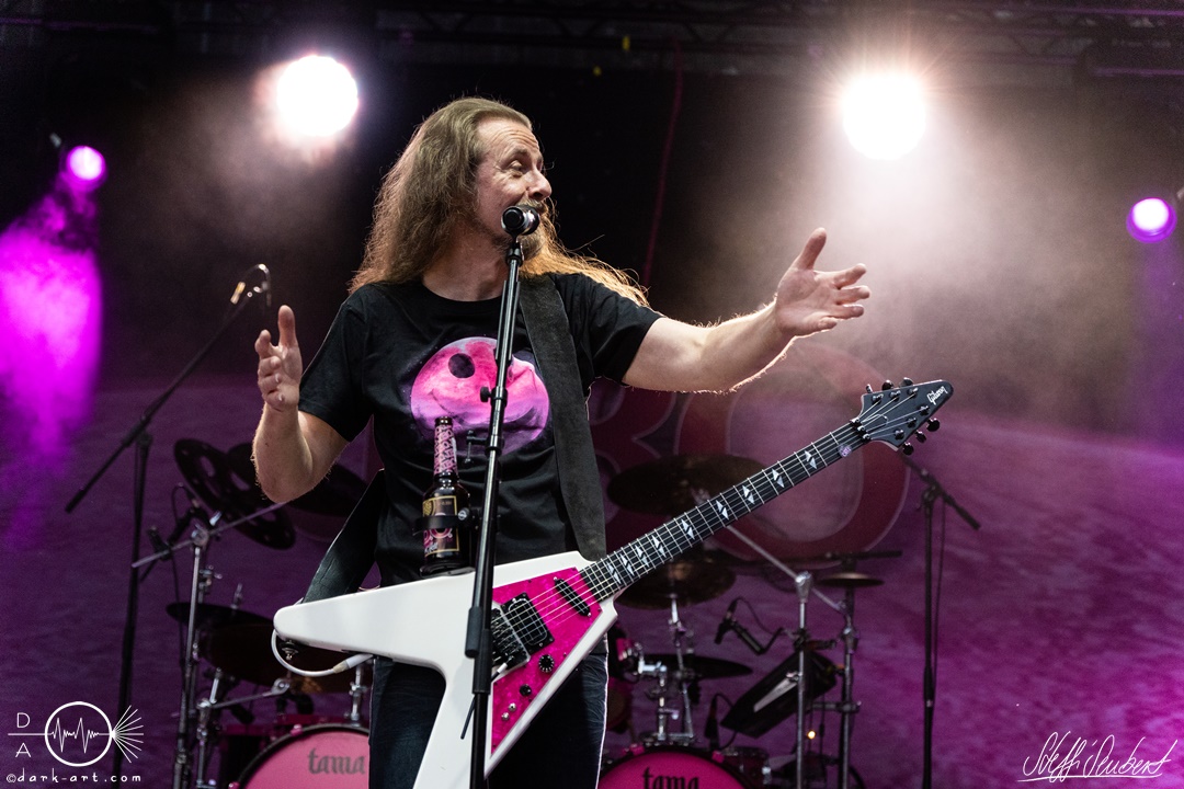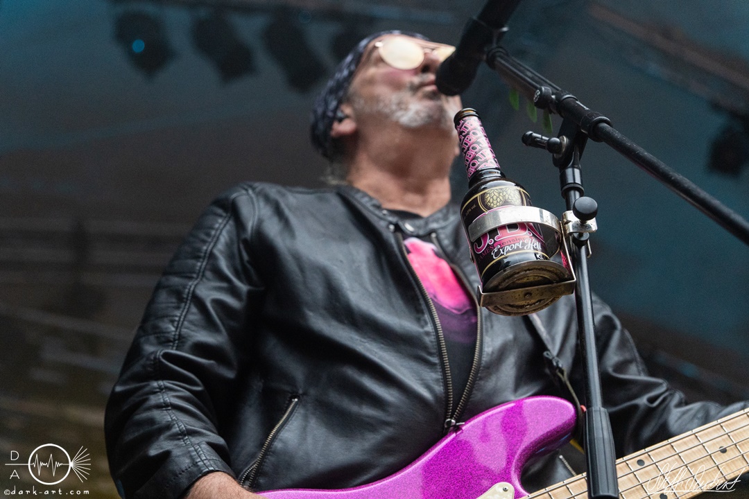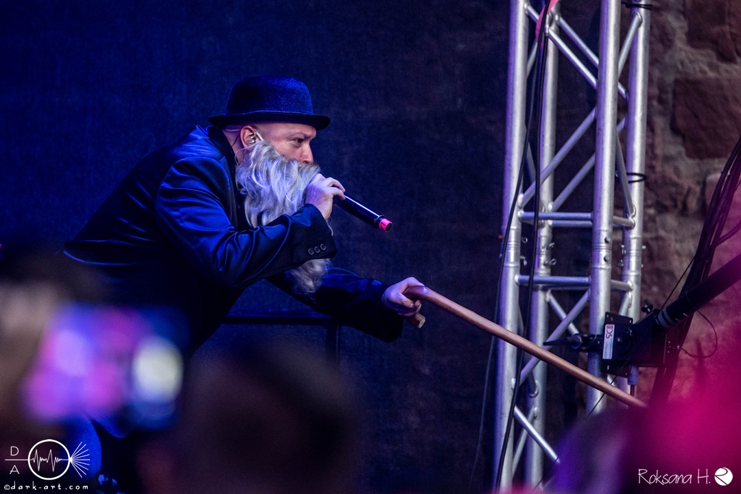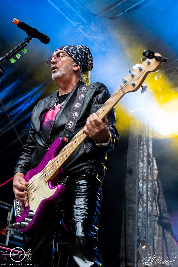 Mit dem Klassiker Bolle, der bei keinem Auftritt fehlen darf, ging es in die nächste Runde. Textsicher sangen alle lautstark mit. Es folgten I Don’t Like Metal und die herrlich bescheuerte, überaus zweideutige Eigenkomposition Einhorn, bei welchem auch tatsächlich, sehr zur Freude von Vito und Hannes, eines im Publikum gesichtet wurde. Mit Hofnarr stand dann wieder ein älterer Song auf dem Plan, welcher mit großem Applaus seitens der Zuhörer (und auch meinerseits) quittiert wurde. Der alte Quatsch geht tatsächlich immer, was wahrscheinlich auch dem relativ hohen Altersdurchschnitt der Crowd geschuldet ist. Mit Metal Was My First Love, Ich sag J.B.O (mit Seitenhieben über das Klischee des dödeligen Drummers) und Kuschelmetal ging es Schlag auf Schlag weiter, immer wieder unterbrochen durch Sticheleien seitens Vito gegen Hannes, was aber zu einer ordentlichen Sause der Jungs dazu gehört. Bei der Ansage zum nächsten Track, sie holen sich gleich ihren ältesten Gastsänger auf die Bühne, wusste schon jeder im Publikum was jetzt folgte. Es war Zeit für Schlumfozid im Stadtgebiet, bei welchem einer ihrer Showjungs als Vader Abraham mit Bart und Stock verkleidet über die Bühne hüpfte. Auch hatten sie einen Henker im Gepäck, der Papaschlumpf, Schlumpfine und einen bisher nicht identifizierten Schlumpf an zwei Stricken munter durch die Gegend schleuderte, sehr zur allgemeinen Erheiterung der anwesenden Crowd. Vielleicht war es ja der, der immer so schief gesungen hat. Aber wenn die Blödelkapelle eines nicht verlernt hat, dann wie `ne ordentliche Party geschmissen wird. Die Stimmung war überragend und es sollte noch besser werden.