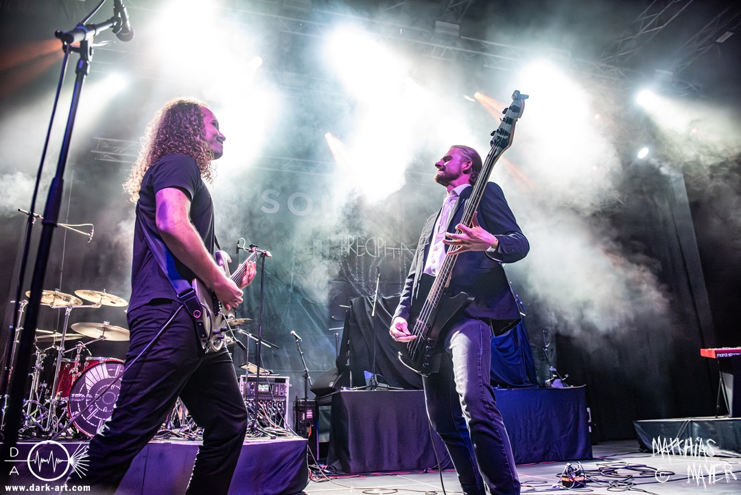Im Anschluss folgten Soulsplitter. Die deutsche Progressive Metal Band trat musikalisch in gänzlich andere Fußstapfen als Precipitation: Facettenreicher, über jegliche Genregrenzen hinaus tänzelnd, und dabei dennoch mit einem durchgängigen, spannenden Ansatz. Besonders auffällig war dabei der bis zu vierstimmige Gesang. Mit bisher zwei Alben und einem weiteren in der Pipeline hatte die Band allerlei Auswahl. Auch, wenn sie zu Beginn mit The Moloch noch auf ein etwas reservierteres Publikum trafen, taute dieses mit den darauffolgenden Songs merklich auf. Keyboarder Lewin bedankte sich beim Publikum und übernahm die Ansagen für den Abend. Zu Ende des Sets gab es eine quasi Livepremiere eines noch nicht erschienen Songs The Algorithm.