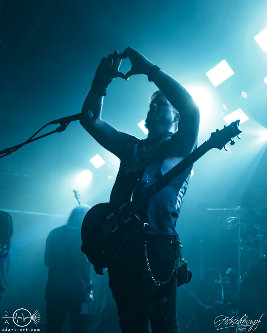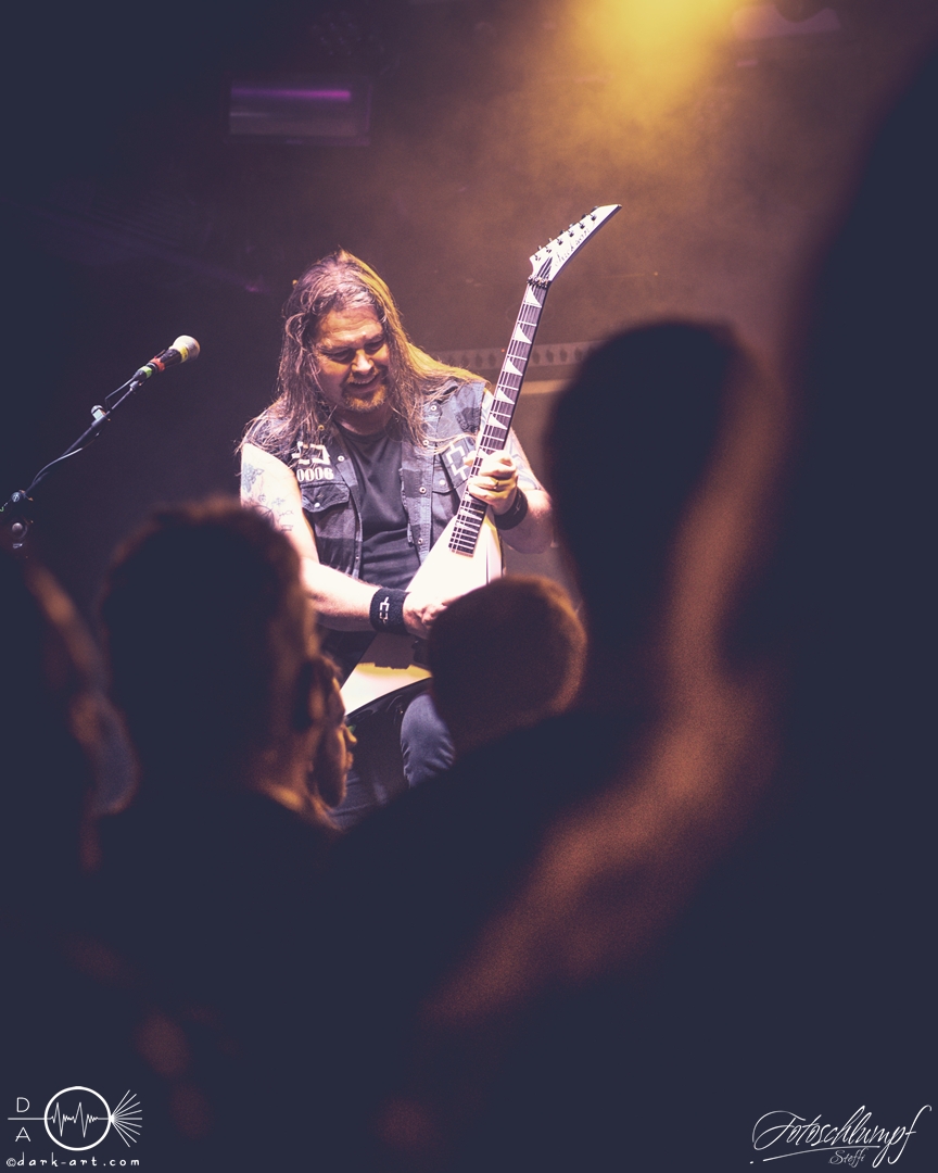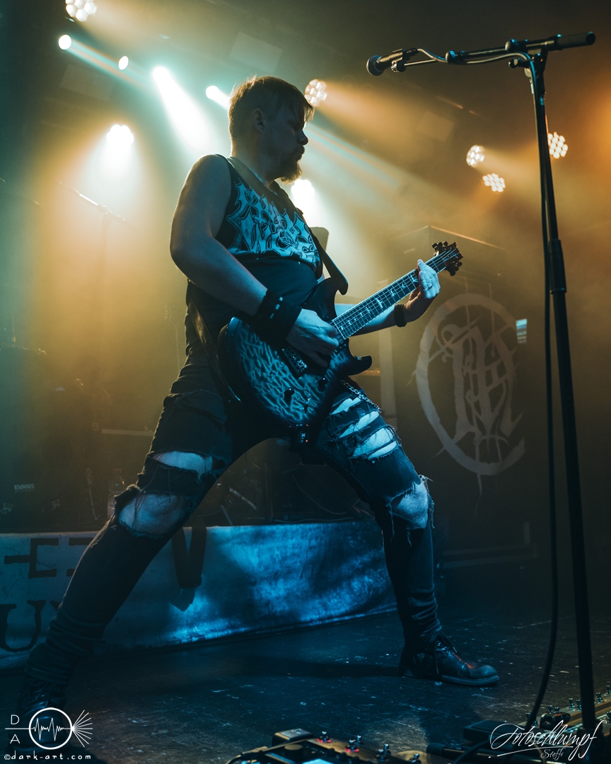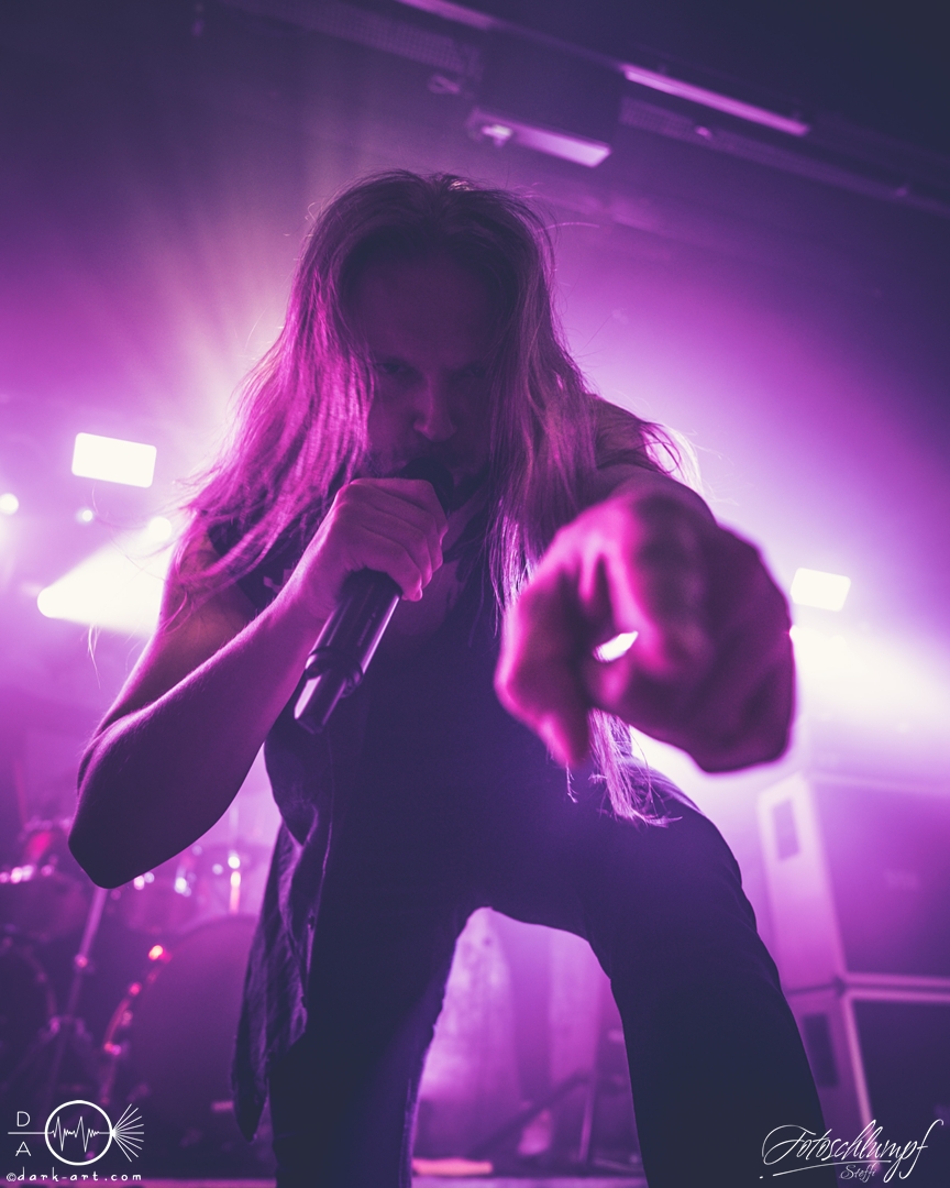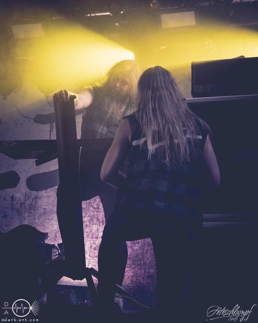 Leider konnte Frontmann Jukka nicht an der Tour teilnehmen, da vor Kurzem Lymphdrüsenkrebs bei ihm diagnostiziert wurde. Alles Gute und eine hoffentlich schnelle Genesung an dieser Stelle! Vertreten wurde er von Henry Hämäläinen (Shade Empire und Halysis), welcher seine Sache auch wirklich sehr gut machte und auch die offizielle Weste mit der Nummerierung 7 erhielt, wie Markus erzählte.