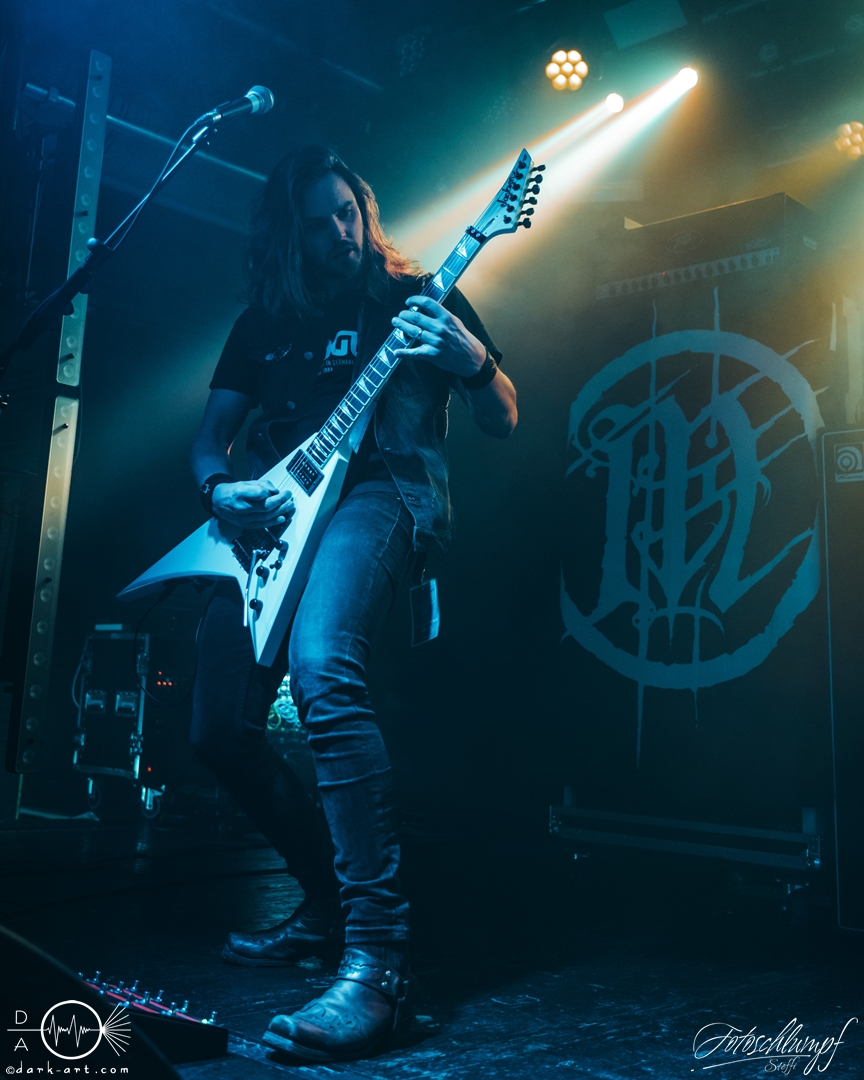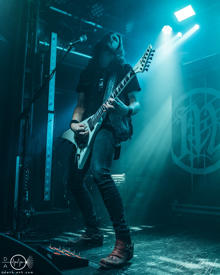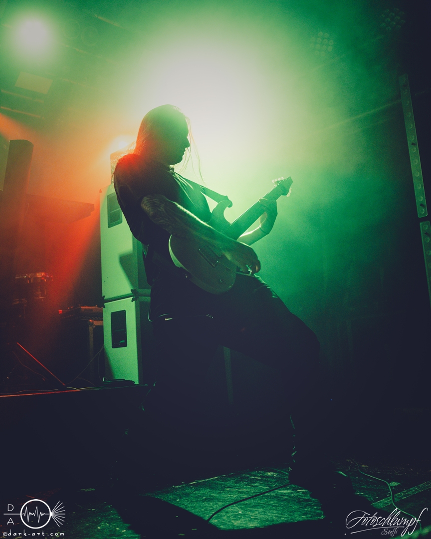 Den Anfang, im sich ganz langsam füllenden Colos-Saal, machten die schwedischen In Mourning. Das letzte Mal hatte ich diese auf der gemeinsamen Tour mit Insomnium Ende 2023 gesehen und war dementsprechend gespannt, wie sie sich weiter entwickelt haben. Als es endlich losging und die Leinwand die Bühne freigab, legten die Jungs direkt los. Wunderschöner, melodischer Metal, mit ausgefeilten Klangstrukturen und feinen Riffs… Ja, In Mourning haben das ziemlich gut drauf. Eine andere Besonderheit ist, das sie einfach unfassbar viel Spaß auf der Bühne haben. Die kamen aus dem Grinsen überhaupt nicht mehr heraus.