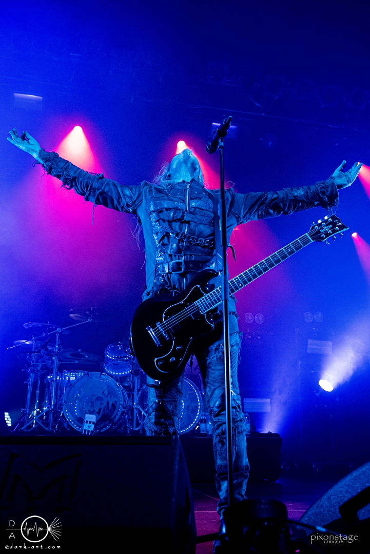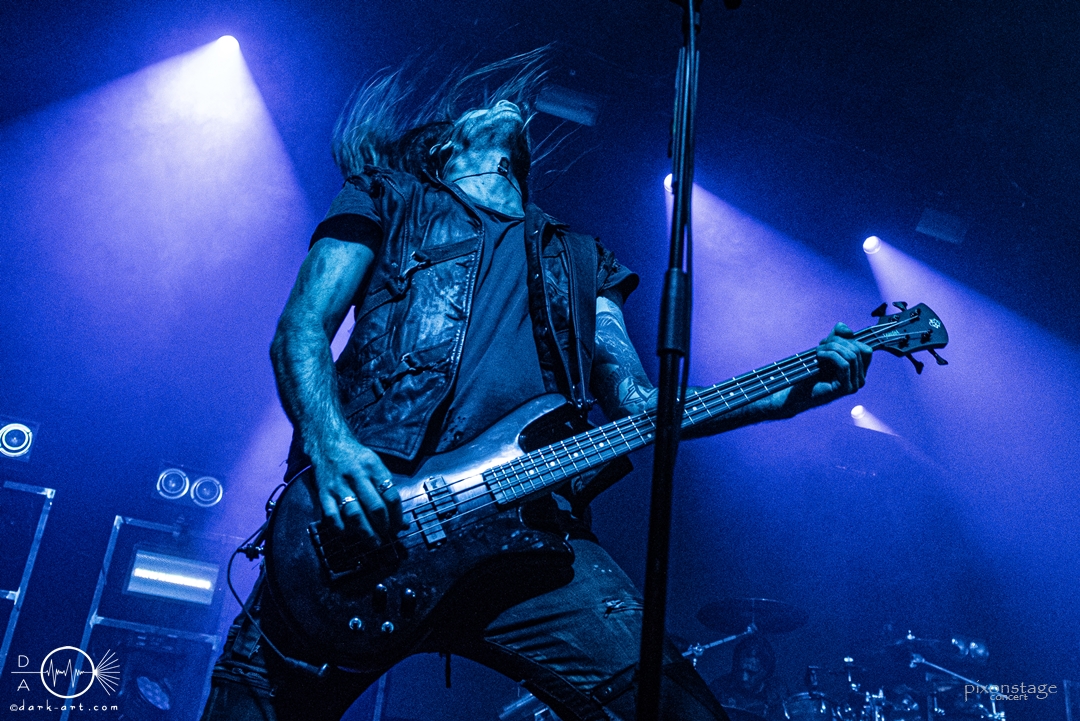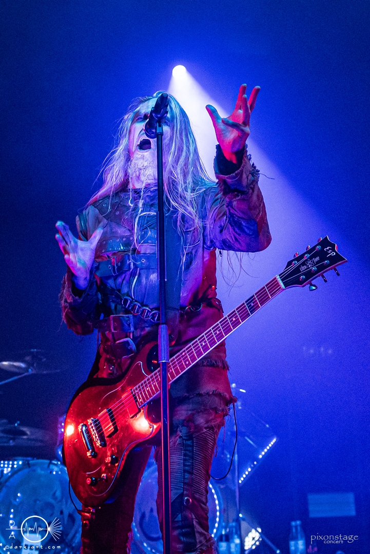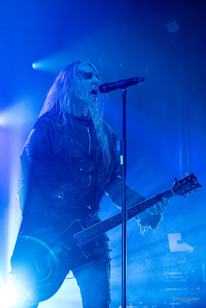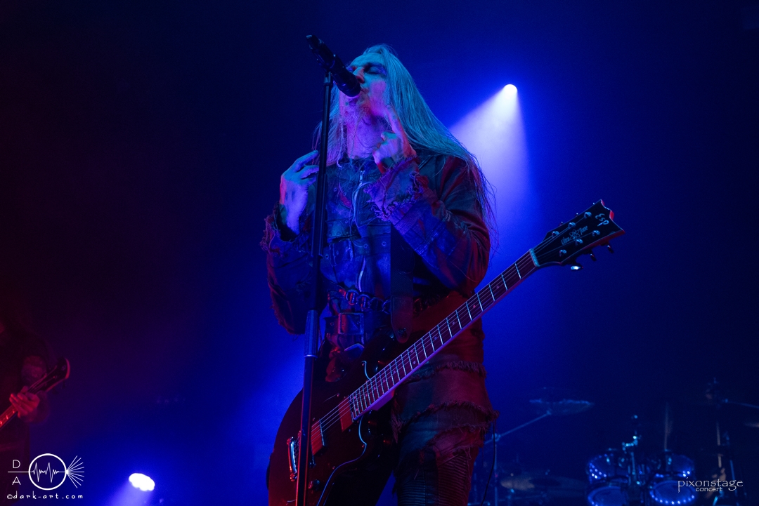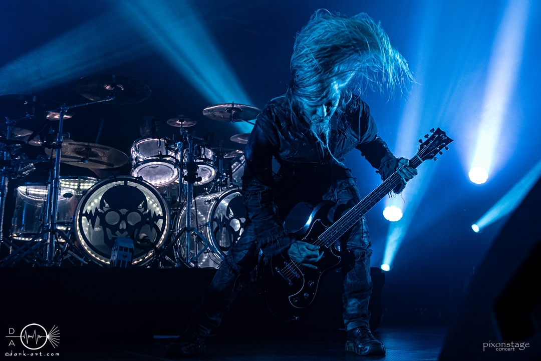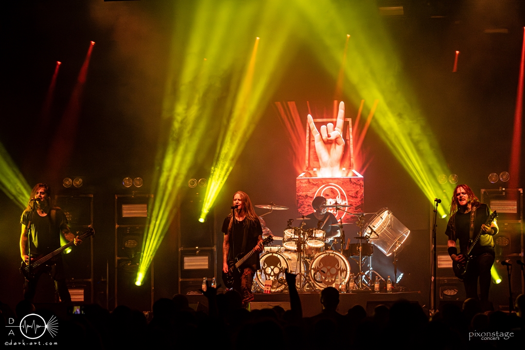 Und dann durften endlich PAIN ran. Nachdem auf der LED-Leinwand ein kurzer Einspieler gezeigt wurde, in dem der Painhead, das Maskottchen der Band, den Schriftzug mit dem Hammer zertrümmert, kamen die vier Musiker auf die Bühne. Dieser putzige Geselle sollte uns auch im Laufe der Show noch mehrmals begegnen. Was dann folgte, war ein munterer Querschnitt durch die Diskografie der Truppe, rund um Hypocrisy-Mastermind Peter Tägtgren. Angefangen bei Let me out und The Great Pretender von dem Werk You Only Live Twice, bis hin zu Monkey Buisness. Und das ganze immer stimmig untermalt von einer fantastischen Lichtshow, welche perfekt auf die Songs getimt war, genauso wie der dezent, aber gezielt, eingesetzte Nebel. Genau richtig dosiert. Auch war das Drumkit ein echter Hingucker. Transparente Korpusse, in denen LED-Bänder eingearbeitet waren, welche ebenfalls stimmig zum Rest der Show die Farbe wechselten. Geiles Teil. Vor Call me gab es wieder eine Zwischensequenz mit dem Maskottchen, welches sich eine vermeintliche Frau angelt, welche sich dann aber am Ende als sein Widersacher entpuppt. Fieser Plottwist, wir hatten uns so für den kleinen Kerl gefreut. Kurz nachdem der Song gestartet war, erschien wieder jemand auf der Leinwand. Es war die Comicfigur von Sabaton-Sänger Joakim, welcher fingiert den Track sprengte, während die Band stoppte und so tat, als würden sie darüber diskutieren. Nette Idee, die ganze Geschichte. Als sich die Zeichentrickfigur in einen realen Menschen verwandelte, ging der Song weiter. Fast wären wir dann noch in den Genuss der Telefonnummer von Bassisten Jonathan gekommen, hätte Peter das Ende der Nummer nicht „vergessen“. Zu dem ruhigen Stück Have a Drink on Me nahmen alle auf Barhockern Platz, bis auf Jonathan, welcher auf einer aufgestellten Bierkiste geparkt wurde und sich deswegen veräppeln lassen musste. Kam bestimmt davon, dass er seine Nummer nicht verraten wollte. Bei Same Old Song drehte das Publikum erst richtig auf und sang lauthals mit. Und leider muss auch irgendwann ein PAIN-Konzert zu Ende gehen, aber vorher hauten die vier nochmal ein paar Zugaben raus. Die erste war Party in my Head, nur dass die hier formvollendet auf der Bühne stattfand, mit ein paar Schweden in 80er-Party-Outfits aus Plüsch und einem Peter im Big-Lebowski-Gedächtnis-Bademantel. Fantastisch! Auch On And On und I’m going in schafften es in das Set. Den Abschluss aber läutete Shut your Mouth ein, bei dem auch die Zuschauer nochmal alles gaben. Was für ein Auftritt, mit einer wahnsinnig tollen Lichtshow und gezielten, liebevoll platzierten Einspielern, die entweder eine Geschichte erzählten oder in den nächsten Track überleiteten. Ich freue mich schon, wenn sie hoffentlich bald wieder nach Deutschland kommen!