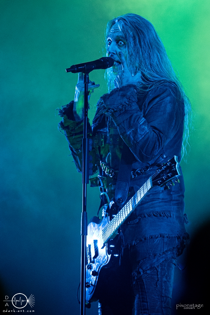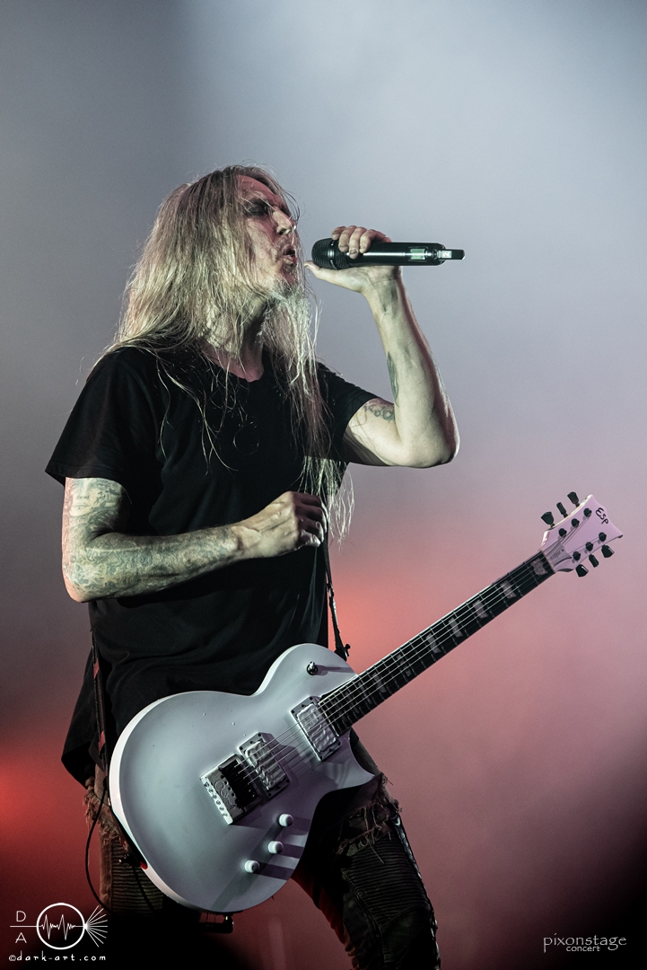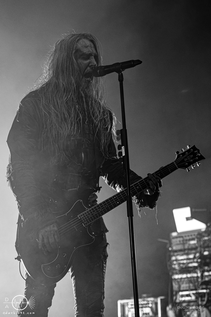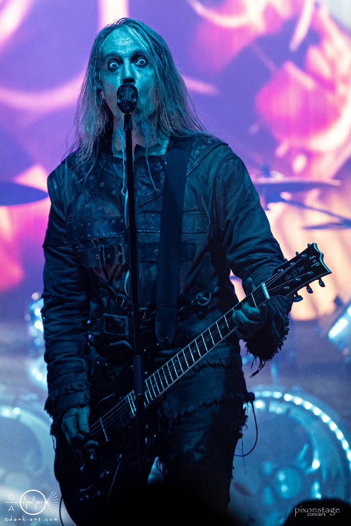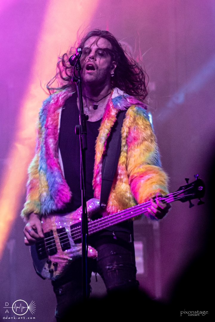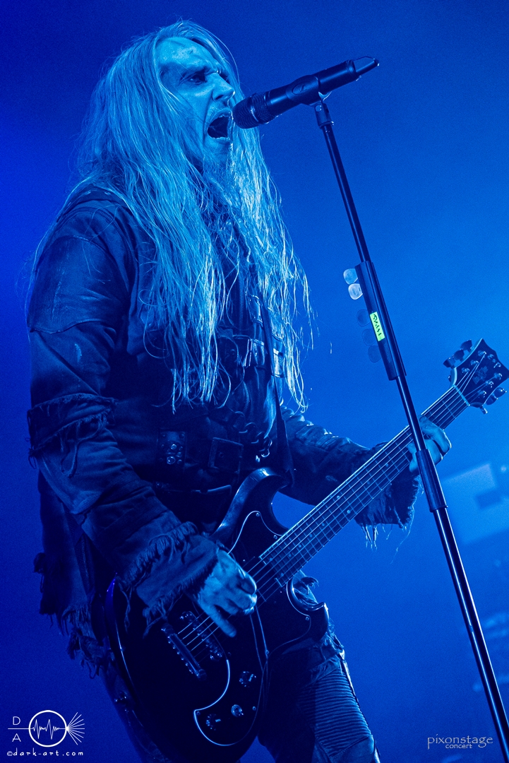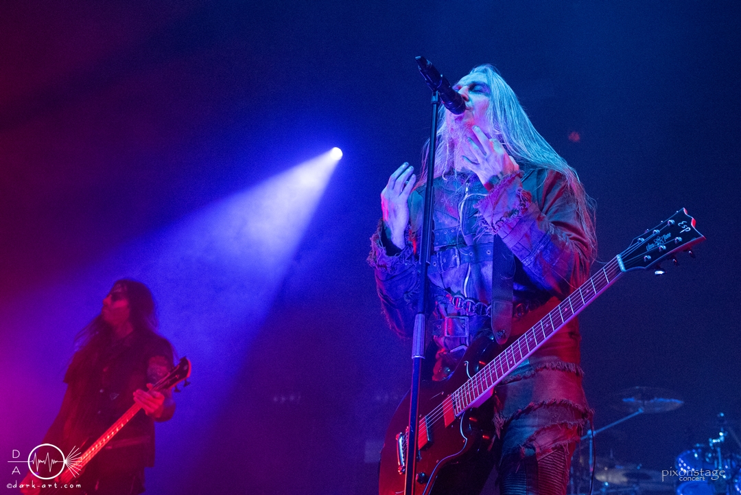 Und dann durften endlich PAIN ran. Nachdem auf der LED-Leinwand ein kurzer Einspieler gezeigt wurde, in dem der Painhead, das Maskottchen der Band, den Schriftzug mit dem Hammer zertrümmert, kamen die vier Musiker auf die Bühne. Dieser putzige Geselle sollte uns auch im Laufe der Show noch mehrmals begegnen. Was dann folgte, war ein munterer Querschnitt durch die Diskografie der Truppe, rund um Hypocrisy-Mastermind Peter Tägtgren. Angefangen bei Let me out und The Great Pretender von dem Werk You Only Live Twice, bis hin zu Monkey Buisness. Und das ganze immer stimmig untermalt von einer fantastischen Lichtshow, welche perfekt auf die Songs getimt war, genauso wie der dezent, aber gezielt, eingesetzte Nebel. Genau richtig dosiert. Auch war das Drumkit ein echter Hingucker. Transparente Korpusse, in denen LED-Bänder eingearbeitet waren, welche ebenfalls stimmig zum Rest der Show die Farbe wechselten. Geiles Teil. Vor Call me gab es wieder eine Zwischensequenz mit dem Maskottchen, welches sich eine vermeintliche Frau angelt, welche sich dann aber am Ende als sein Widersacher entpuppt. Fieser Plottwist, wir hatten uns so für den kleinen Kerl gefreut. Kurz nachdem der Song gestartet war, erschien wieder jemand auf der Leinwand. Es war die Comicfigur von Sabaton-Sänger Joakim, welcher fingiert den Track sprengte, während die Band stoppte und so tat, als würden sie darüber diskutieren. Nette Idee, die ganze Geschichte. Als sich die Zeichentrickfigur in einen realen Menschen verwandelte, ging der Song weiter. Fast wären wir dann noch in den Genuss der Telefonnummer von Bassisten Jonathan gekommen, hätte Peter das Ende der Nummer nicht „vergessen“. Zu dem ruhigen Stück Have a Drink on Me nahmen alle auf Barhockern Platz, bis auf Jonathan, welcher auf einer aufgestellten Bierkiste geparkt wurde und sich deswegen veräppeln lassen musste. Kam bestimmt davon, dass er seine Nummer nicht verraten wollte. Bei Same Old Song drehte das Publikum erst richtig auf und sang lauthals mit. Und leider muss auch irgendwann ein PAIN-Konzert zu Ende gehen, aber vorher hauten die vier nochmal ein paar Zugaben raus. Die erste war Party in my Head, nur dass die hier formvollendet auf der Bühne stattfand, mit ein paar Schweden in 80er-Party-Outfits aus Plüsch und einem Peter im Big-Lebowski-Gedächtnis-Bademantel. Fantastisch! Auch On And On und I’m going in schafften es in das Set. Den Abschluss aber läutete Shut your Mouth ein, bei dem auch die Zuschauer nochmal alles gaben. Was für ein Auftritt, mit einer wahnsinnig tollen Lichtshow und gezielten, liebevoll platzierten Einspielern, die entweder eine Geschichte erzählten oder in den nächsten Track überleiteten. Ich freue mich schon, wenn sie hoffentlich bald wieder nach Deutschland kommen!