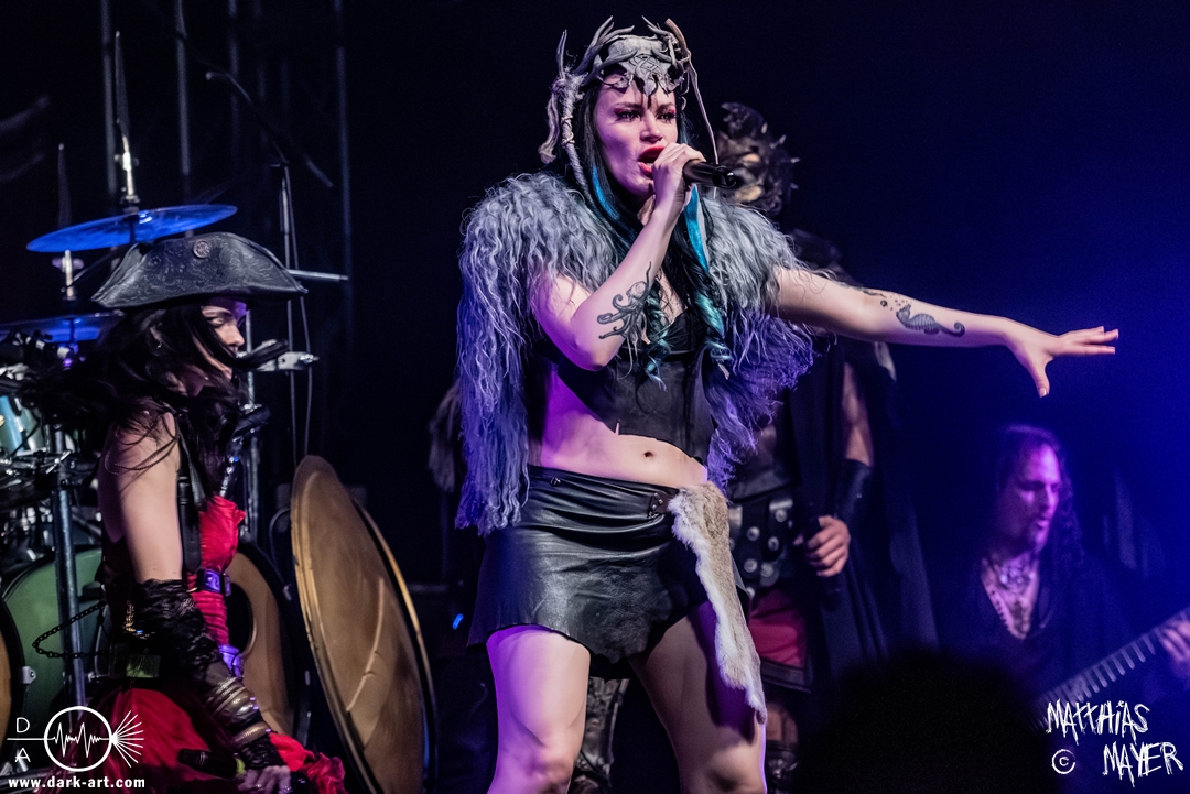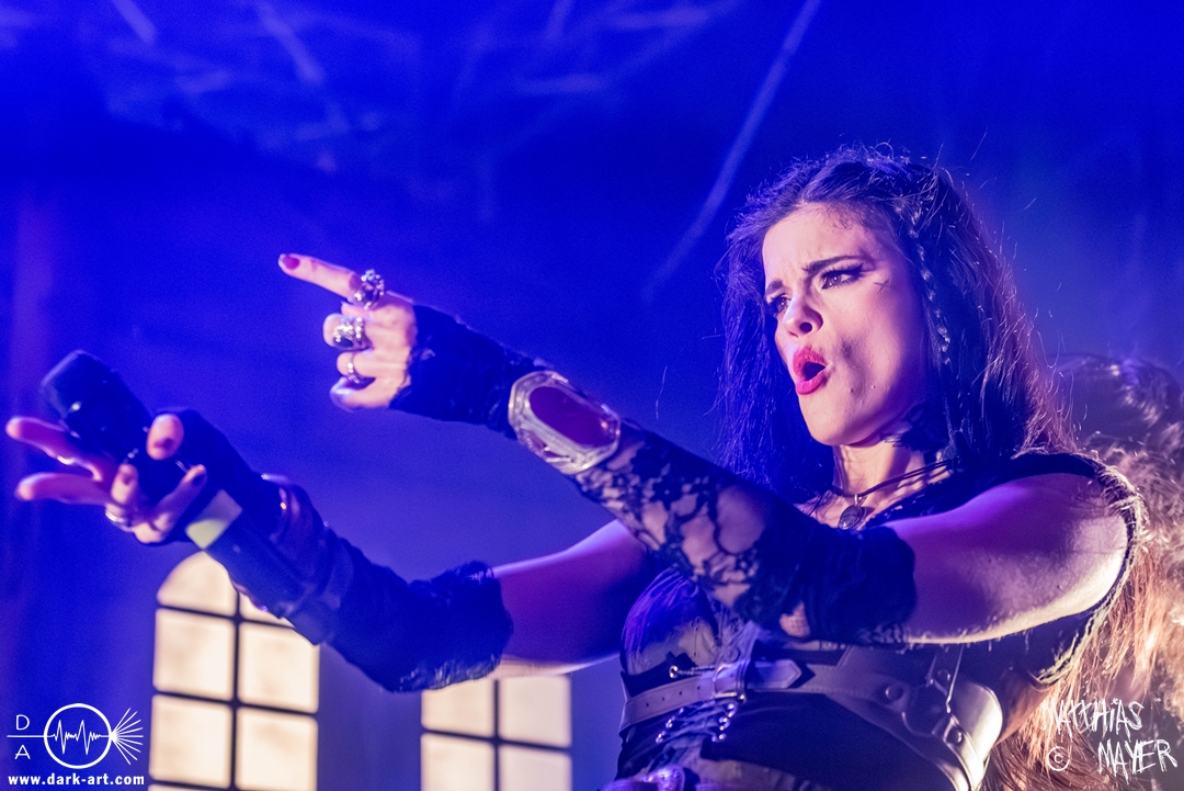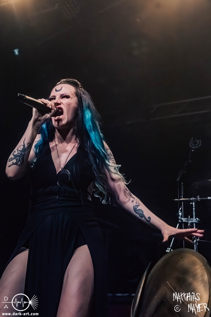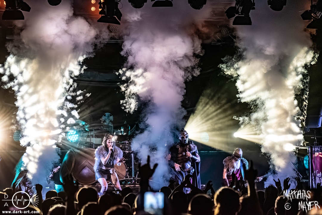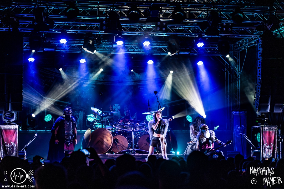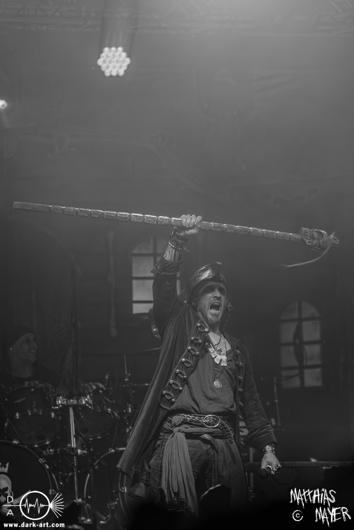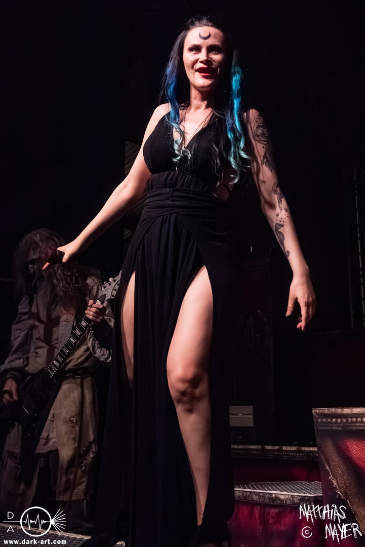 Das Publikum war von Anfang an dabei und feuerte die Band lautstark mit kämpferischen Ahu-Rufen an. Für die Hexe Morgana war es nun an der Zeit, ihre vier königlichen Krieger gesanglich auf der Bühne zu unterstützen und mit Tribune ein spannungsvolles Duett zu bilden. So hatte sie bei Odin’s Sons ihren ersten Einsatz, um danach beim kraftvollen Armageddon die Fäuste in die Luft zu recken und das Publikum weiter anzuheizen. Dabei verstand sie es, wie immer, ihre phantastische Gesangsstimme mit tiefen Growls abzuwechseln. So ist es eine logische Entwicklung, dass im Repertoire der Warkings mit Circle of Witches nun auch ein Lied als Live-Performance ihr ganz allein gewidmet ist.