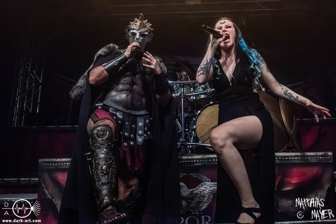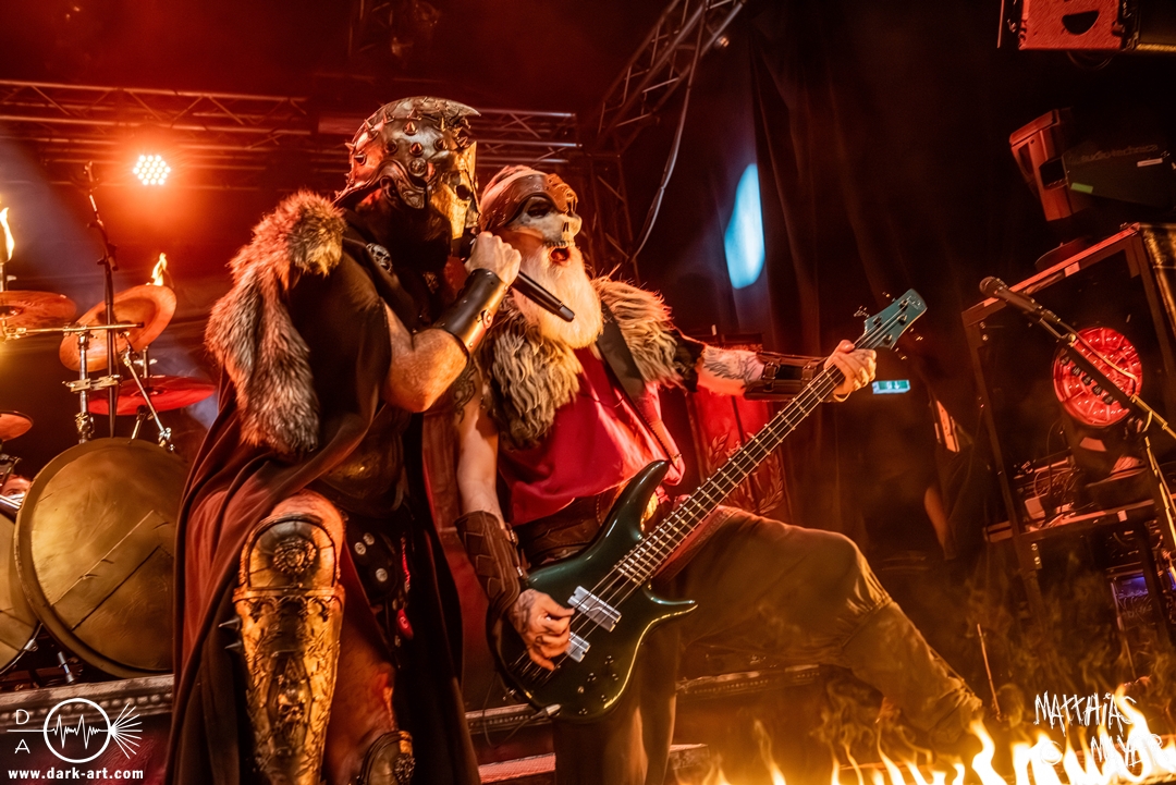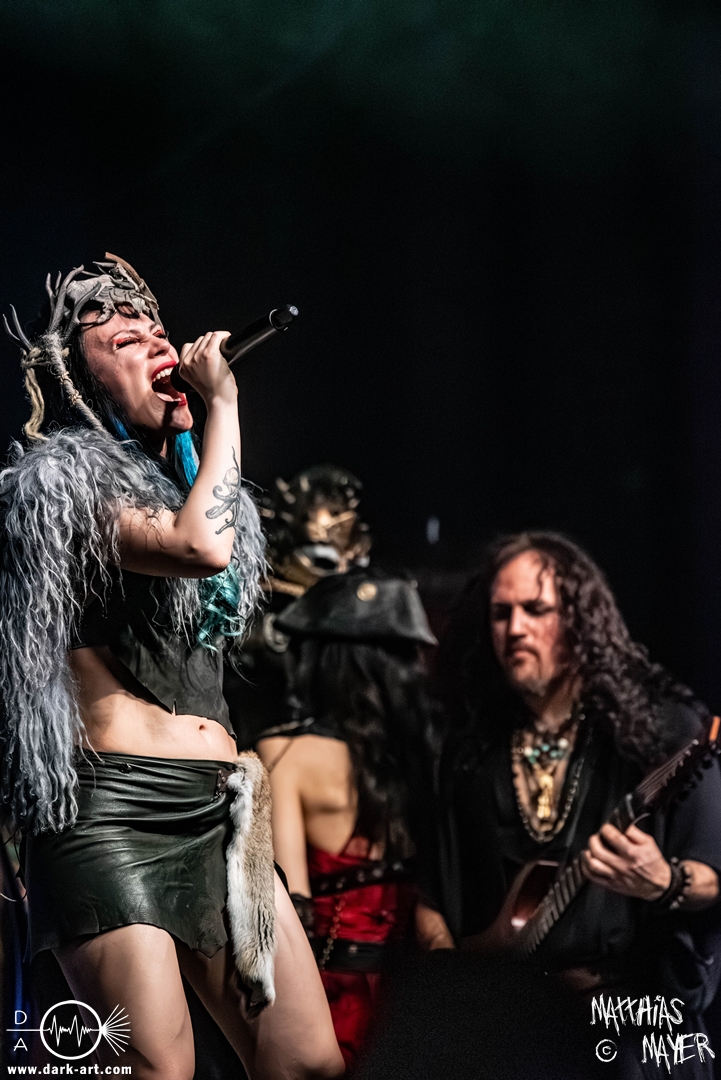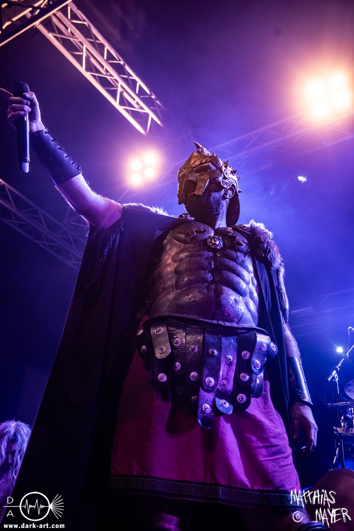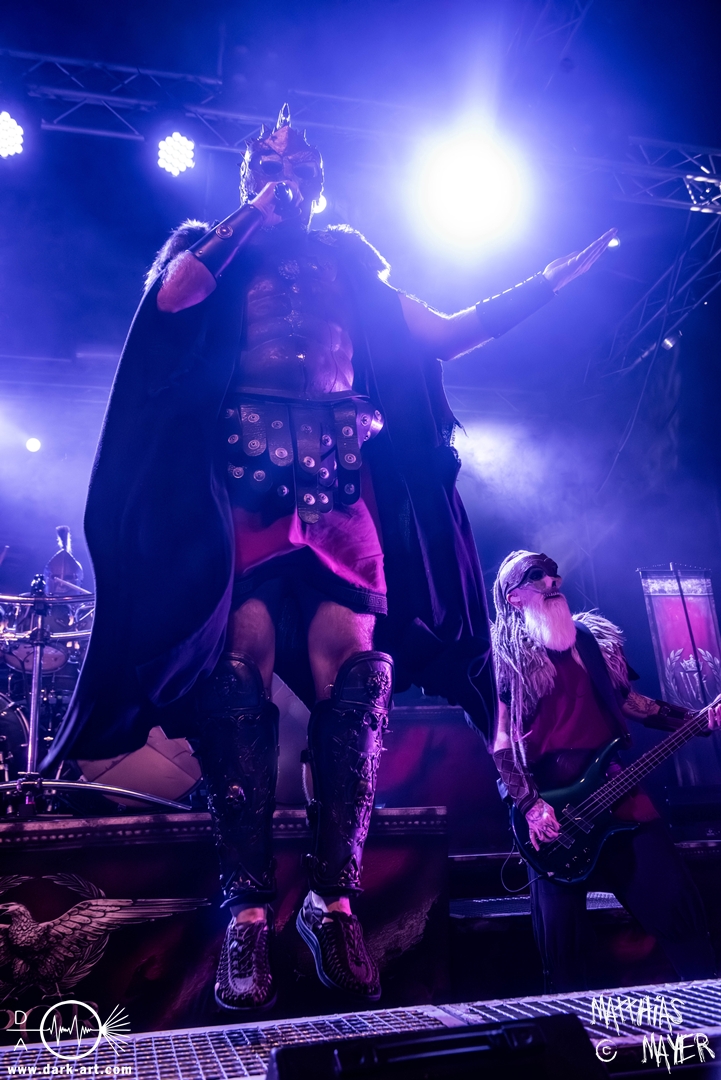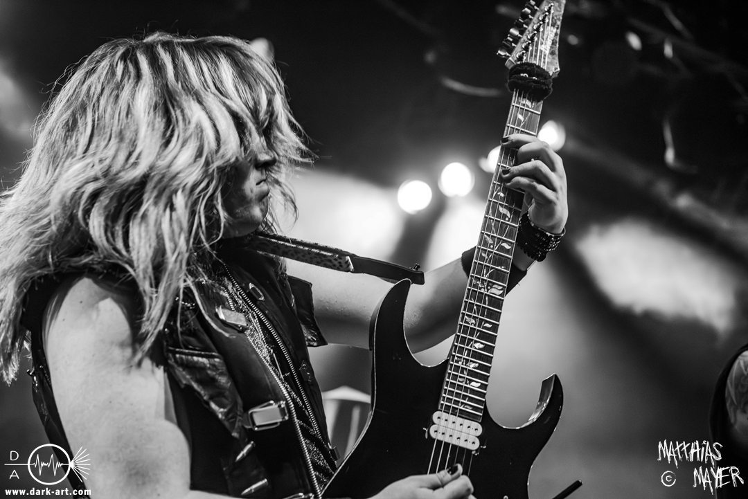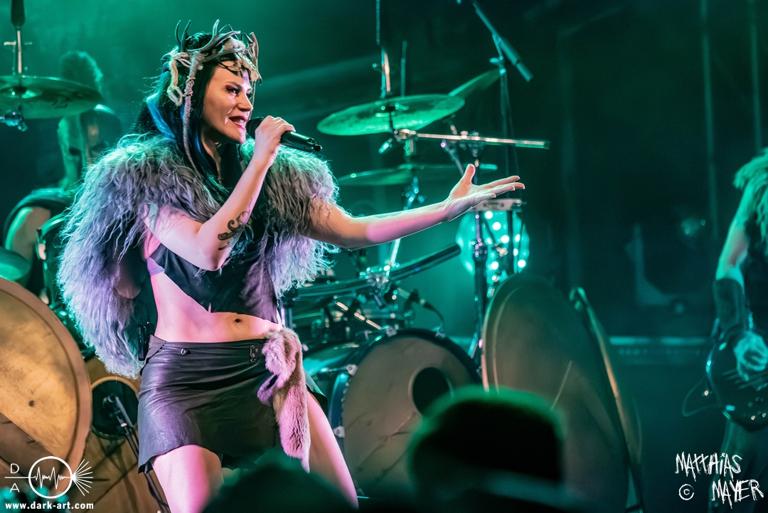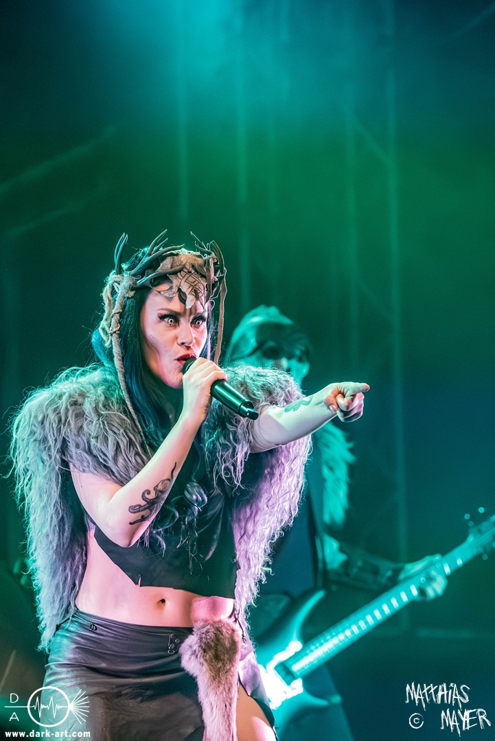 Das Publikum war von Anfang an dabei und feuerte die Band lautstark mit kämpferischen Ahu-Rufen an. Für die Hexe Morgana war es nun an der Zeit, ihre vier königlichen Krieger gesanglich auf der Bühne zu unterstützen und mit Tribune ein spannungsvolles Duett zu bilden. So hatte sie bei Odin’s Sons ihren ersten Einsatz, um danach beim kraftvollen Armageddon die Fäuste in die Luft zu recken und das Publikum weiter anzuheizen. Dabei verstand sie es, wie immer, ihre phantastische Gesangsstimme mit tiefen Growls abzuwechseln. So ist es eine logische Entwicklung, dass im Repertoire der Warkings mit Circle of Witches nun auch ein Lied als Live-Performance ihr ganz allein gewidmet ist.