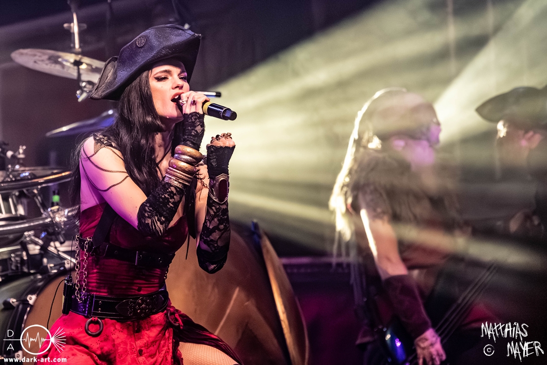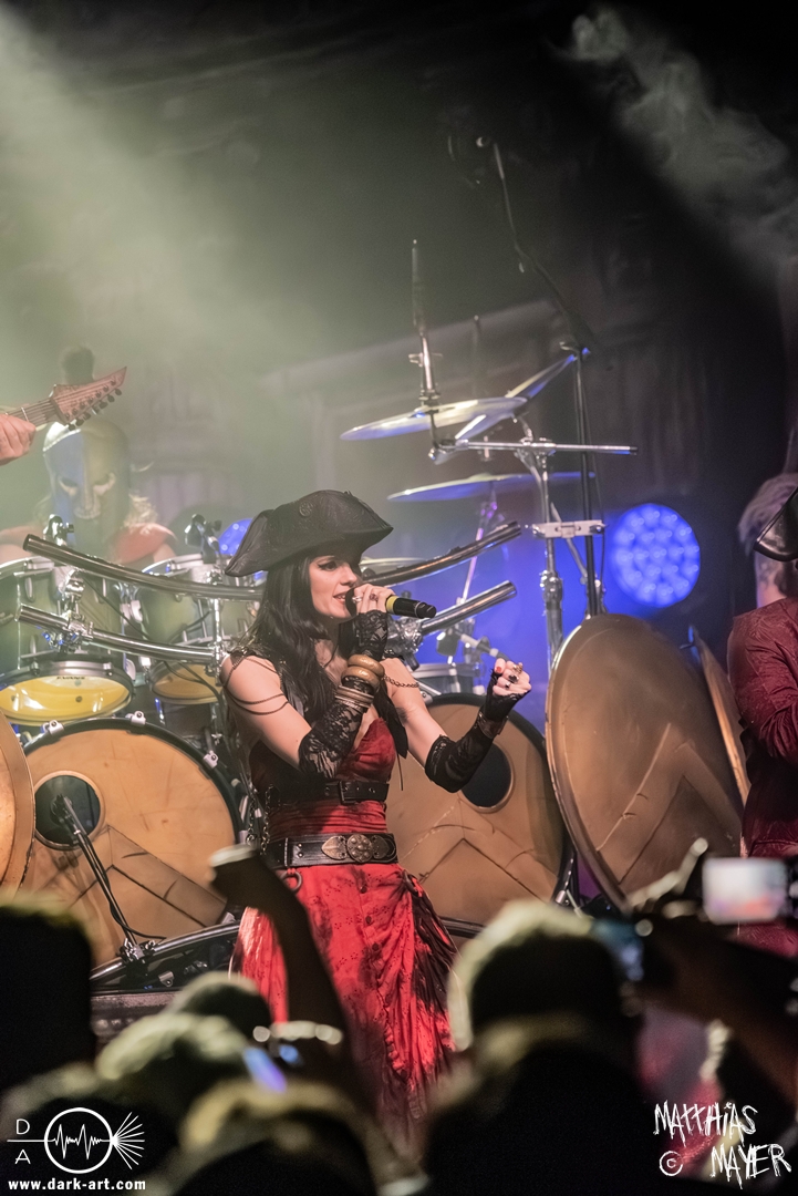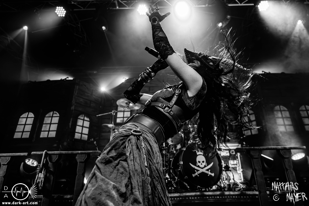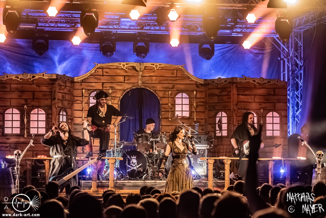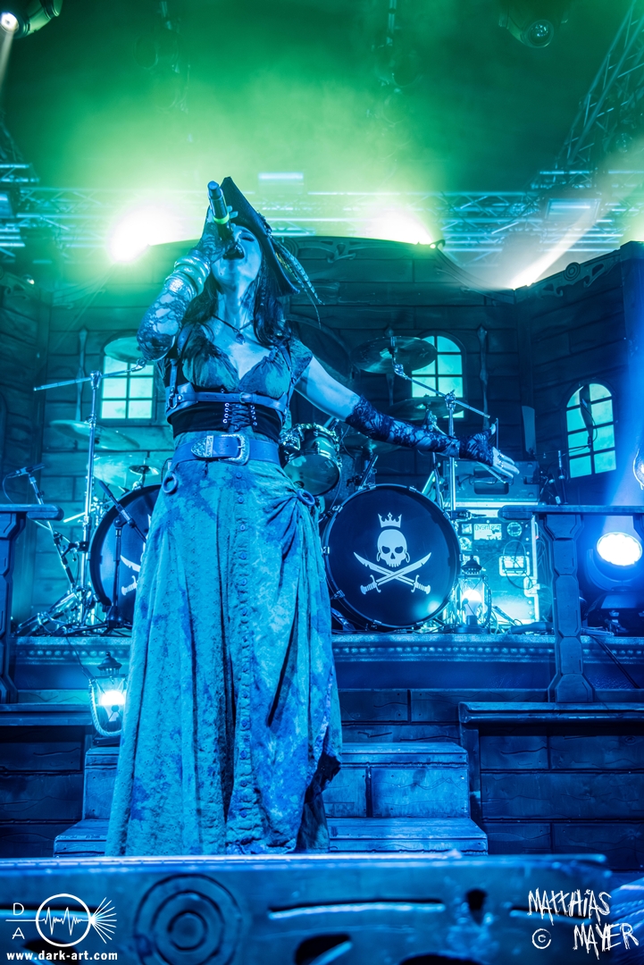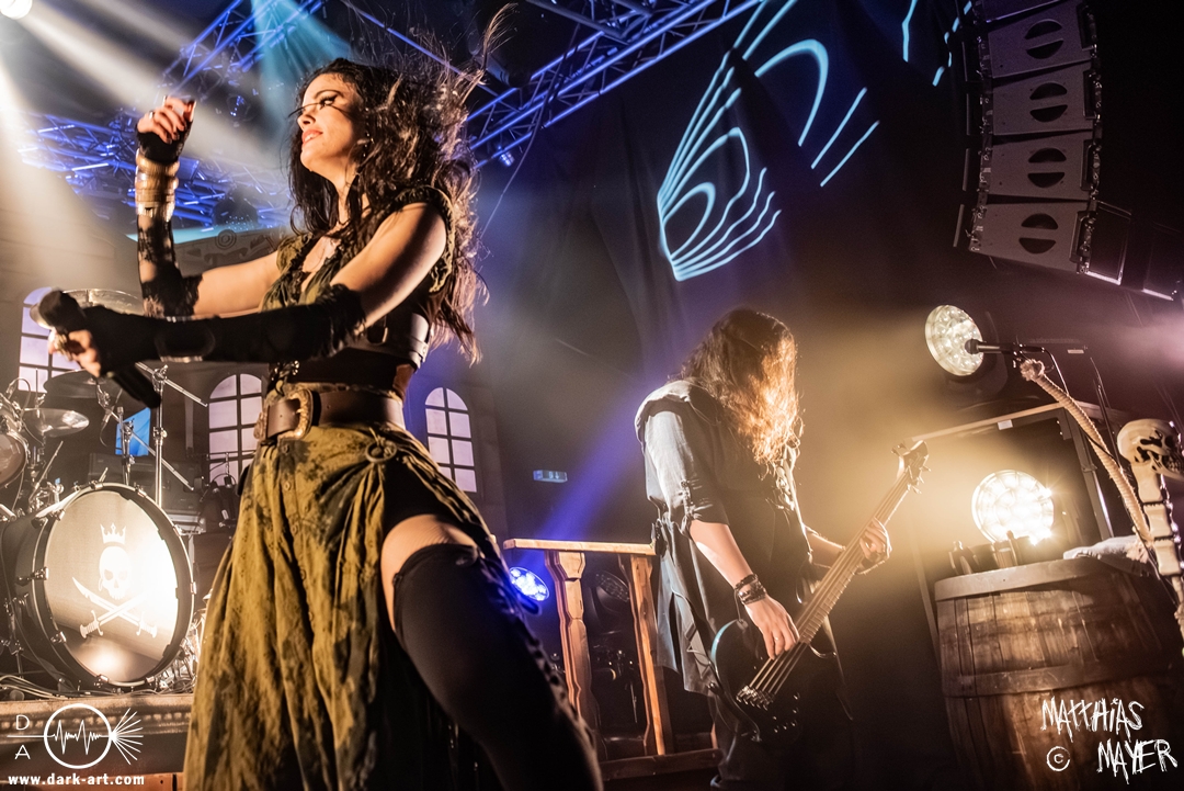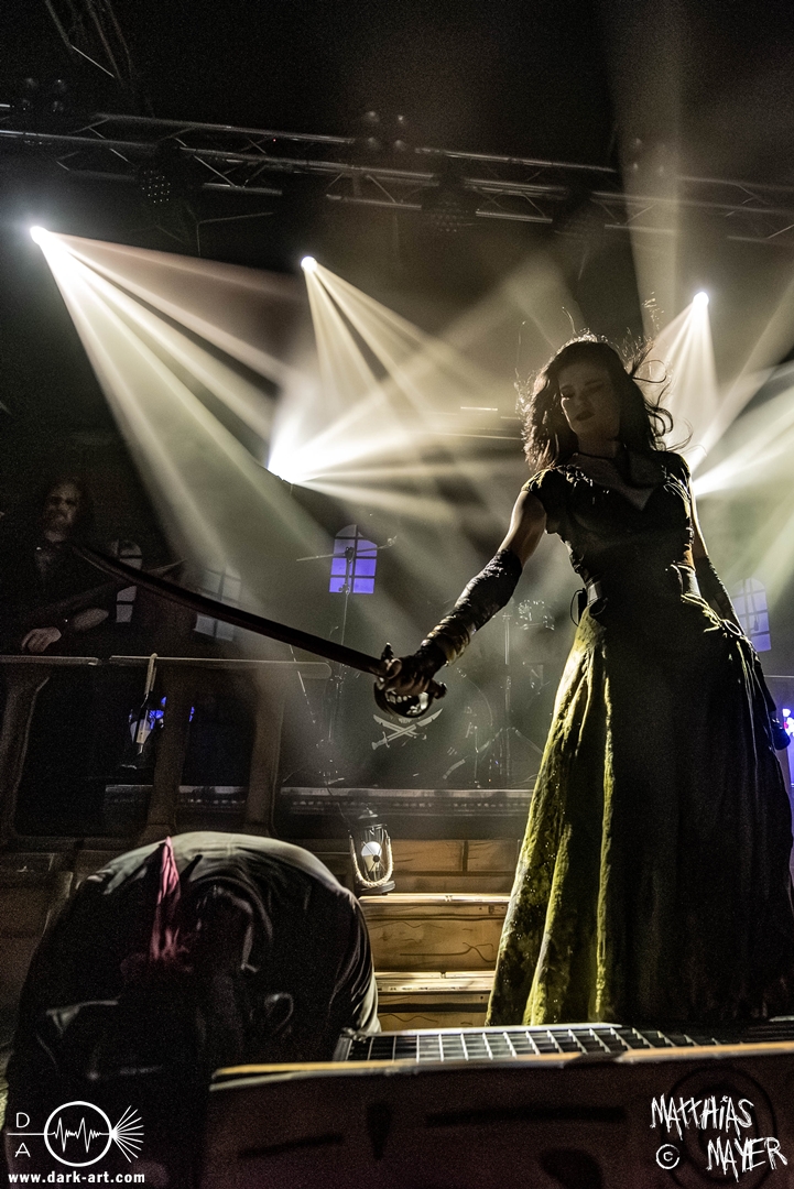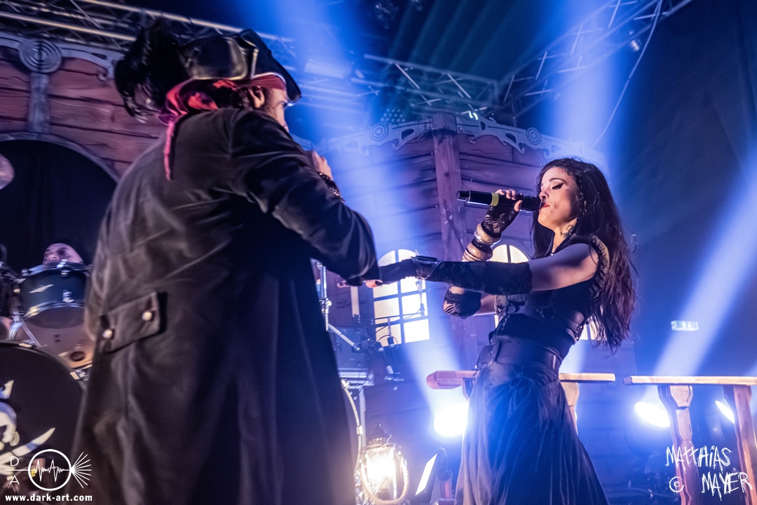 Dunkelheit erfüllte zu Beginn der Show von Visions of Atlantis den Raum, bis Sängerin Clémentine Delauney die Bühne betrat, verhüllt von einem schwarzen Kapuzenmantel, nur beleuchtet von einem Lichtkegel, mit zarten Tönen das erste Lied To those who choose to fight anstimmte. Untermalt von spannungsgeladenen sphärischen Tönen betrat dann Drummer Thomas Caser gefolgt von Gitarrist und Bassist die Bühne um direkt danach das Piratenschiff fast zum Kentern zu bringen, mit ihrer unverkennbaren Mischung aus mitreißenden Gitarrenriffs und kraftvollen Drums. Gleichzeitig legte Clémentine den Kapuzenmantel ab und performte, passend zum Tourmotto, in einem ikonischen Freibeuterkleid nebst passendem Hut das zweite Stück The Land of the Free, was übergangslos zum ersten erfolgte. Dazu fand sich nun auch Sänger Michele ein und die beiden bildeten ein Gesangsduo in ihrem gewohnt harmonischen Zusammenspiel, umgeben vom typischen melodischen Klangrahmen der VOA Lieder.