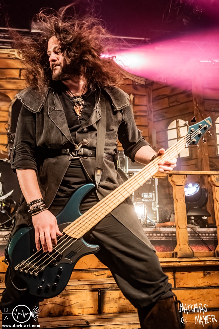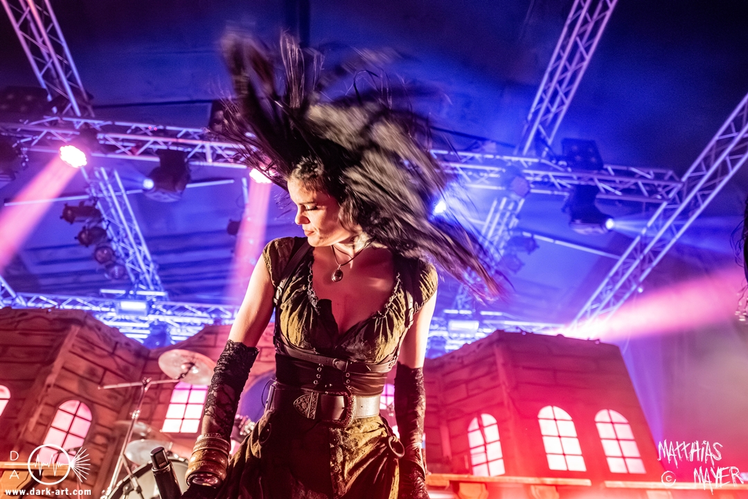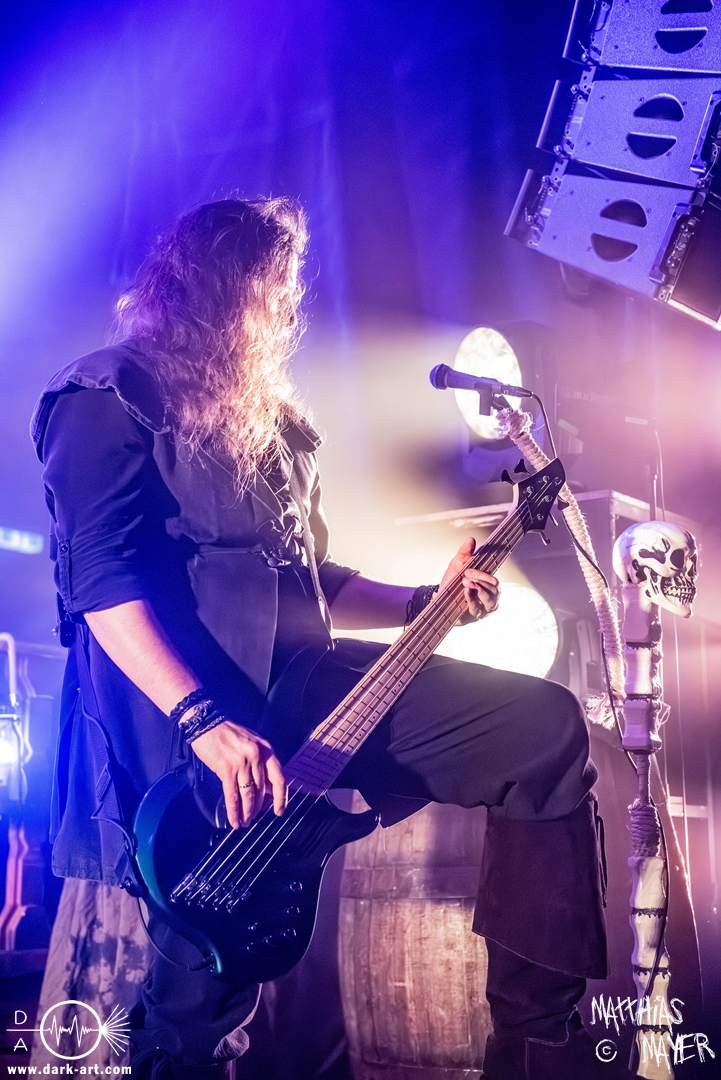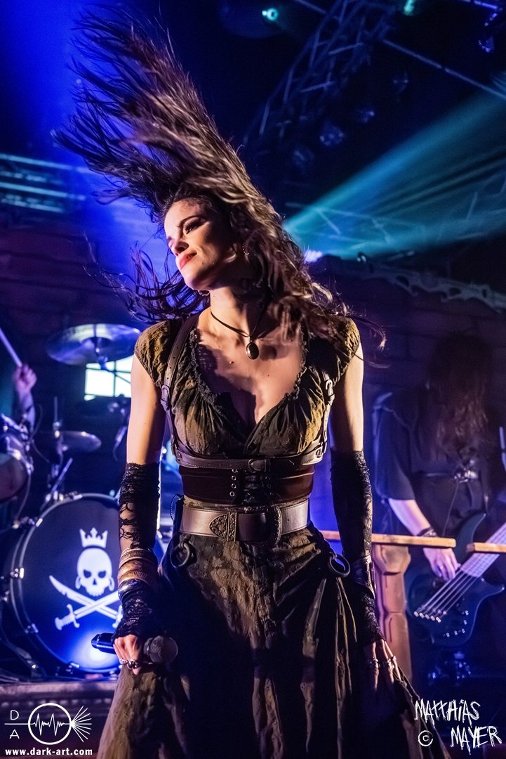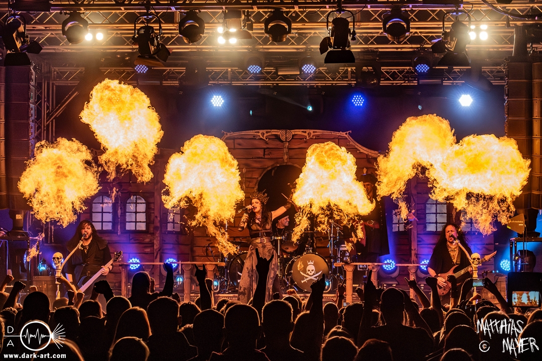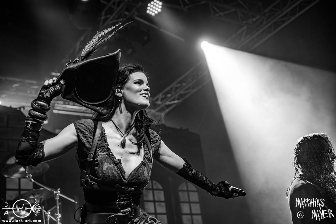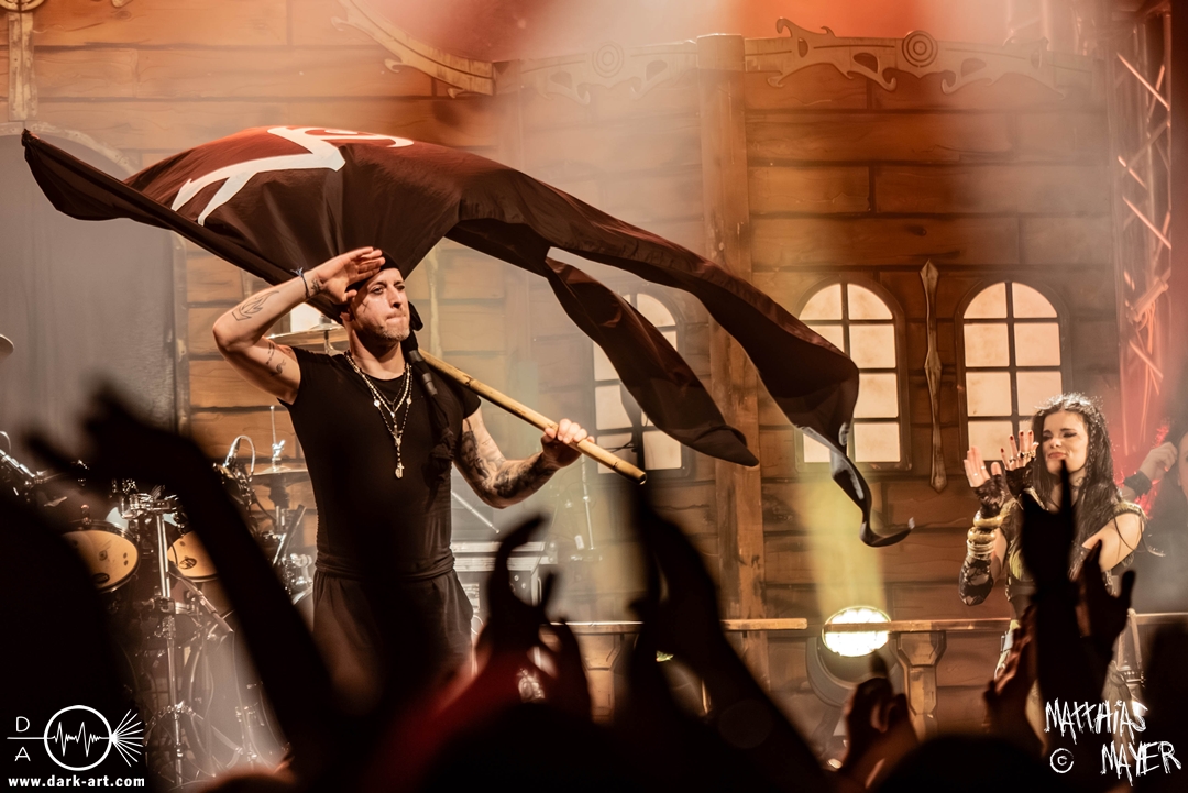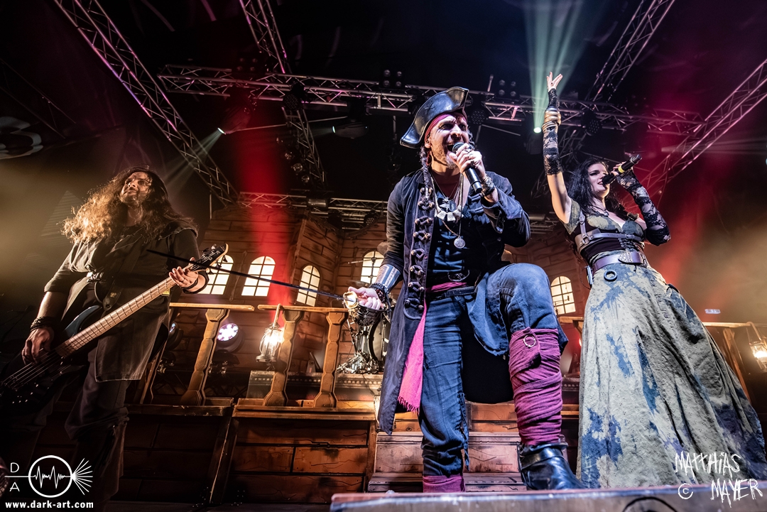 Dunkelheit erfüllte zu Beginn der Show von Visions of Atlantis den Raum, bis Sängerin Clémentine Delauney die Bühne betrat, verhüllt von einem schwarzen Kapuzenmantel, nur beleuchtet von einem Lichtkegel, mit zarten Tönen das erste Lied To those who choose to fight anstimmte. Untermalt von spannungsgeladenen sphärischen Tönen betrat dann Drummer Thomas Caser gefolgt von Gitarrist und Bassist die Bühne um direkt danach das Piratenschiff fast zum Kentern zu bringen, mit ihrer unverkennbaren Mischung aus mitreißenden Gitarrenriffs und kraftvollen Drums. Gleichzeitig legte Clémentine den Kapuzenmantel ab und performte, passend zum Tourmotto, in einem ikonischen Freibeuterkleid nebst passendem Hut das zweite Stück The Land of the Free, was übergangslos zum ersten erfolgte. Dazu fand sich nun auch Sänger Michele ein und die beiden bildeten ein Gesangsduo in ihrem gewohnt harmonischen Zusammenspiel, umgeben vom typischen melodischen Klangrahmen der VOA Lieder.