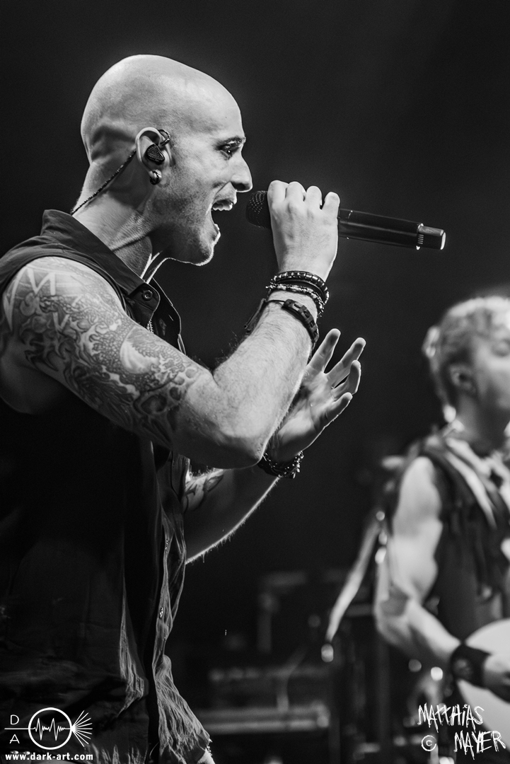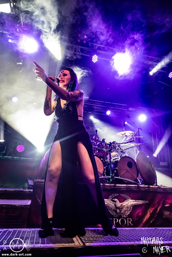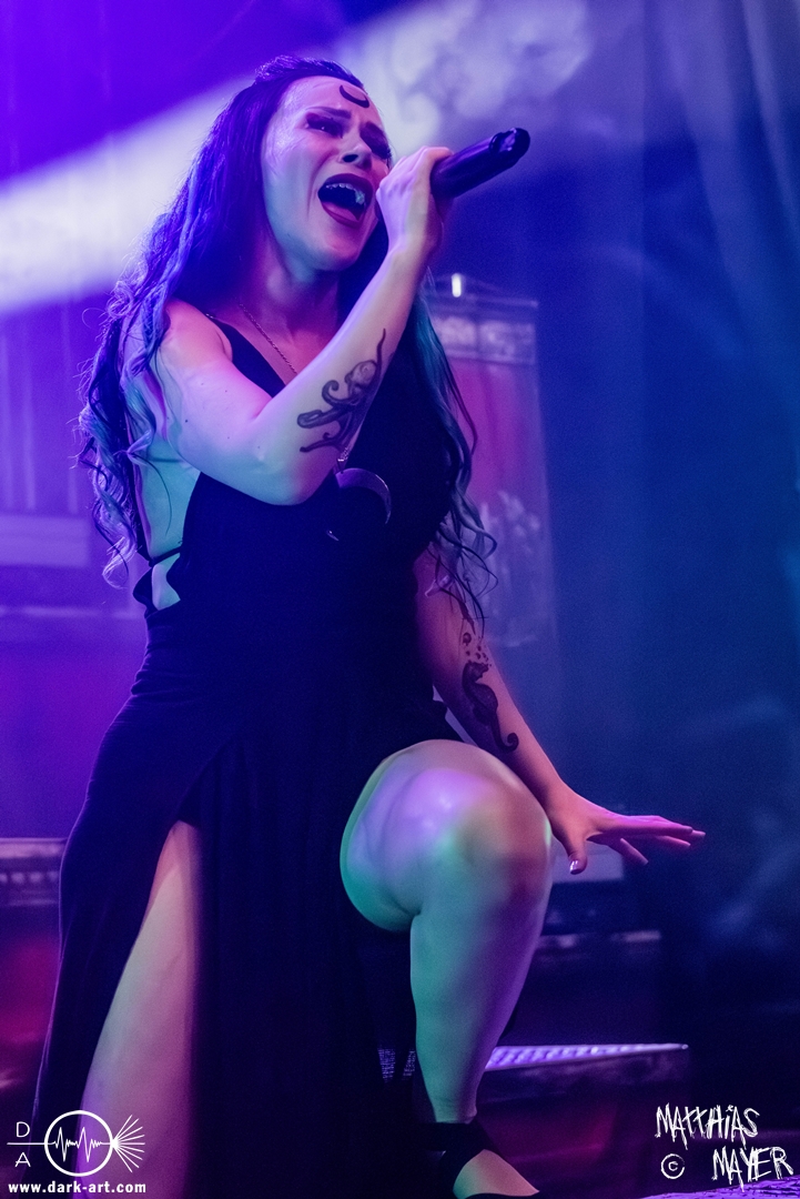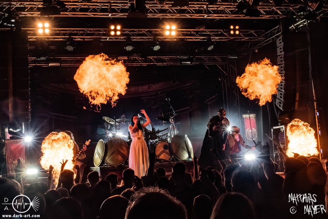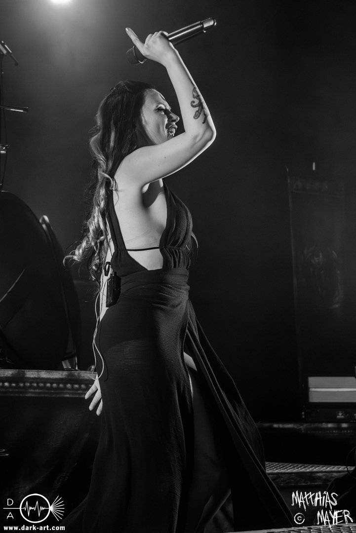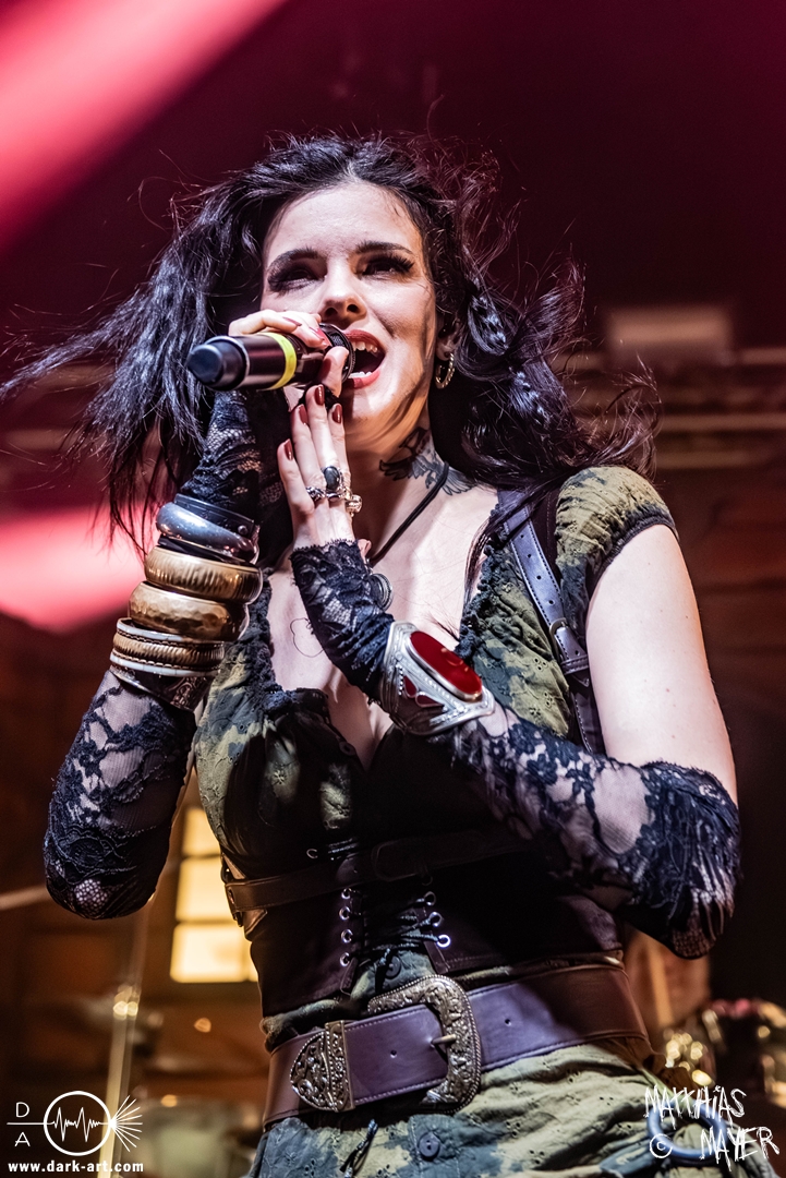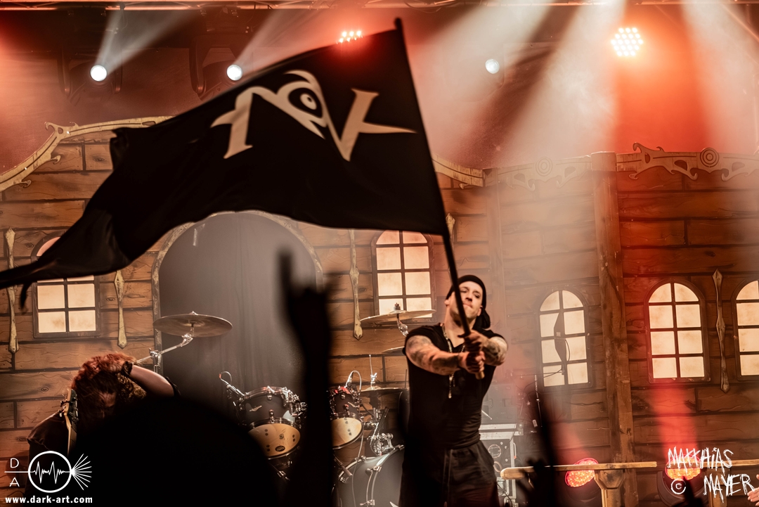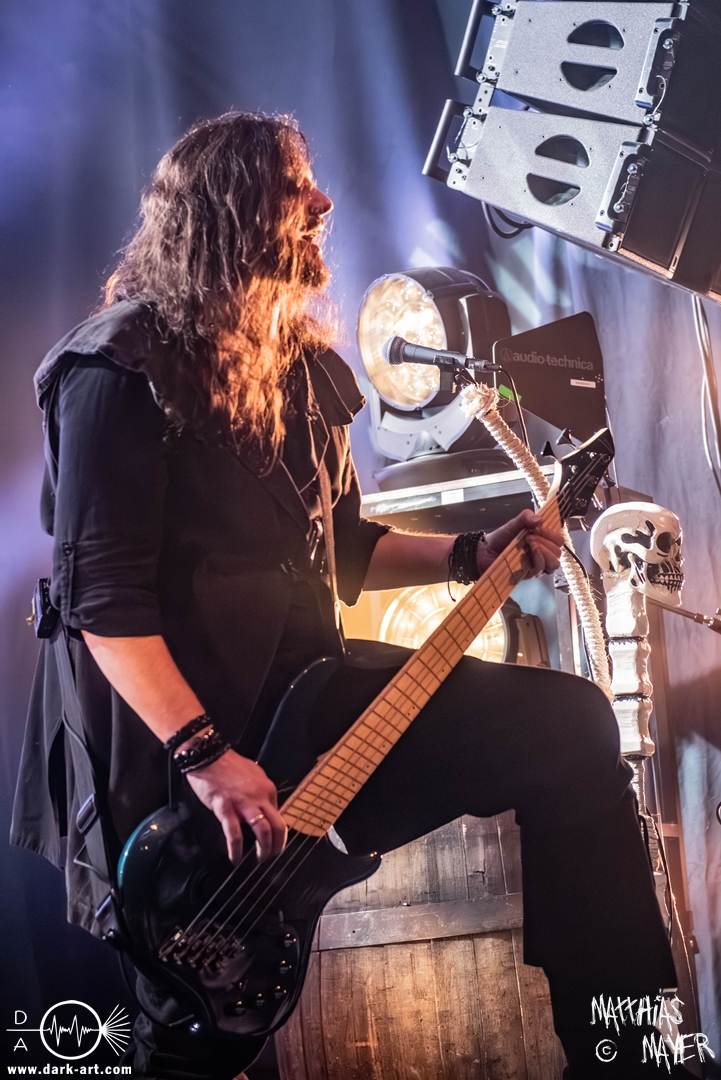 Dunkelheit erfüllte zu Beginn der Show von Visions of Atlantis den Raum, bis Sängerin Clémentine Delauney die Bühne betrat, verhüllt von einem schwarzen Kapuzenmantel, nur beleuchtet von einem Lichtkegel, mit zarten Tönen das erste Lied To those who choose to fight anstimmte. Untermalt von spannungsgeladenen sphärischen Tönen betrat dann Drummer Thomas Caser gefolgt von Gitarrist und Bassist die Bühne um direkt danach das Piratenschiff fast zum Kentern zu bringen, mit ihrer unverkennbaren Mischung aus mitreißenden Gitarrenriffs und kraftvollen Drums. Gleichzeitig legte Clémentine den Kapuzenmantel ab und performte, passend zum Tourmotto, in einem ikonischen Freibeuterkleid nebst passendem Hut das zweite Stück The Land of the Free, was übergangslos zum ersten erfolgte. Dazu fand sich nun auch Sänger Michele ein und die beiden bildeten ein Gesangsduo in ihrem gewohnt harmonischen Zusammenspiel, umgeben vom typischen melodischen Klangrahmen der VOA Lieder.