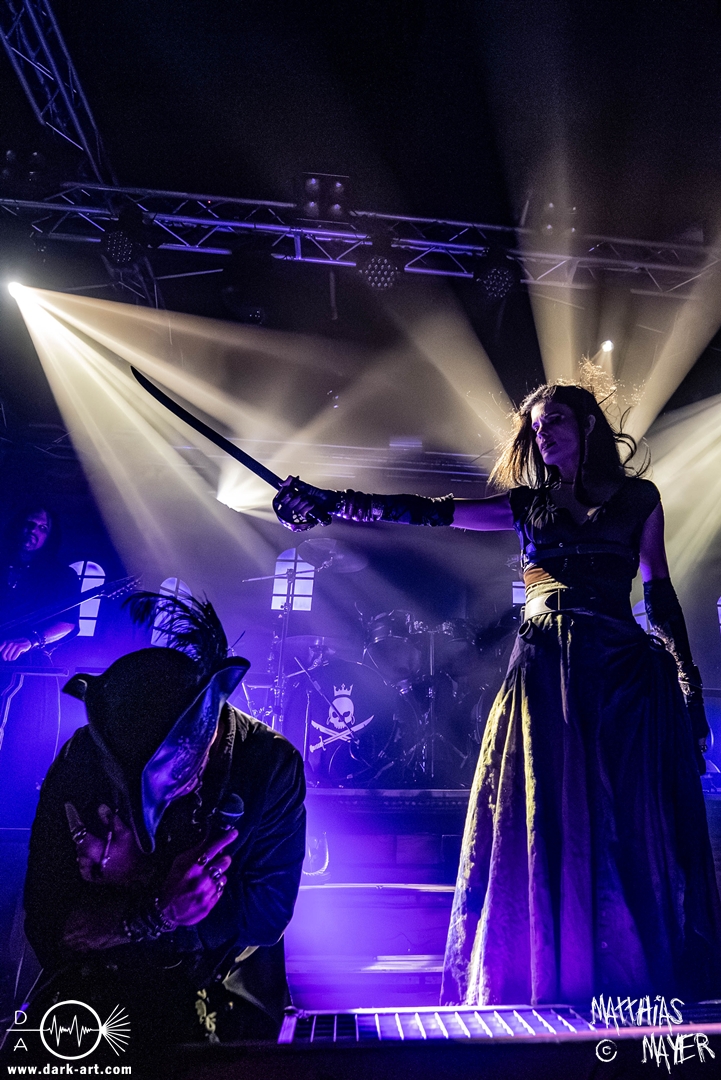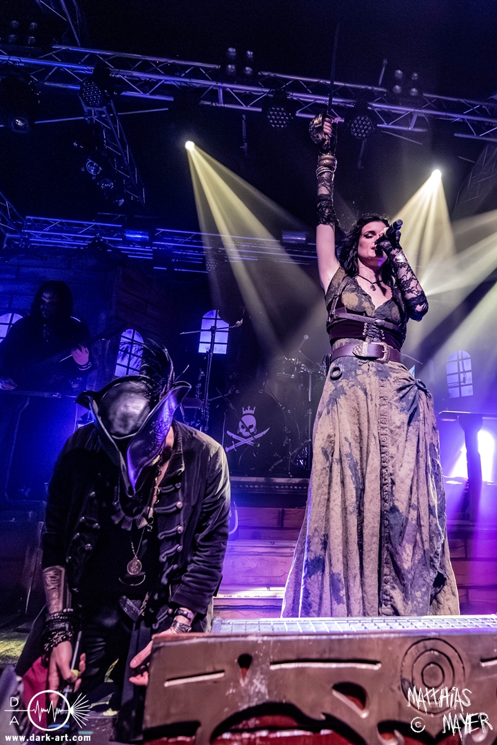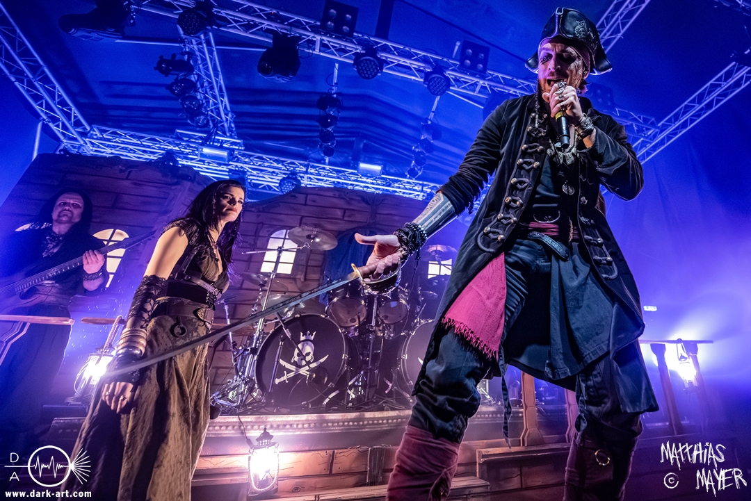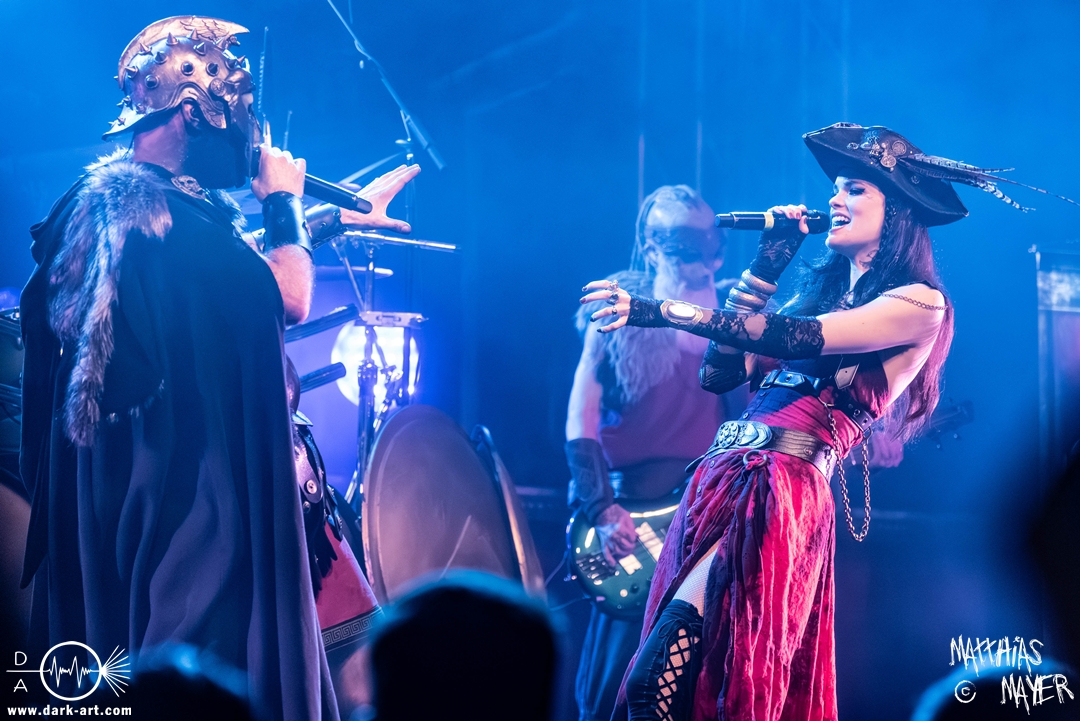 Schließlich wurde es Zeit, dem Tourmotto vollends gerecht zu werden, die Ahu- und Ahoi-Rufe zu vereinen und gemeinsam mit der Piratenschar auf der Bühne zu stehen. Tribune begrüßte Clémentine charmant mit „my Queen of the sea“ um anschließend auch den „King of the pirates“ auf die Bühne zu holen. Pirates and Kings, das gemeinsame Stück der beiden Co-Headliner, war ein Genuss für Auge und Ohren, denn sowohl die aufwendig gestalteten Kostüme als auch die vier Singstimmen verschmolzen zu einer fantastischen Symbiose aus Symphonic- und Power-Metal, die neben den Gitarren der Warkings zusätzlich von der E-Gitarre von Christian Douscha (VOA) unterstützt wurde.