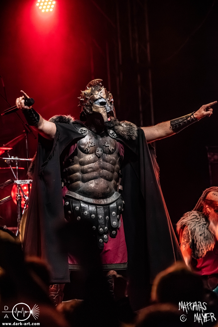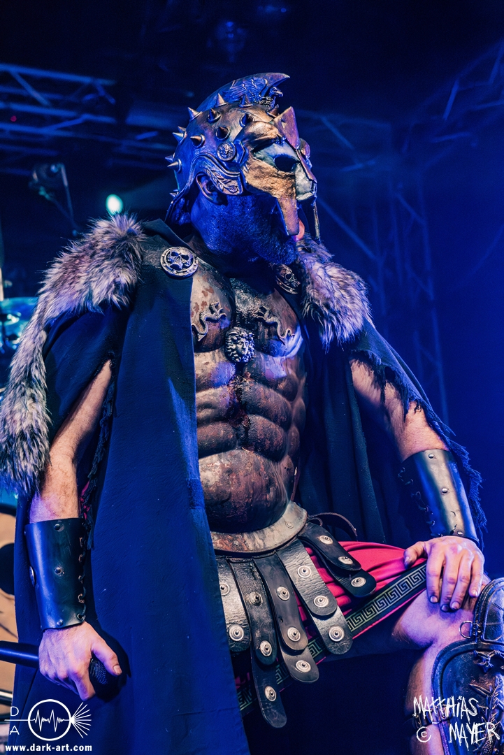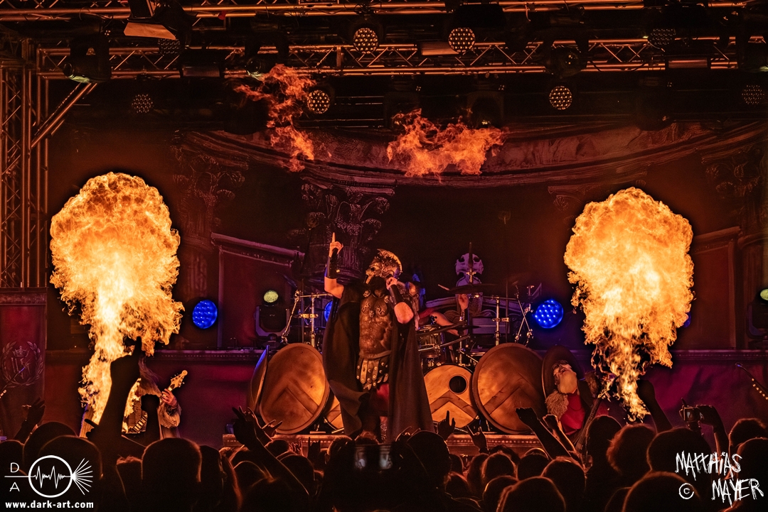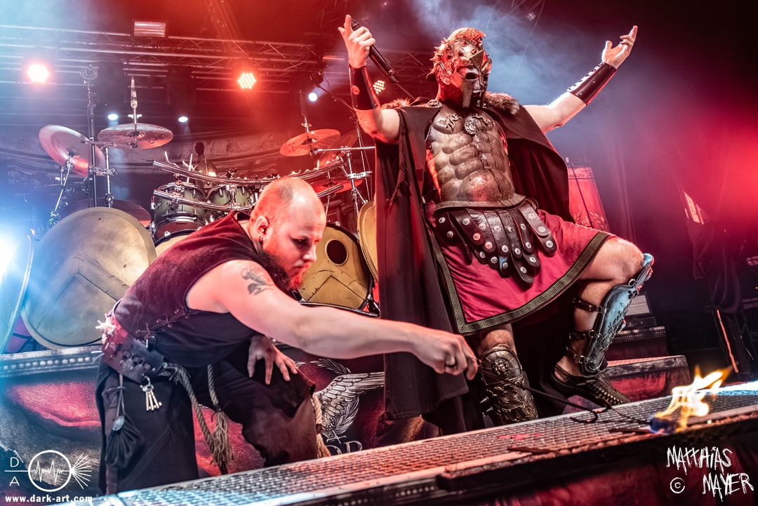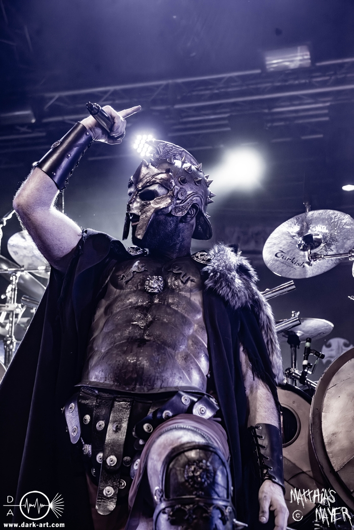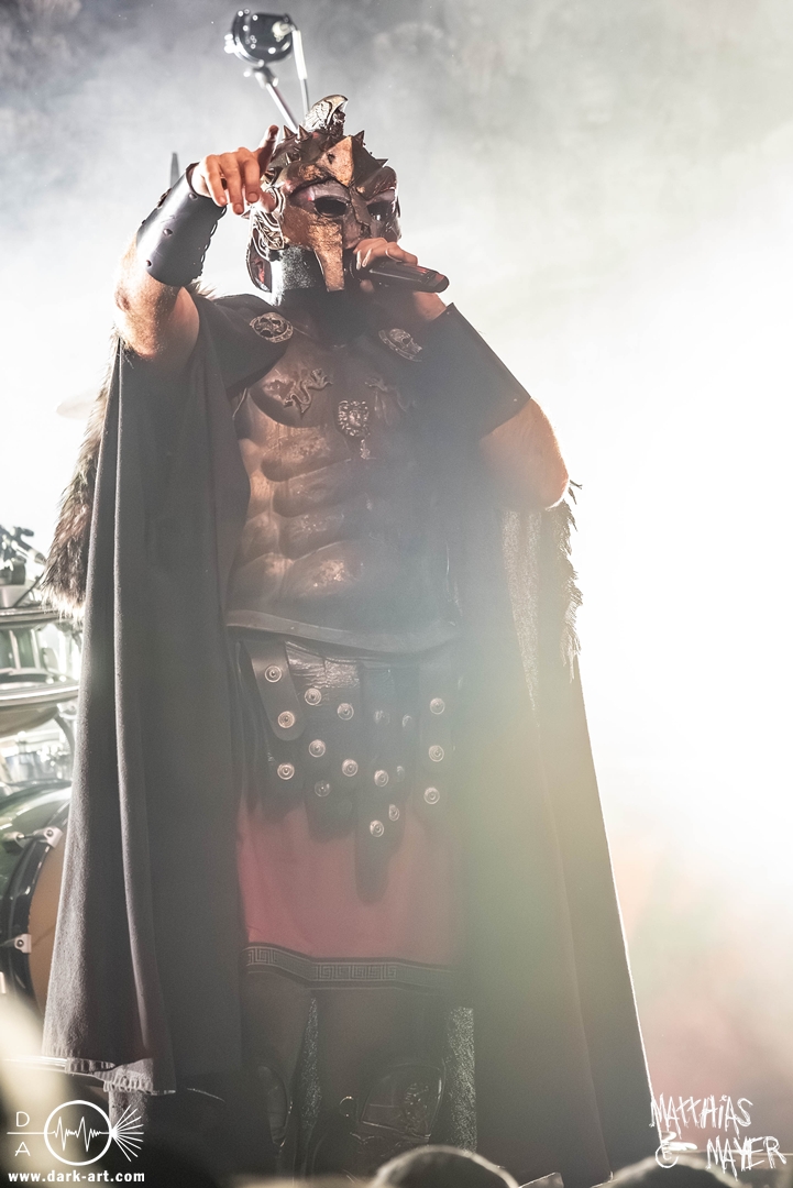 Passend unterlegt vom Intro Warriors of the World von Manowar betraten nachfolgend, angekündigt von einer Stimme aus dem Off, nacheinander Spartan, Viking, Crusader und schließlich Tribune die Bühne. Nun wurde es heiß, Flammen schossen in die Höhe und die erste Reihe glich einem Hähnchengrill. Dann wurde es laut und die Warkings fielen mit ihrer geballten Powermetal-Energie in Geiselwindus ein.