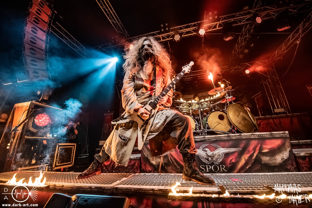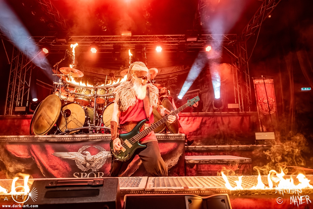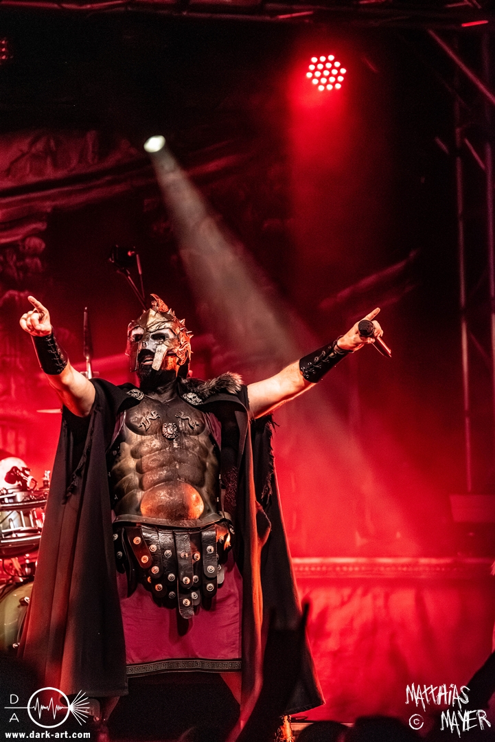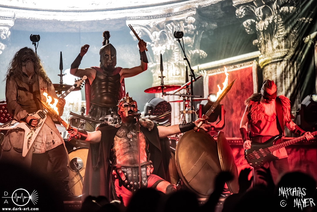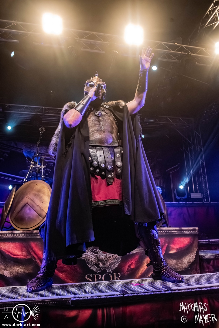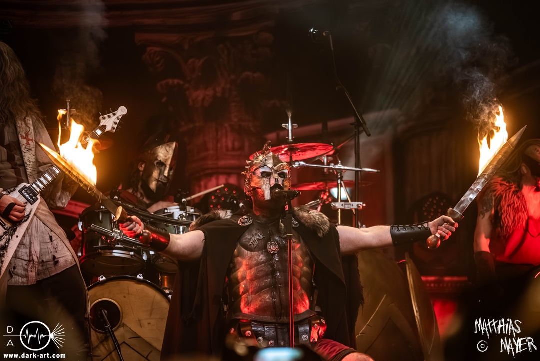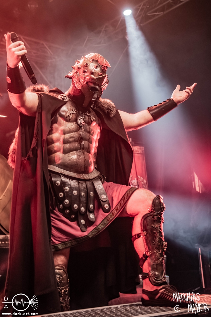 Passend unterlegt vom Intro Warriors of the World von Manowar betraten nachfolgend, angekündigt von einer Stimme aus dem Off, nacheinander Spartan, Viking, Crusader und schließlich Tribune die Bühne. Nun wurde es heiß, Flammen schossen in die Höhe und die erste Reihe glich einem Hähnchengrill. Dann wurde es laut und die Warkings fielen mit ihrer geballten Powermetal-Energie in Geiselwindus ein.