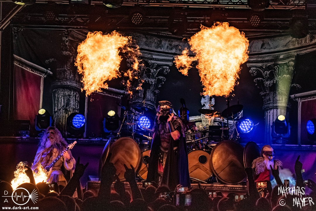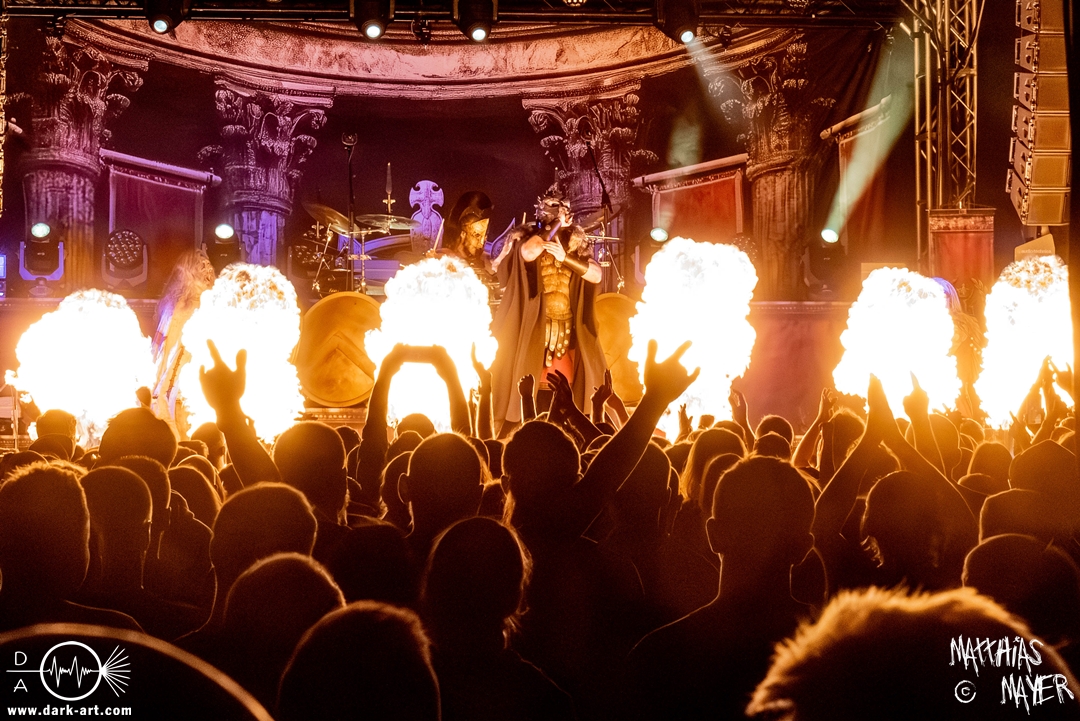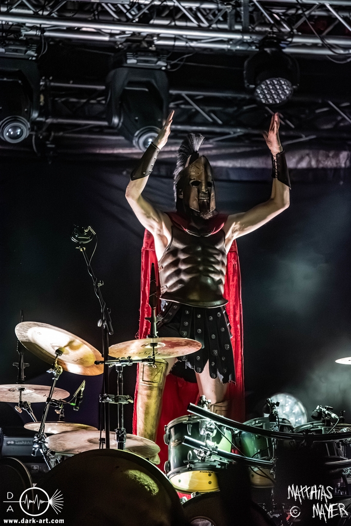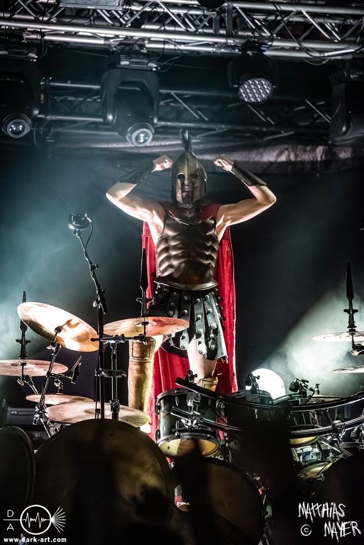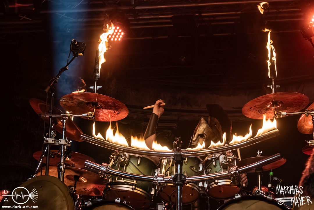 Zwischenzeitlich schossen immer wieder die Flammen aus den Flammenwerfern in die Höhe und der Gargrad der ersten Reihe erhöhte sich konstant. Ich war daher froh, Deckung in der zweiten Reihe gefunden zu haben. So war es passend, dass Hephaistos höchstpersönlich zum gleichnamigen Lied, das Schlagzeug entzündete, bzw. die daran angebrachten Fackeln.