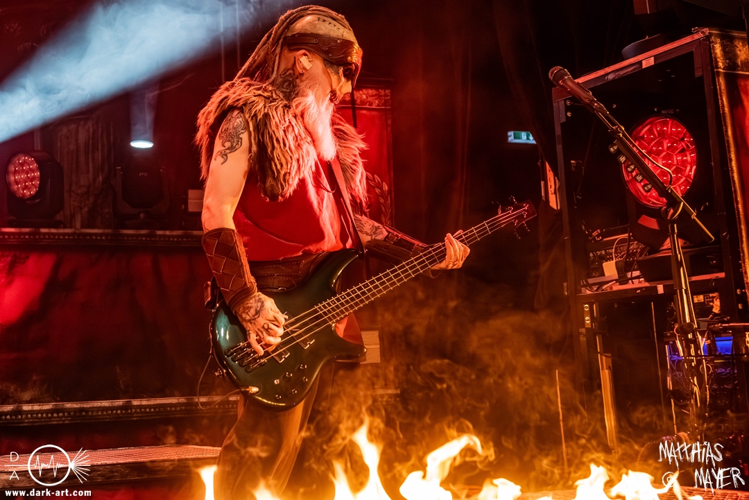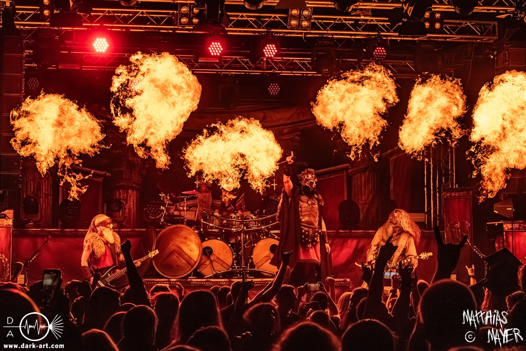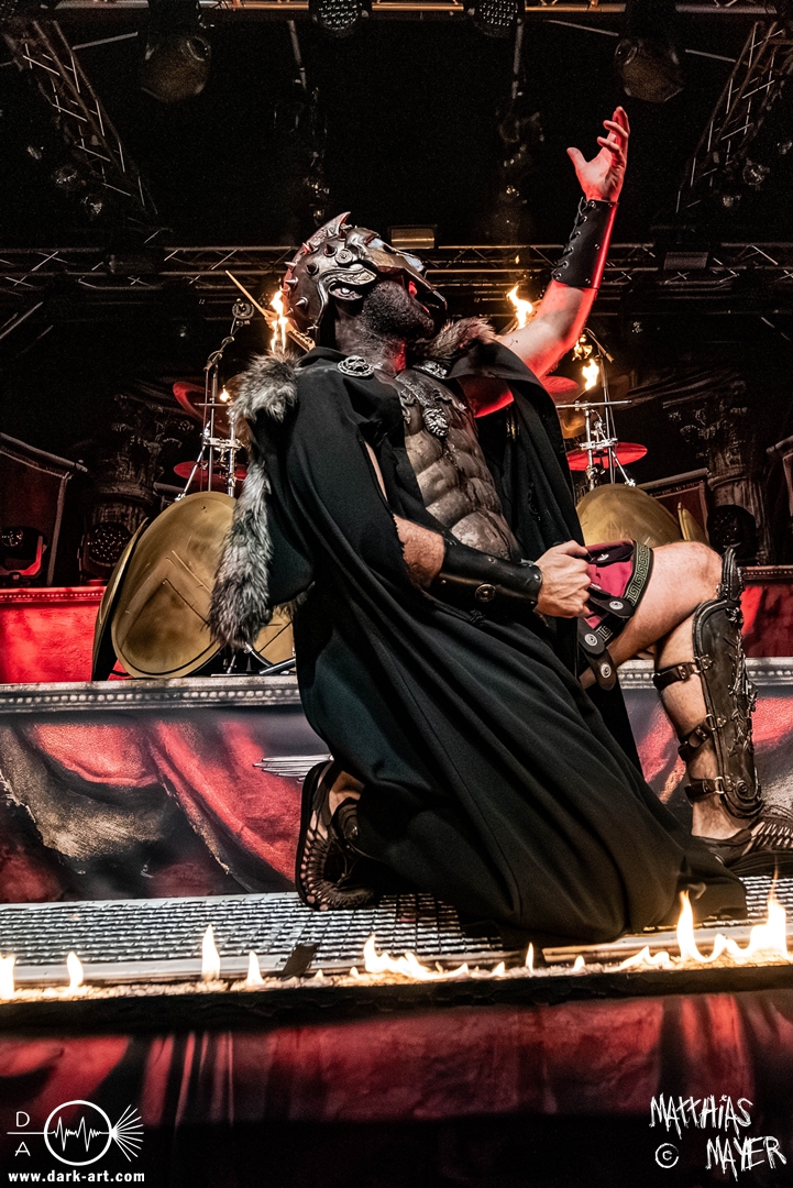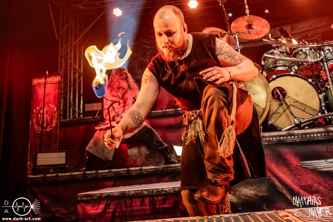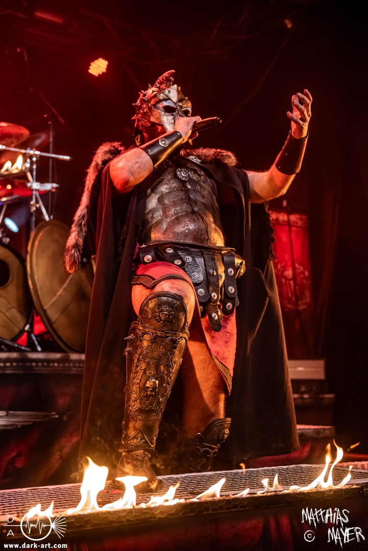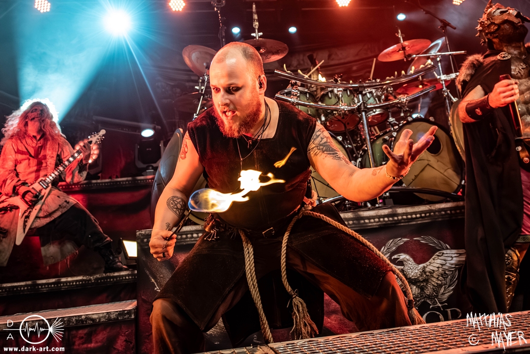Zwischenzeitlich schossen immer wieder die Flammen aus den Flammenwerfern in die Höhe und der Gargrad der ersten Reihe erhöhte sich konstant. Ich war daher froh, Deckung in der zweiten Reihe gefunden zu haben. So war es passend, dass Hephaistos höchstpersönlich zum gleichnamigen Lied, das Schlagzeug entzündete, bzw. die daran angebrachten Fackeln.