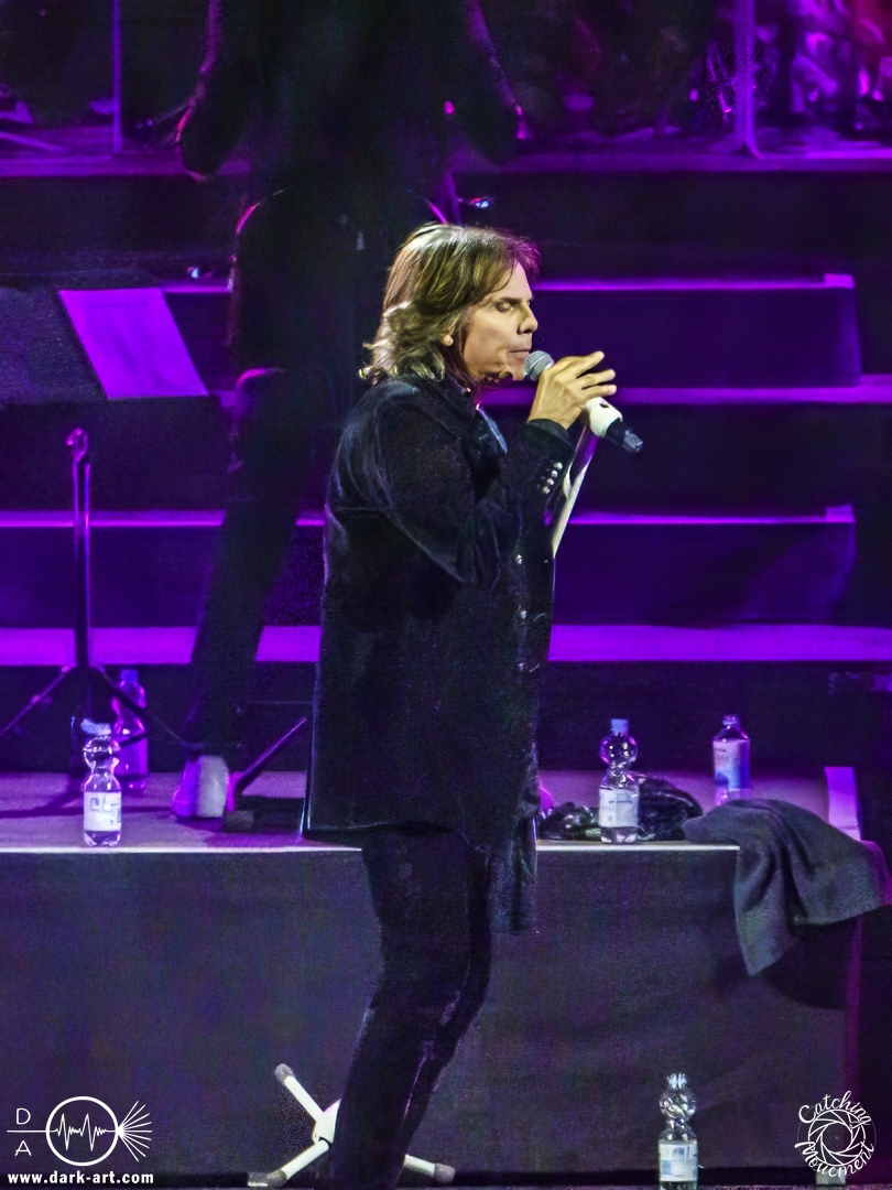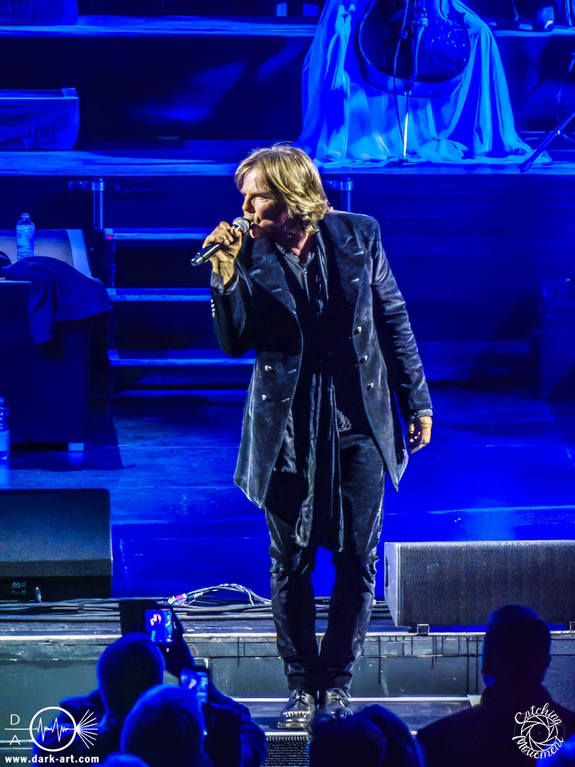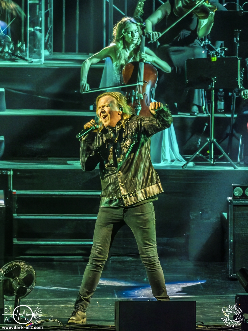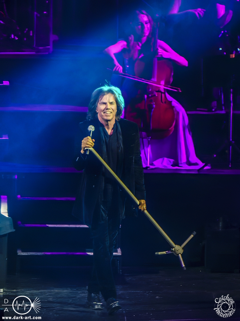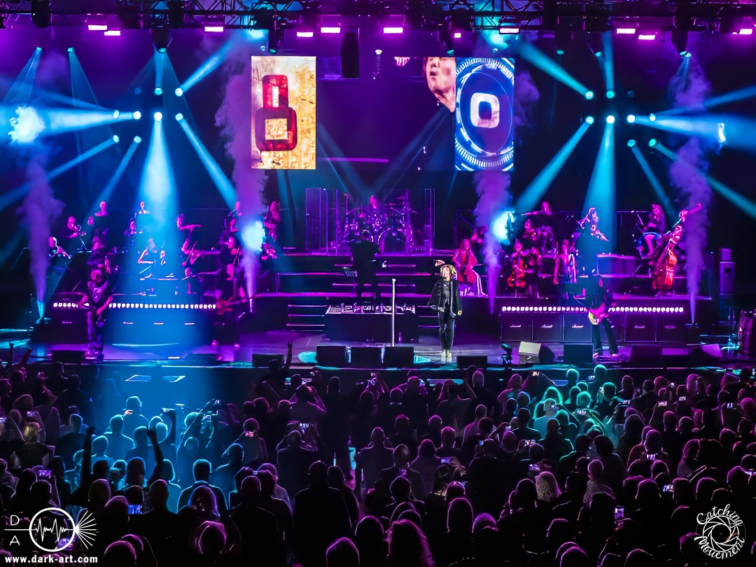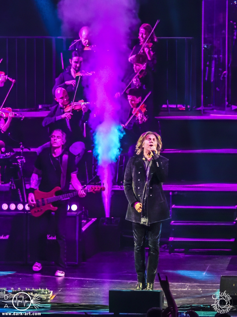 Mit Joey Tempest kam dann der wohl weltweit bekannteste der Stars auf die Bühne – an den Welthits von Europe kommt wahrscheinlich niemand vorbei. Joey betrat mit seiner Gitarre um den Hals die Bühne, mischte den Laden mit Ready Or Not auf und schaffte es, dass alle Zuschauer auf die Füße kamen und mit tanzten. Danach wurden aber ruhigere Töne mit Carrie angeschlagen. Die Zuschauer blieben dennoch stehen, Joey hatte sie voll im Griff und brachte sie dann auch wieder mit Rock the Night zum Tanzen. Er selbst konnte auch nicht still stehen bleiben und lief von links nach rechts, interagierte mit den Fans, gab einigen auch kurz die Hand, ging die Treppe hoch zum Schlagzeuger und sekundierte auch den Dirigenten, was der ersten Cellistin auch ein breites Grinsen entlockte. Ein großes Feuerwerk wurde dann bei dem Europe-Lied abgebrannt: The Final Countdown durfte natürlich nicht fehlen. Die Zuschauer sprangen mit Joey, der seinen Mikrofonständer durch die Luft wirbelte und keine Müdigkeit zeigte. Der Applaus nach seinem Auftritt war besonders groß.