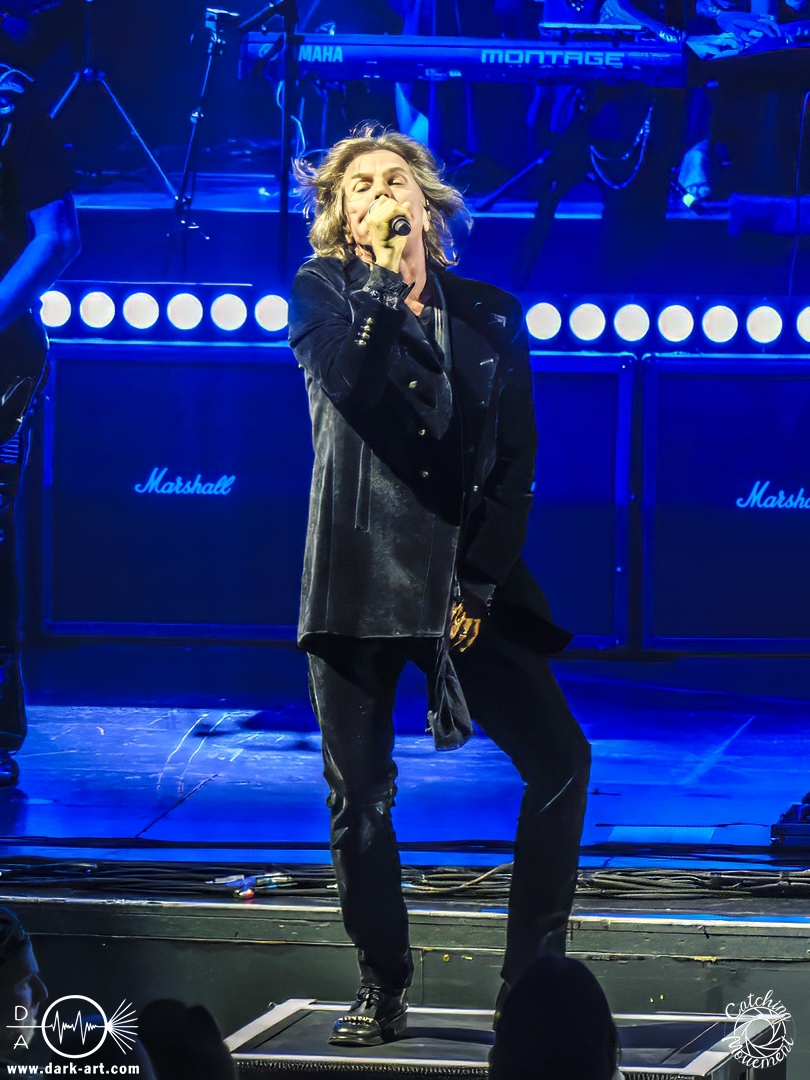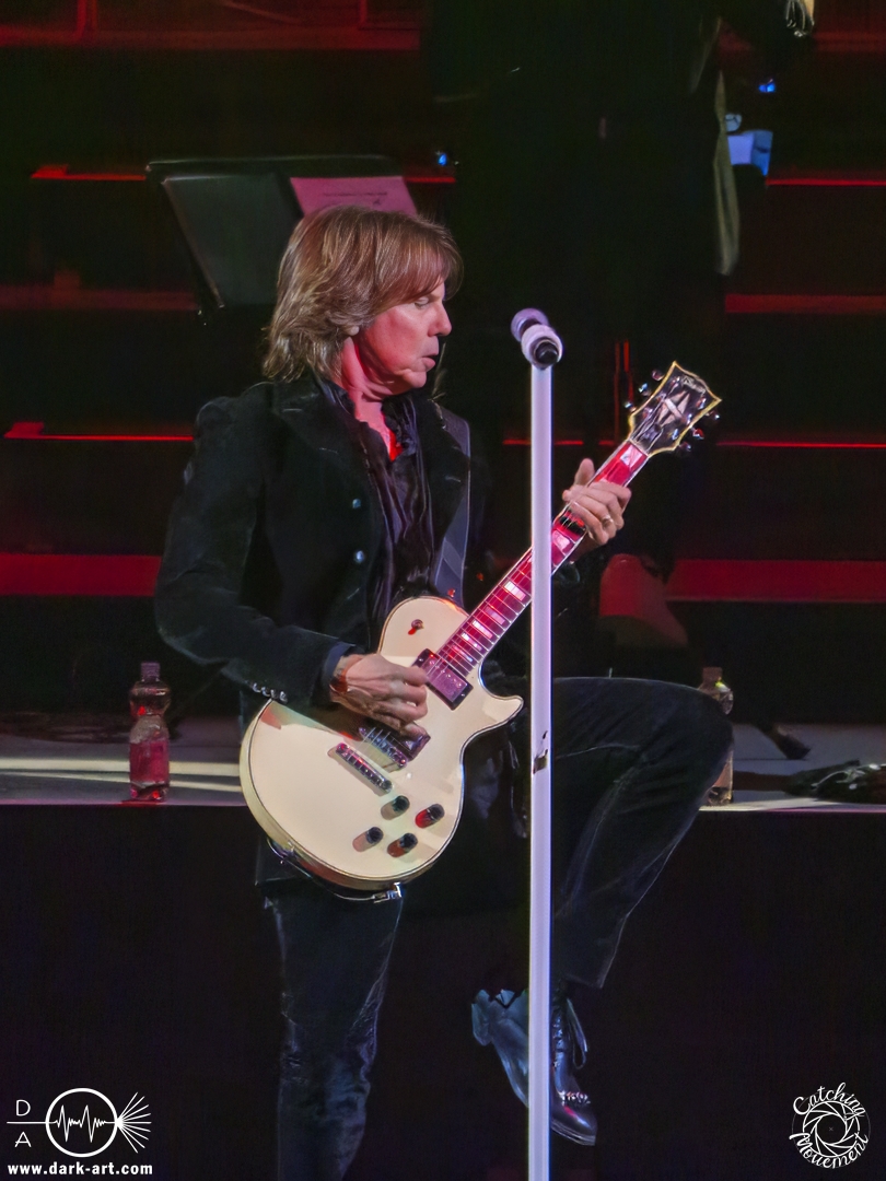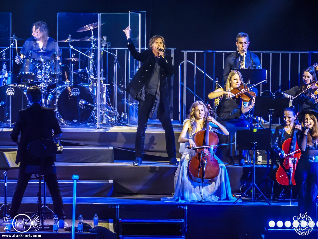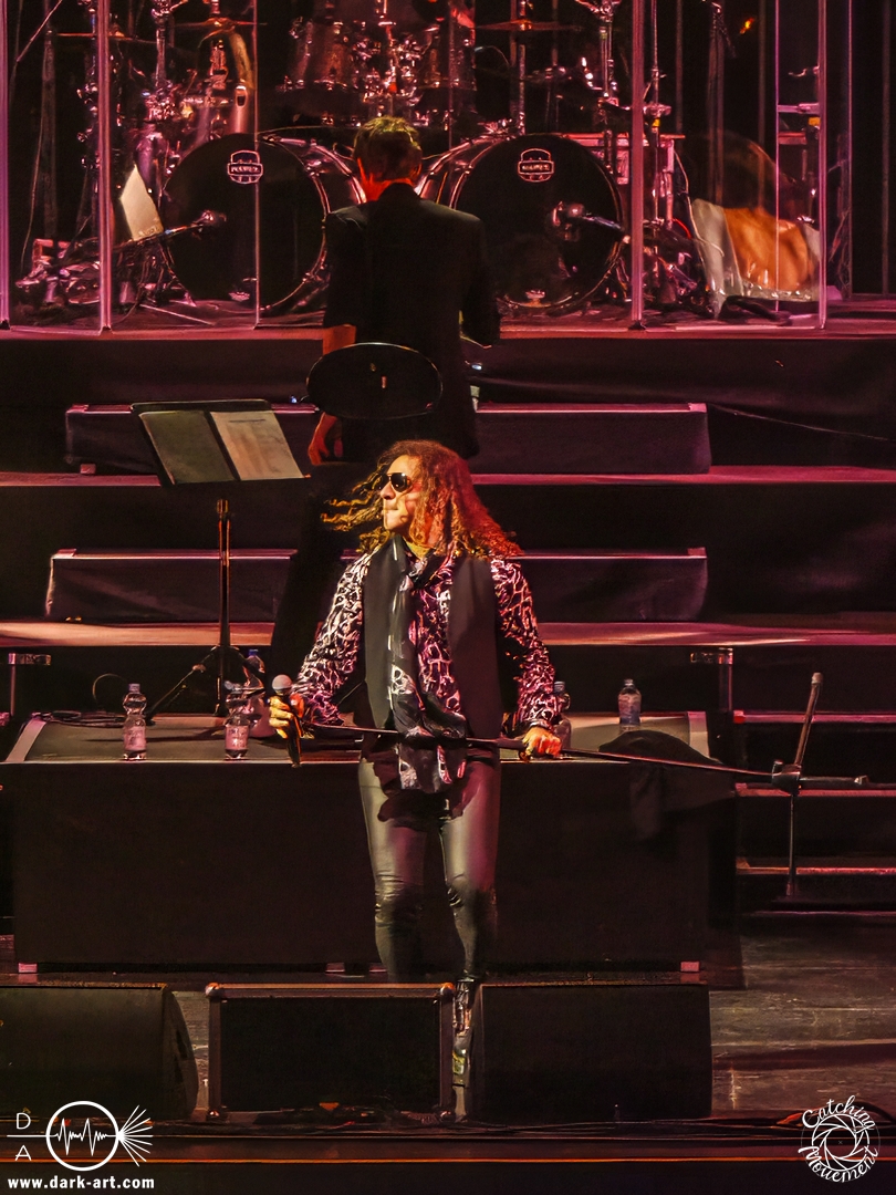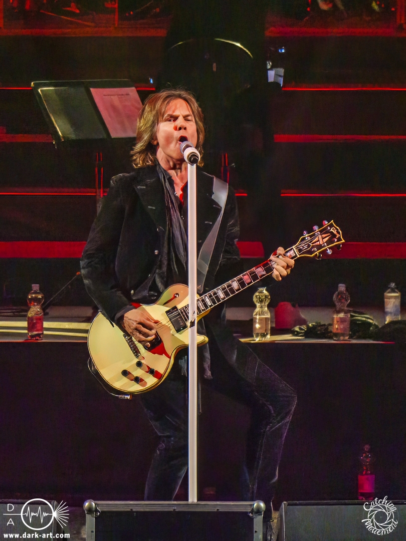 Mit Joey Tempest kam dann der wohl weltweit bekannteste der Stars auf die Bühne – an den Welthits von Europe kommt wahrscheinlich niemand vorbei. Joey betrat mit seiner Gitarre um den Hals die Bühne, mischte den Laden mit Ready Or Not auf und schaffte es, dass alle Zuschauer auf die Füße kamen und mit tanzten. Danach wurden aber ruhigere Töne mit Carrie angeschlagen. Die Zuschauer blieben dennoch stehen, Joey hatte sie voll im Griff und brachte sie dann auch wieder mit Rock the Night zum Tanzen. Er selbst konnte auch nicht still stehen bleiben und lief von links nach rechts, interagierte mit den Fans, gab einigen auch kurz die Hand, ging die Treppe hoch zum Schlagzeuger und sekundierte auch den Dirigenten, was der ersten Cellistin auch ein breites Grinsen entlockte. Ein großes Feuerwerk wurde dann bei dem Europe-Lied abgebrannt: The Final Countdown durfte natürlich nicht fehlen. Die Zuschauer sprangen mit Joey, der seinen Mikrofonständer durch die Luft wirbelte und keine Müdigkeit zeigte. Der Applaus nach seinem Auftritt war besonders groß.