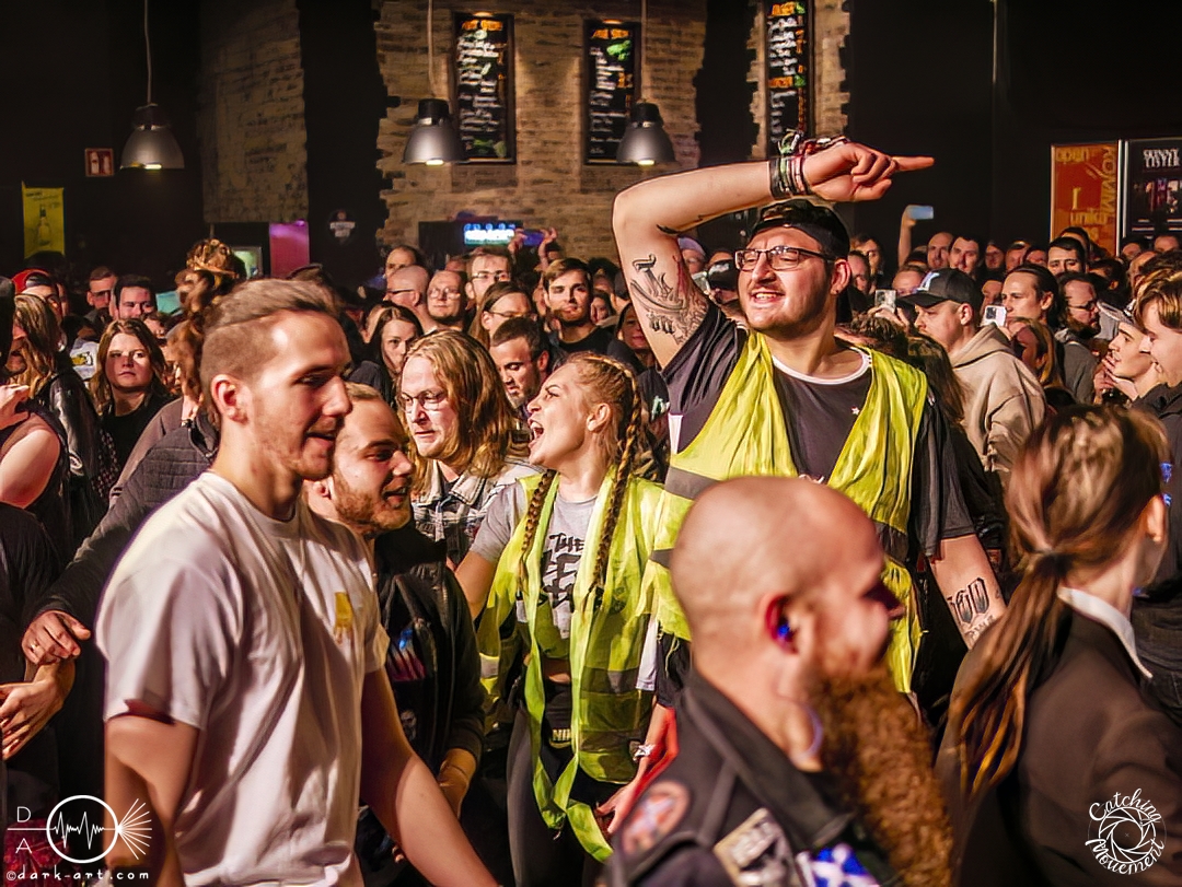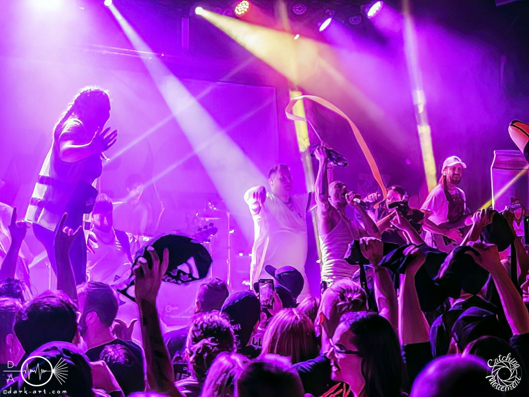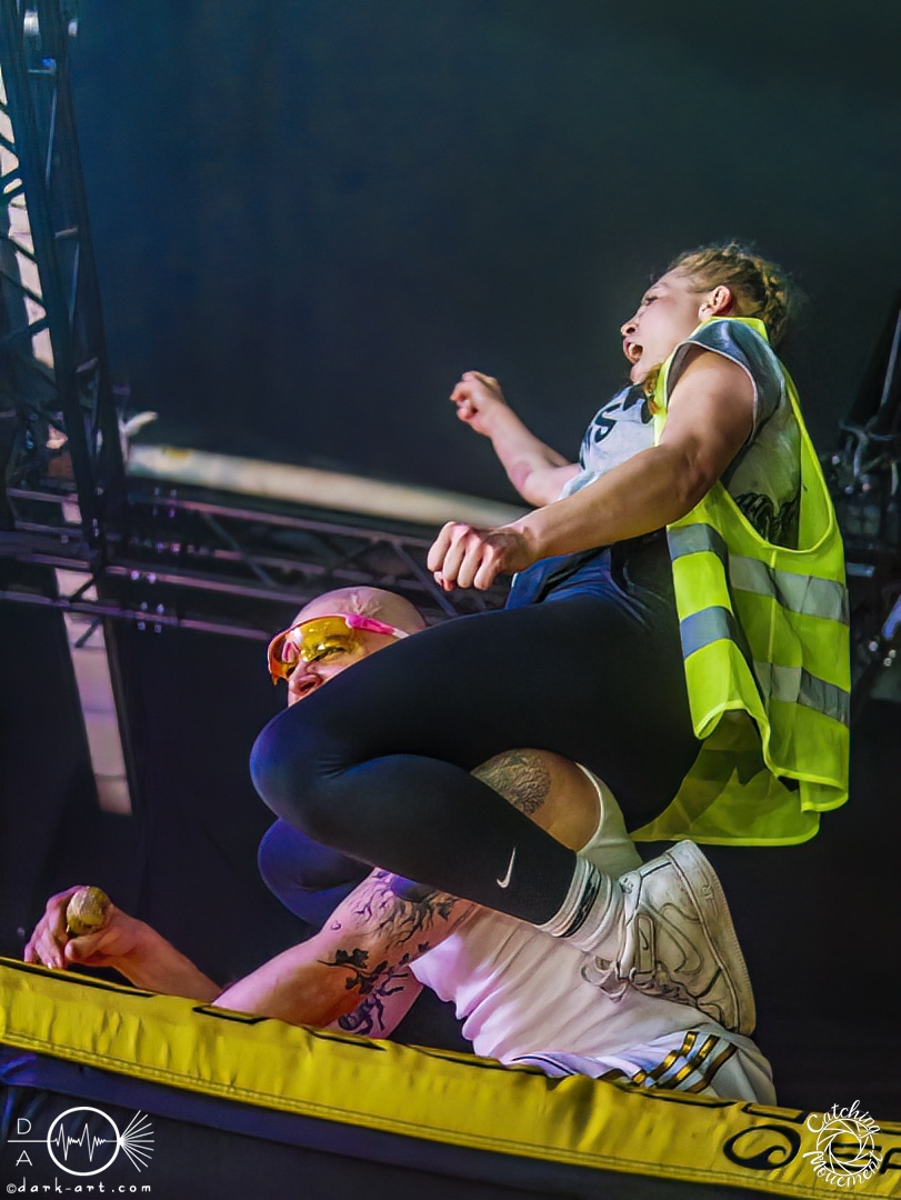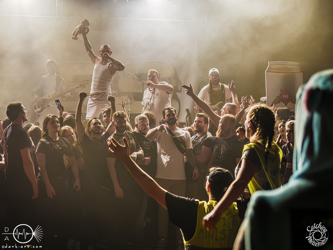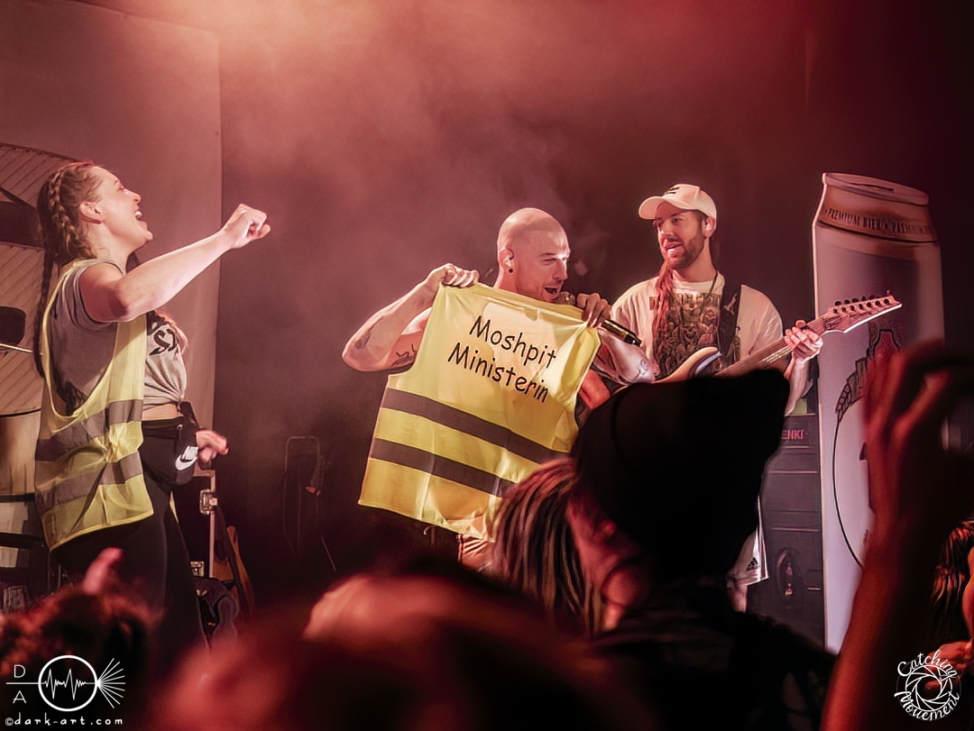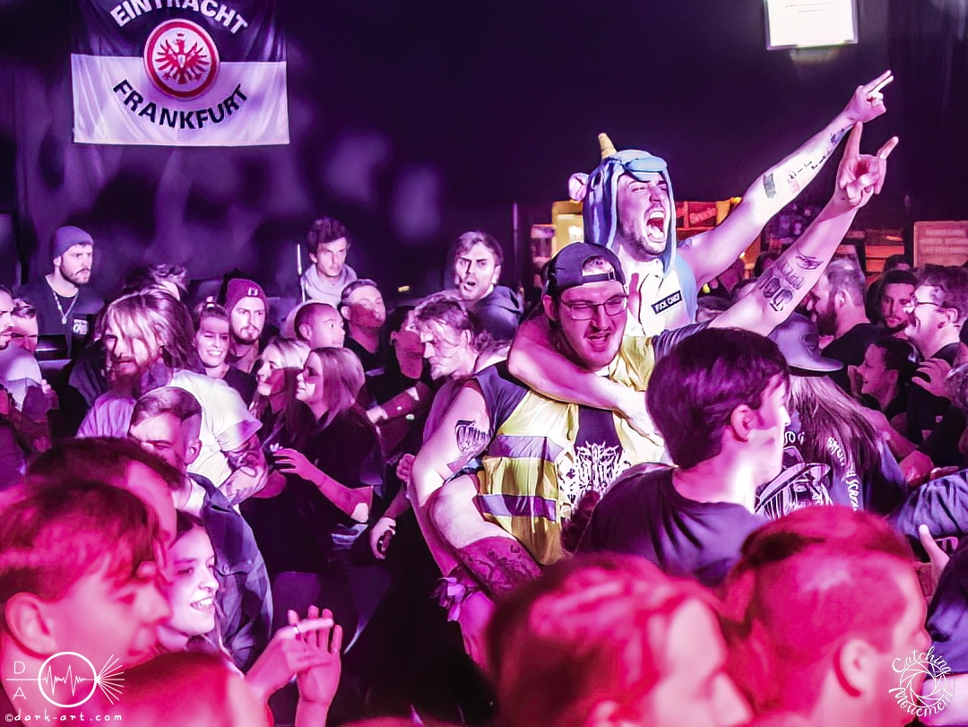 In der Umbauphase wurde die Band in Form von Puppen auf die Bühne gebracht und die Luft spannte sich wie ein Flitzebogen. Die Show von Samurai Pizza Cats begann mit der Titelmelodie der gleichnamigen Comicserie und die Bühne wurde dunkel. Als Erstes hörte man die Stimme des Sängers und seine Aufforderung „Frankfurt, Bewegung!“. Er selbst war bewaffnet mit Hasenmaske, mit creepigen leuchtenden Augen und mit Gitarrenriffs und mit dem ersten Scream startete das Event mit dem Song Outcast. Die Menge hat gekocht, gepogt, sang mit. Erst fiel die Maske, dann wurde beim zweiten Refrain des ersten Songs gleich mal angeleitet, in die Hocke zu gehen, um im nächsten Moment zu springen. Herzlich willkommen zur rhythmischen Sportgymnastik im Bett. Ich muss gestehen: Ich weiß nicht mehr, wer mehr on fire war: Sänger Sebastian oder die Fans. Auf jeden Fall sollte bei Falling Down das Bett brennen, und der Boden vibrierte von vielen tanzenden, pogenden und ekstatischen, klatschenden Fans. Die Band war überwältigt und wer behauptete: „Das war es jetzt“, der täuschte sich. The Wolf in me wurde mit „Ich will euch in Bewegung sehen“ angekündigt und neben einer wogenden Menge kamen die ersten Stagediver des Abends. Im Lauf der ersten Lieder fiel die Collegejacke des Sängers. Was nicht hieß, es würde ruhiger. Freakshow kündigte er mit „Es herrscht Tanzgebot“ an und bat die Zuschauer darum, dass die Menge sich in der Mitte teilte, während er sich umdrehte und mit den ersten Tönen eine Wall of Death sehen wollte. Was soll man groß sagen, nach der Ansage machte das Bett bis zum Lichtpult mit. Fake wird als „ryhthmische Sportgymnastik“ angekündigt und die Menge tobte einfach weiter. Nur um danach kurz durchatmen zu können, da die Bühne dunkel wurde. Nach dem Intro von Der Weiße Hai kam Sebastian im Haikostüm wieder auf die Bühne und trällerte Have a G.O.O.D. Day!, um im Anschluss ein Liebeslied anzukündigen Welcome to the Fightclub, welches mit zwei Circle Pits anstelle von Handylichtern gefeiert wurde. In Alpha überraschte er uns, denn neben Klargesang, Growl und Shouten legte er einen sehr passablen deutschen Rap hin. Hier bekam die Band auch Unterstützung vom Moshpitminister (einem Zuschauer mit Warnweste auf dieser Moshpitminister stand) und seiner Begleiterin, welche beide einen Pit anführten. Langsam neigte sich die Show dem Ende und als Stärkung gab es vor dem letzten Lied noch von der Band spendierte Pizza Hawaii, eine Kuscheltierananas, welche vom Lichtmischpult geworfen wurde und Sebastian verkleidet als Pizzastück. Mit Pizza Homicide endete das schweißtreibende und energiegeladene Workout. Also wem dann noch kalt war, der ist eindeutig unrockbar. Es war wieder mal Metalcore vom Feinsten.