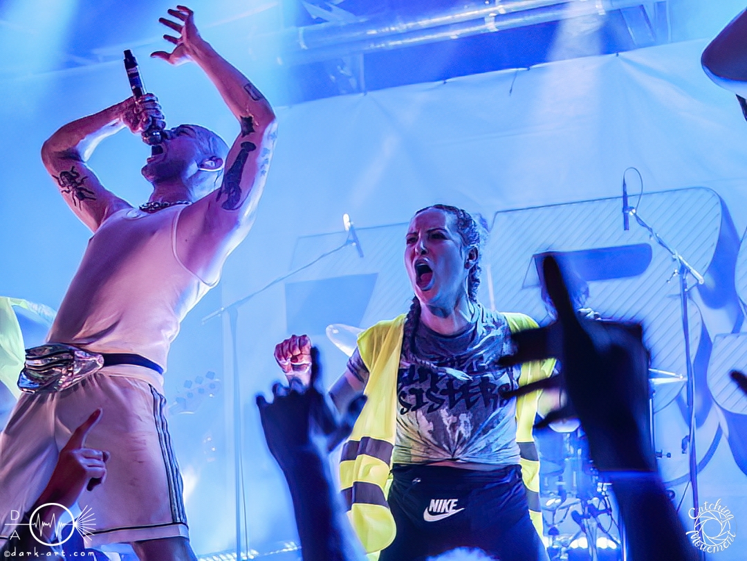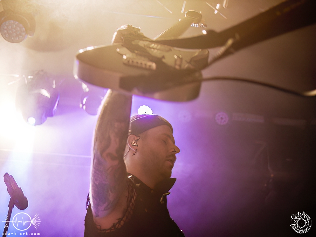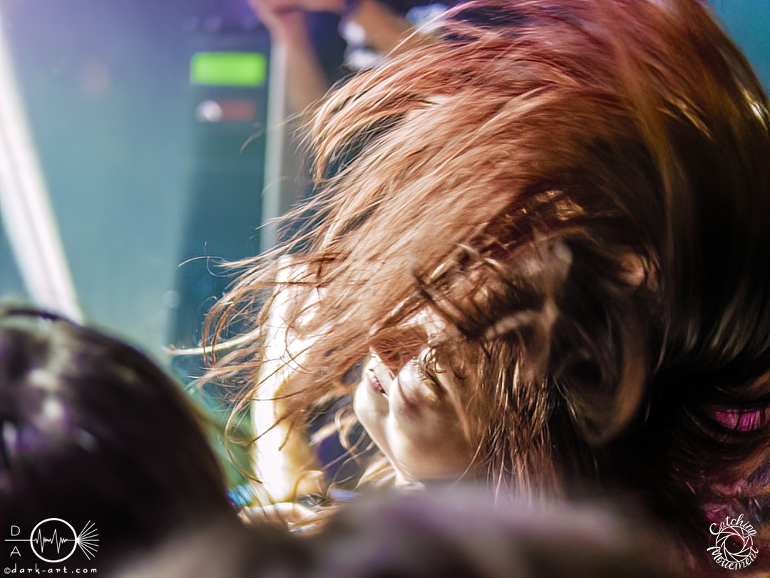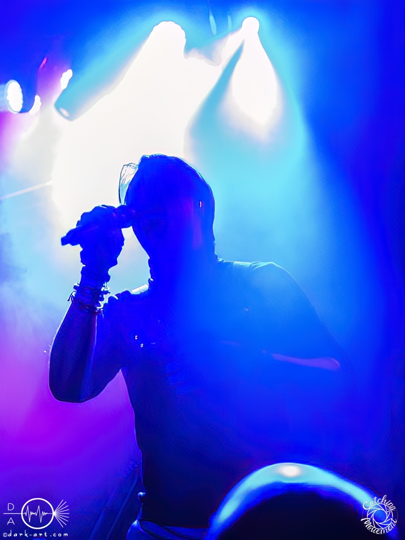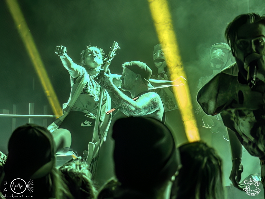 In der Umbauphase wurde die Band in Form von Puppen auf die Bühne gebracht und die Luft spannte sich wie ein Flitzebogen. Die Show von Samurai Pizza Cats begann mit der Titelmelodie der gleichnamigen Comicserie und die Bühne wurde dunkel. Als Erstes hörte man die Stimme des Sängers und seine Aufforderung „Frankfurt, Bewegung!“. Er selbst war bewaffnet mit Hasenmaske, mit creepigen leuchtenden Augen und mit Gitarrenriffs und mit dem ersten Scream startete das Event mit dem Song Outcast. Die Menge hat gekocht, gepogt, sang mit. Erst fiel die Maske, dann wurde beim zweiten Refrain des ersten Songs gleich mal angeleitet, in die Hocke zu gehen, um im nächsten Moment zu springen. Herzlich willkommen zur rhythmischen Sportgymnastik im Bett. Ich muss gestehen: Ich weiß nicht mehr, wer mehr on fire war: Sänger Sebastian oder die Fans. Auf jeden Fall sollte bei Falling Down das Bett brennen, und der Boden vibrierte von vielen tanzenden, pogenden und ekstatischen, klatschenden Fans. Die Band war überwältigt und wer behauptete: „Das war es jetzt“, der täuschte sich. The Wolf in me wurde mit „Ich will euch in Bewegung sehen“ angekündigt und neben einer wogenden Menge kamen die ersten Stagediver des Abends. Im Lauf der ersten Lieder fiel die Collegejacke des Sängers. Was nicht hieß, es würde ruhiger. Freakshow kündigte er mit „Es herrscht Tanzgebot“ an und bat die Zuschauer darum, dass die Menge sich in der Mitte teilte, während er sich umdrehte und mit den ersten Tönen eine Wall of Death sehen wollte. Was soll man groß sagen, nach der Ansage machte das Bett bis zum Lichtpult mit. Fake wird als „ryhthmische Sportgymnastik“ angekündigt und die Menge tobte einfach weiter. Nur um danach kurz durchatmen zu können, da die Bühne dunkel wurde. Nach dem Intro von Der Weiße Hai kam Sebastian im Haikostüm wieder auf die Bühne und trällerte Have a G.O.O.D. Day!, um im Anschluss ein Liebeslied anzukündigen Welcome to the Fightclub, welches mit zwei Circle Pits anstelle von Handylichtern gefeiert wurde. In Alpha überraschte er uns, denn neben Klargesang, Growl und Shouten legte er einen sehr passablen deutschen Rap hin. Hier bekam die Band auch Unterstützung vom Moshpitminister (einem Zuschauer mit Warnweste auf dieser Moshpitminister stand) und seiner Begleiterin, welche beide einen Pit anführten. Langsam neigte sich die Show dem Ende und als Stärkung gab es vor dem letzten Lied noch von der Band spendierte Pizza Hawaii, eine Kuscheltierananas, welche vom Lichtmischpult geworfen wurde und Sebastian verkleidet als Pizzastück. Mit Pizza Homicide endete das schweißtreibende und energiegeladene Workout. Also wem dann noch kalt war, der ist eindeutig unrockbar. Es war wieder mal Metalcore vom Feinsten.