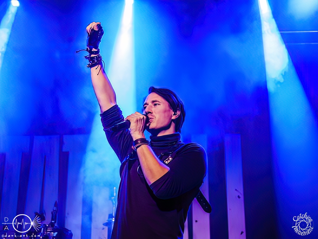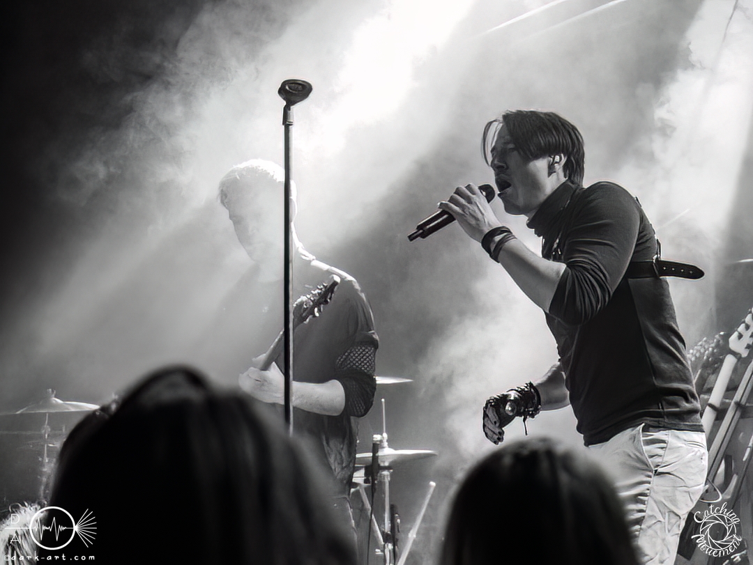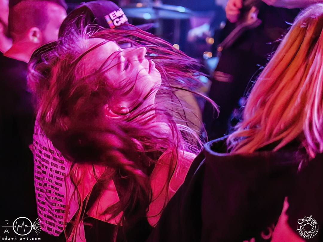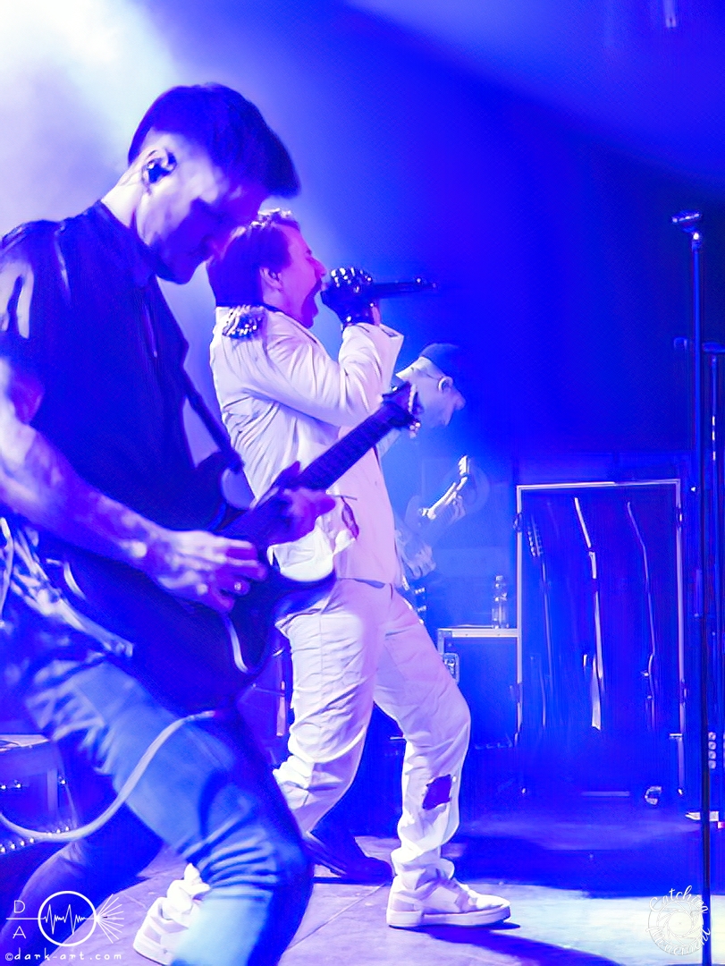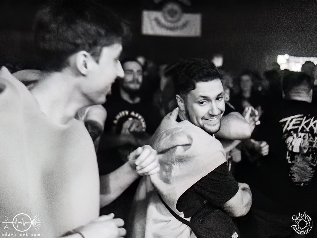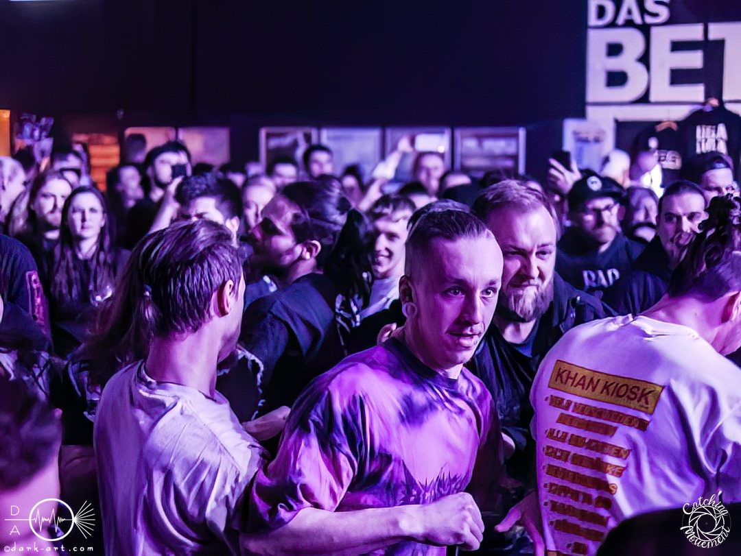 In der Umbauphase wurde die Band in Form von Puppen auf die Bühne gebracht und die Luft spannte sich wie ein Flitzebogen. Die Show von Samurai Pizza Cats begann mit der Titelmelodie der gleichnamigen Comicserie und die Bühne wurde dunkel. Als Erstes hörte man die Stimme des Sängers und seine Aufforderung „Frankfurt, Bewegung!“. Er selbst war bewaffnet mit Hasenmaske, mit creepigen leuchtenden Augen und mit Gitarrenriffs und mit dem ersten Scream startete das Event mit dem Song Outcast. Die Menge hat gekocht, gepogt, sang mit. Erst fiel die Maske, dann wurde beim zweiten Refrain des ersten Songs gleich mal angeleitet, in die Hocke zu gehen, um im nächsten Moment zu springen. Herzlich willkommen zur rhythmischen Sportgymnastik im Bett. Ich muss gestehen: Ich weiß nicht mehr, wer mehr on fire war: Sänger Sebastian oder die Fans. Auf jeden Fall sollte bei Falling Down das Bett brennen, und der Boden vibrierte von vielen tanzenden, pogenden und ekstatischen, klatschenden Fans. Die Band war überwältigt und wer behauptete: „Das war es jetzt“, der täuschte sich. The Wolf in me wurde mit „Ich will euch in Bewegung sehen“ angekündigt und neben einer wogenden Menge kamen die ersten Stagediver des Abends. Im Lauf der ersten Lieder fiel die Collegejacke des Sängers. Was nicht hieß, es würde ruhiger. Freakshow kündigte er mit „Es herrscht Tanzgebot“ an und bat die Zuschauer darum, dass die Menge sich in der Mitte teilte, während er sich umdrehte und mit den ersten Tönen eine Wall of Death sehen wollte. Was soll man groß sagen, nach der Ansage machte das Bett bis zum Lichtpult mit. Fake wird als „ryhthmische Sportgymnastik“ angekündigt und die Menge tobte einfach weiter. Nur um danach kurz durchatmen zu können, da die Bühne dunkel wurde. Nach dem Intro von Der Weiße Hai kam Sebastian im Haikostüm wieder auf die Bühne und trällerte Have a G.O.O.D. Day!, um im Anschluss ein Liebeslied anzukündigen Welcome to the Fightclub, welches mit zwei Circle Pits anstelle von Handylichtern gefeiert wurde. In Alpha überraschte er uns, denn neben Klargesang, Growl und Shouten legte er einen sehr passablen deutschen Rap hin. Hier bekam die Band auch Unterstützung vom Moshpitminister (einem Zuschauer mit Warnweste auf dieser Moshpitminister stand) und seiner Begleiterin, welche beide einen Pit anführten. Langsam neigte sich die Show dem Ende und als Stärkung gab es vor dem letzten Lied noch von der Band spendierte Pizza Hawaii, eine Kuscheltierananas, welche vom Lichtmischpult geworfen wurde und Sebastian verkleidet als Pizzastück. Mit Pizza Homicide endete das schweißtreibende und energiegeladene Workout. Also wem dann noch kalt war, der ist eindeutig unrockbar. Es war wieder mal Metalcore vom Feinsten.