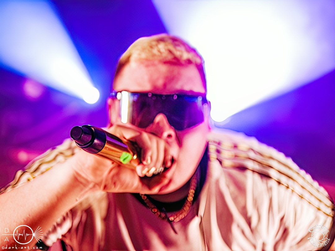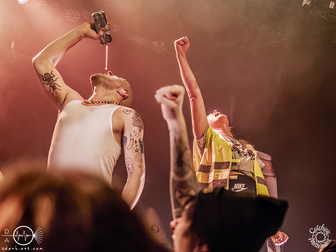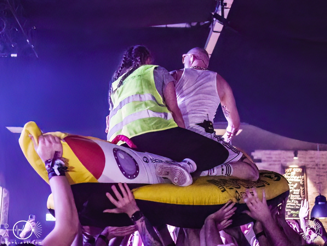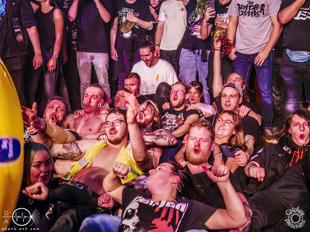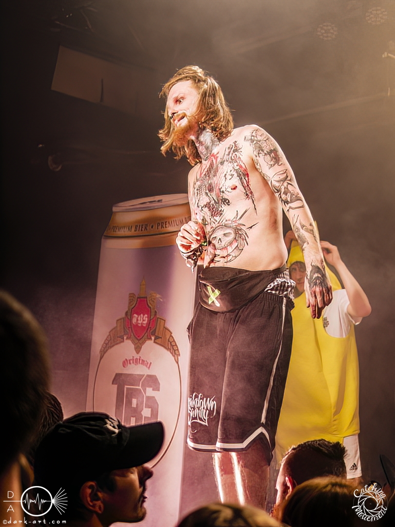 Also nach Posthardcore und Metalcore folgt nun Party-/Porno-Core. Zumindest die Ansage für den Start von TBS war schon mal passend für das Bett. Die Bühne wurde abgedunkelt, mit Schlafzimmermusik hinterlegt und in klassischer und typischer Manier fragte die Stimme von Strobo, ob Frankfurt Lust hätte, denn die Jungs hätten Lust und jeder hätte eine Erektion. Mit Bierglas, Cocktails, Adidasanzügen, glitzernden, silbernen Bauchtaschen, Glitzerpompons und goldenen Mikros kam das Quintett aus Mannheim auf die Bühne und die Crowd rastete aus. Die Fans grölten bei jedem Lied mit. Stagediver waren sofort unterwegs und zwischen den Songs gab es die wohl ebenso wichtigen und essenziellen Zwischenansagen. Wenn das noch nicht ausreichte, dann ging es in die Hocke, um die Bühne anschließend mit Springen noch mehr zum Beben zu bringen, wie bei Alpha & Opfa, oder es wurden in der kompletten Halle Hip-Hop-Moves ausgepackt. Nach den ersten drei Songs forderten TBS die Fans auf, für die Co-Headliner Samurai Pizza Cats für ein Foto zu posen. Danach ging die Band von der Bühne (macht ja so, nach dem ‚letzten‘ Lied), um mit TBS- und Zugaberufen zurückgeholt zu werden. TBS muss man wirklich erleben, denn man wird einfach mitgezogen. Das Lied Reiner erhielt Unterstützung von einer Puppe, die während des Liedes zwischen Fans und Sänger hin und her geworfen wurde. Der nächste Wahnsinn folgte, denn als Sänger Alex noch die Menge teilte und diese zu Affengeräuschen animierte, kam Stroppo mit einem Gummiboot. Zu Beginn dominierte er das Boot noch, aber es wurde recht schnell von der Frau in der Warnweste geentert und am Ende eingenommen. Banana wurde von Fans auf der Bühne, Bananen auf der Bühne, einem leeren Gummiboot und von den Sängern in die Menge geworfene Gummibananen und mit einem koordinierten Chaos frenetisch gefeiert. Es folgten noch drehende T-Shirts, ein Wetttrinken und am Ende bei Baggersee ein Planschbeckenbaggerseeeinhorn und eine Dosenbierdusche durch die Sänger. Die Menge kochte, pogte, sang und tanzte vom ersten bis zum letzten Lied, und am Ende der Show wurde auf dem Einhorn geknuddelt und fleißig Autogramme auf selbstgeschriebene Plakate gegeben. Die Marke TBS steht neben den sehr eingängigen Texten, die sofort mitgegröhlt werden können, auch ohne, dass man die Songs kennt, für die Zwischenansagen der Band. Itchy brachte mal eine CD nur mit ihren Zwischenansagen raus, und daran musste ich bei dieser Show auch denken. Ich kann nicht alles wiedergeben, denn sie sind in der Situation komisch, hart an der Grenze zu zuviel Macho, aber es passt einfach. Man lacht mit und wird von der Menge und der Band mitgerissen wie in einem Tsunami. Einen letzten Moment will ich noch herausholen, denn Strobo und Alex suchten ihre Bauchtaschen, in denen sie eine Überraschung versteckten – nämlich Dosenbier. Dies teilten sie aber ritterlich mit Moshpitminister und Warnwestenlady. Beide kamen zum Wetttrinken auf die Bühne, und sie war eindeutig durstiger als Moshpitminister. Am Ende erhielten beide einen Preis und nun gab es Moshpitminister und Moshpitministerin und neue Warnwesten. Diese gesamte Aktion wurde sechs Minuten lang gefeiert, auf und neben der Bühne. Wir sehen uns wieder, TBS!