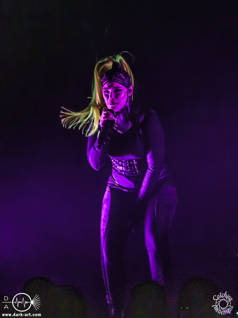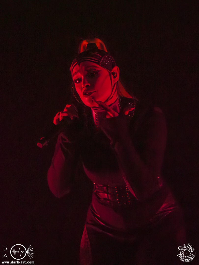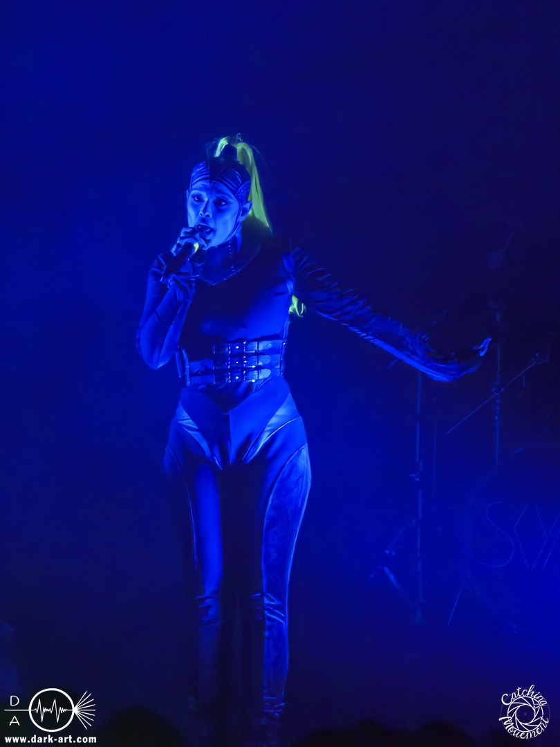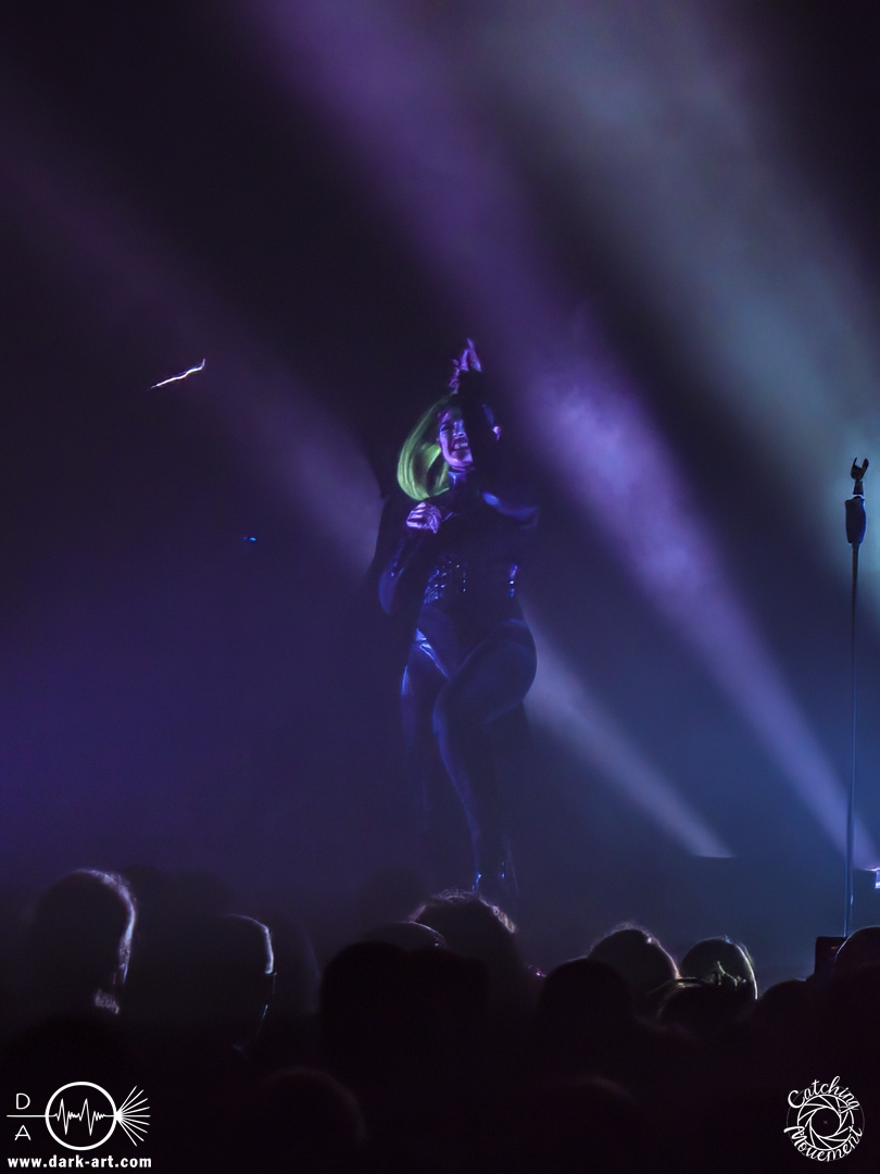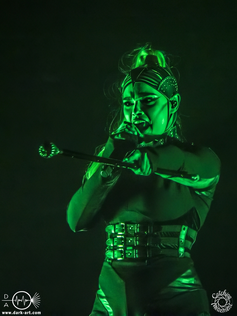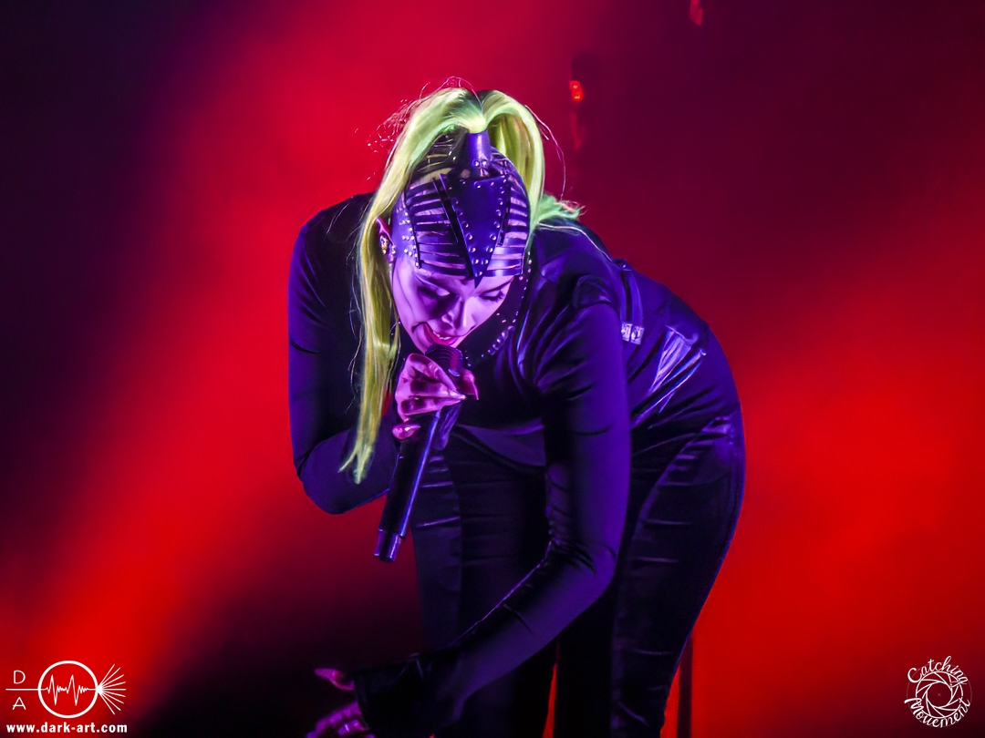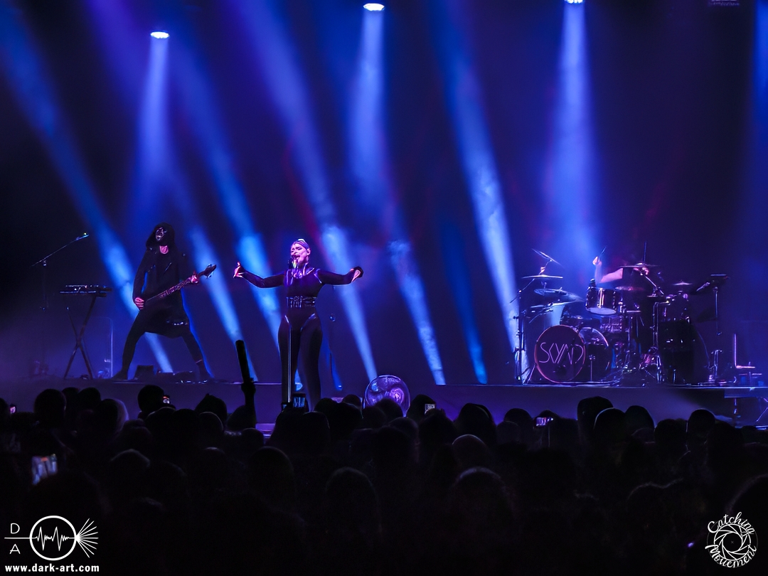 Pünktlich ging dann das Licht aus, der SKYND-Schriftzug im Hintergrund wurde rot angeleuchtet und das Intro erklang. Zunächst kam der Drummer auf die Bühne, anschließend Father, beide bekleidet mit Kapuzenumhängen und Masken tragend, damit man sie nicht erkennt. Skynd betrat dann unter Jubel die Bühne und es ging direkt mit Michelle Carter los. Die Künstlerin blieb nur am Mikro stehen und zeigte direkt ihr beeindruckendes Können. Wer nicht hinschaute, hätte locker davon ausgehen können, dass sich zwei, wenn nicht drei, singende Menschen auf Bühne befänden. Bei Elisa Liam kam sie dann auch etwas nach vorne auf die Boxen vor der Bühne und fixierte die Zuschauer der ersten Reihen während sie die Geschichte erzählte und mit ihrem „Ring, ding, down, ring-de-ding down“ richtig unangenehme Gänsehaut erzeugte. Für ihr neuestes Lied, Tamara Samsanova, besser bekannt als Granny Ripper oder Baba Yaga, bekam sie einen goldenen Umhang gebracht, denselben wie im Musikvideo. Während sie bei den beiden ersten Liedern noch relativ ruhig am Mikro stand, fing sie dann an mehr umherzulaufen und mit ihrem Ausdruck, den Armen und Händen die Atmosphäre zu verstärken.