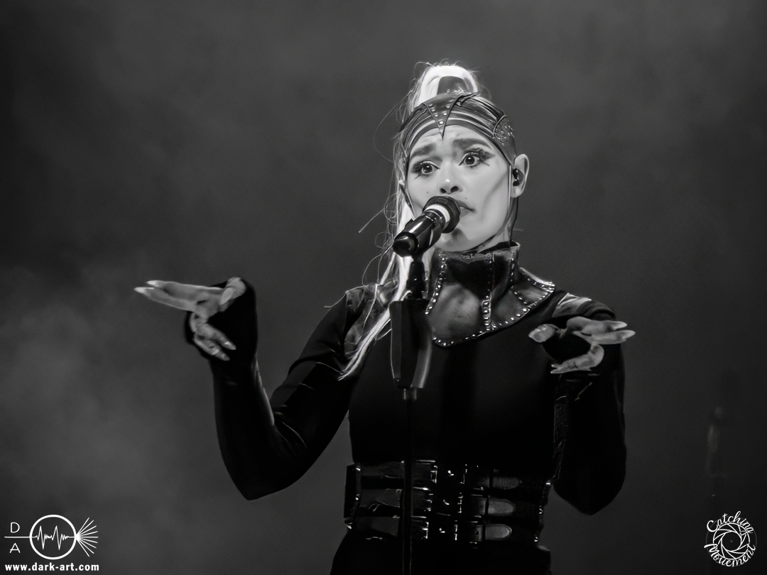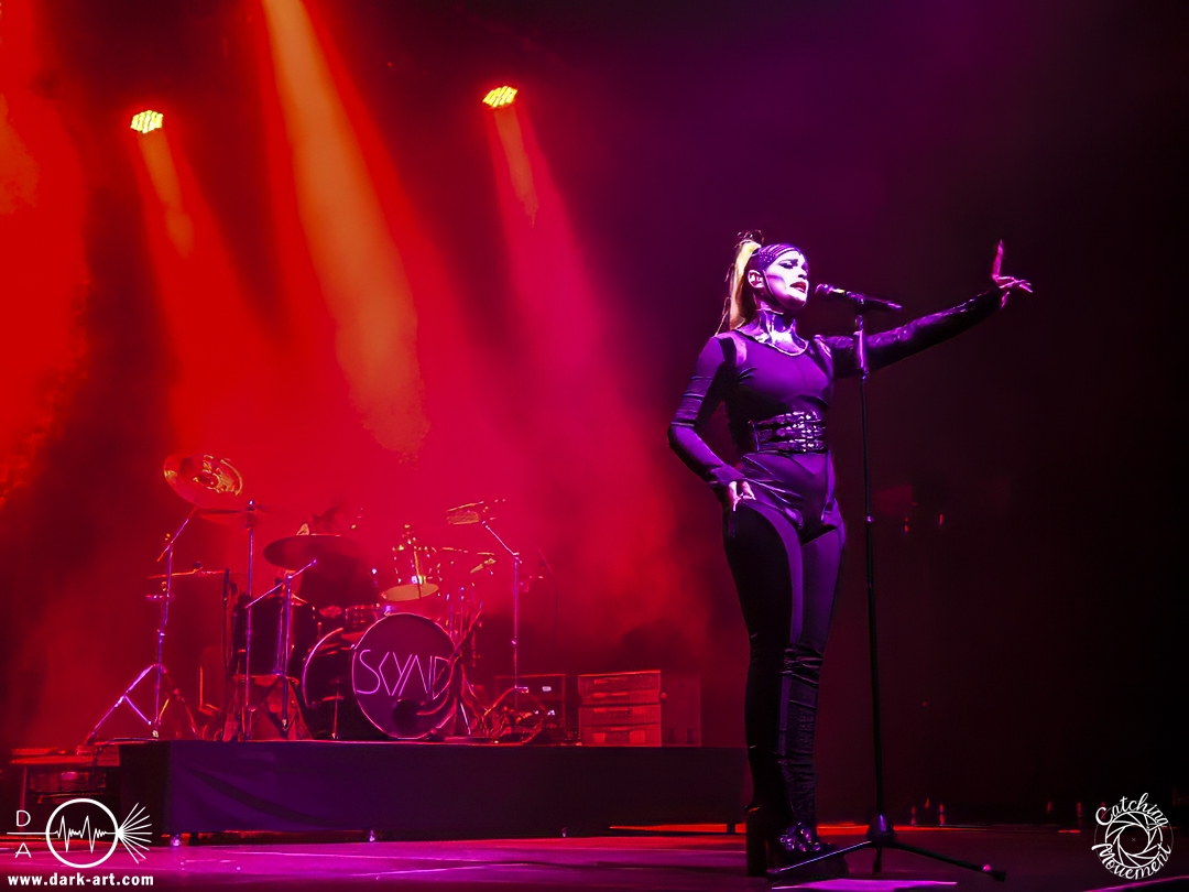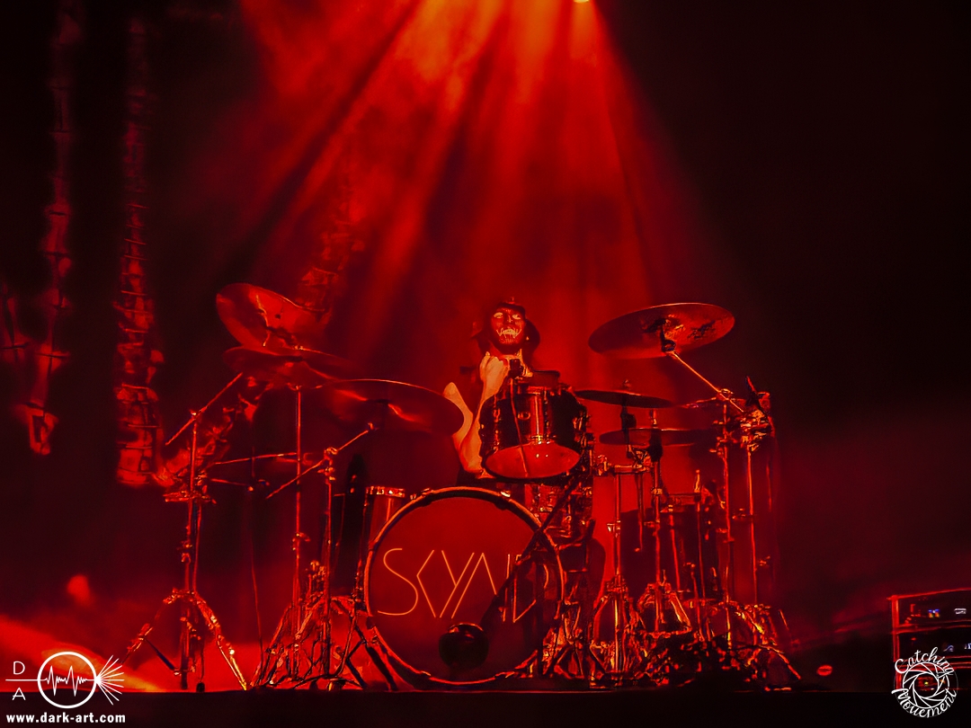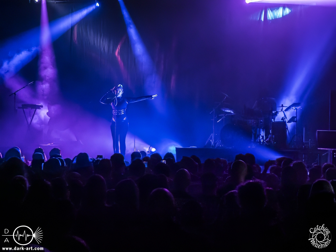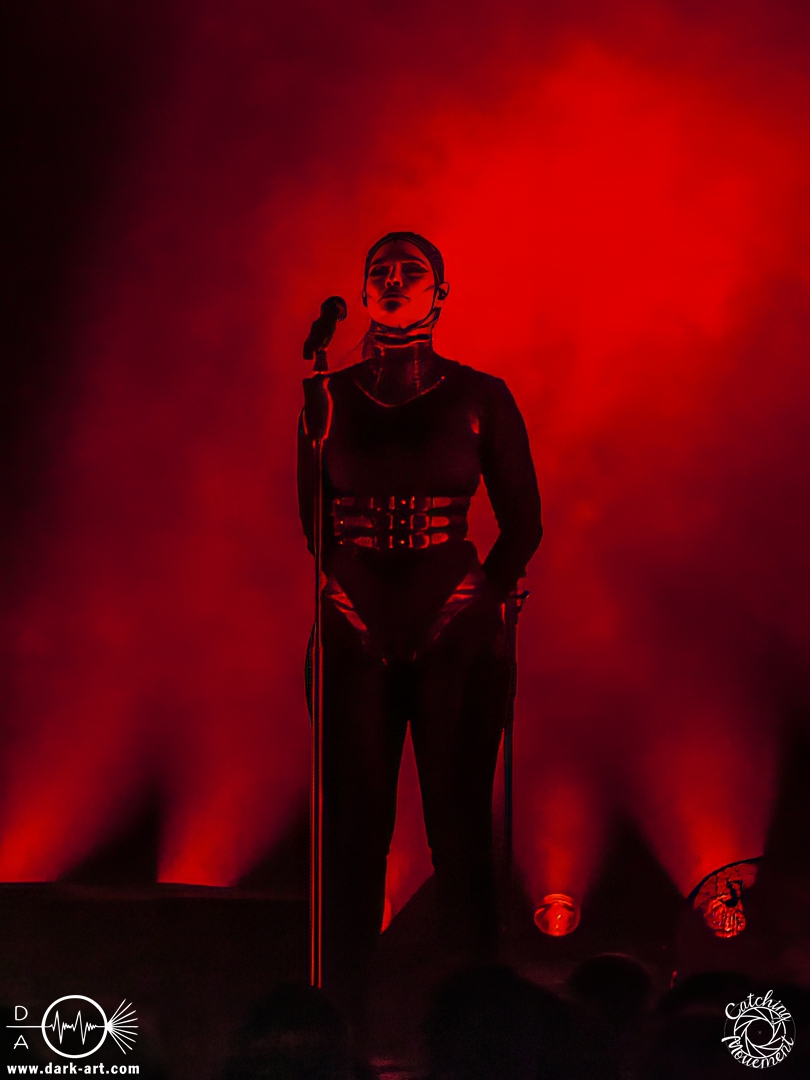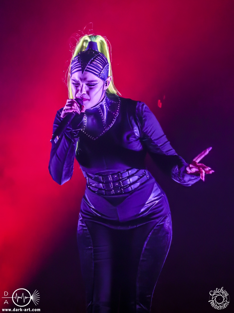 Pünktlich ging dann das Licht aus, der SKYND-Schriftzug im Hintergrund wurde rot angeleuchtet und das Intro erklang. Zunächst kam der Drummer auf die Bühne, anschließend Father, beide bekleidet mit Kapuzenumhängen und Masken tragend, damit man sie nicht erkennt. Skynd betrat dann unter Jubel die Bühne und es ging direkt mit Michelle Carter los. Die Künstlerin blieb nur am Mikro stehen und zeigte direkt ihr beeindruckendes Können. Wer nicht hinschaute, hätte locker davon ausgehen können, dass sich zwei, wenn nicht drei, singende Menschen auf Bühne befänden. Bei Elisa Liam kam sie dann auch etwas nach vorne auf die Boxen vor der Bühne und fixierte die Zuschauer der ersten Reihen während sie die Geschichte erzählte und mit ihrem „Ring, ding, down, ring-de-ding down“ richtig unangenehme Gänsehaut erzeugte. Für ihr neuestes Lied, Tamara Samsanova, besser bekannt als Granny Ripper oder Baba Yaga, bekam sie einen goldenen Umhang gebracht, denselben wie im Musikvideo. Während sie bei den beiden ersten Liedern noch relativ ruhig am Mikro stand, fing sie dann an mehr umherzulaufen und mit ihrem Ausdruck, den Armen und Händen die Atmosphäre zu verstärken.