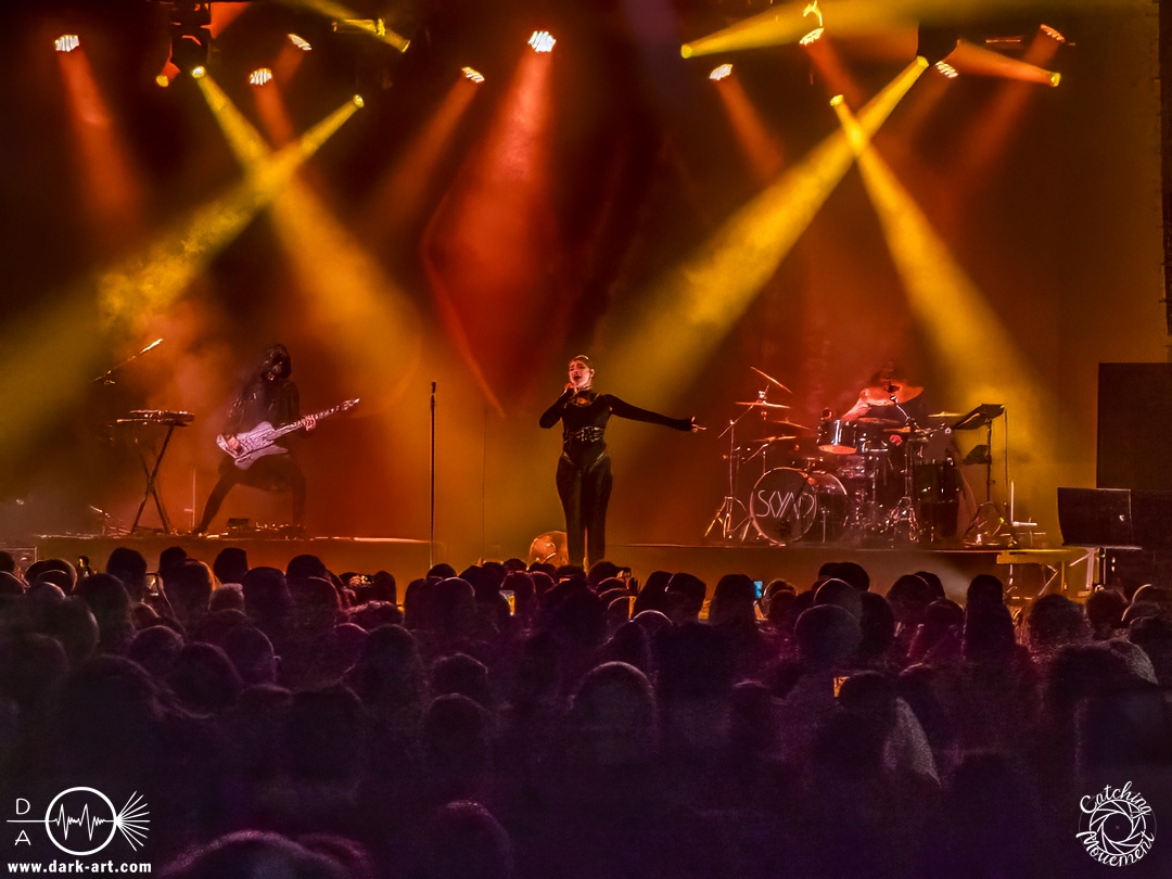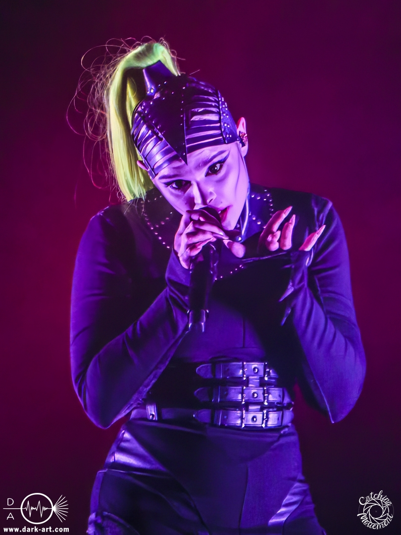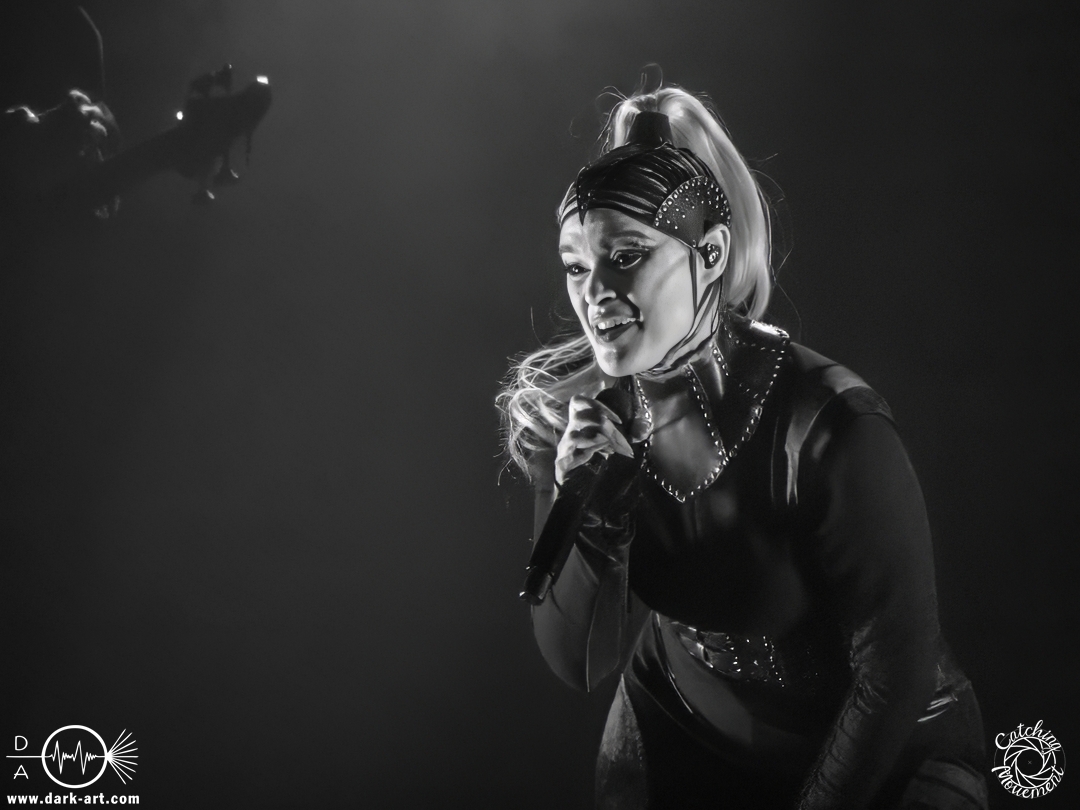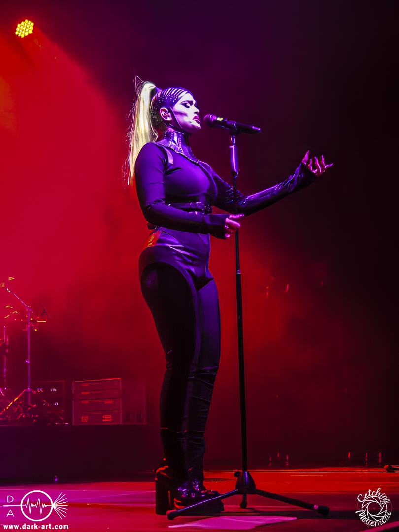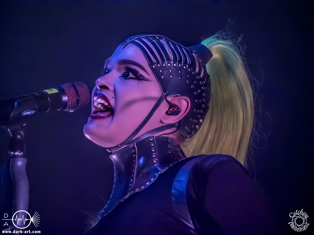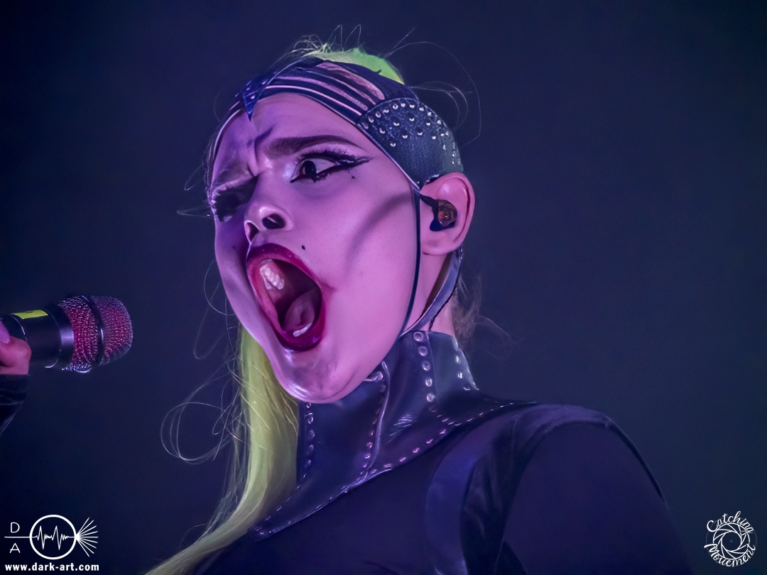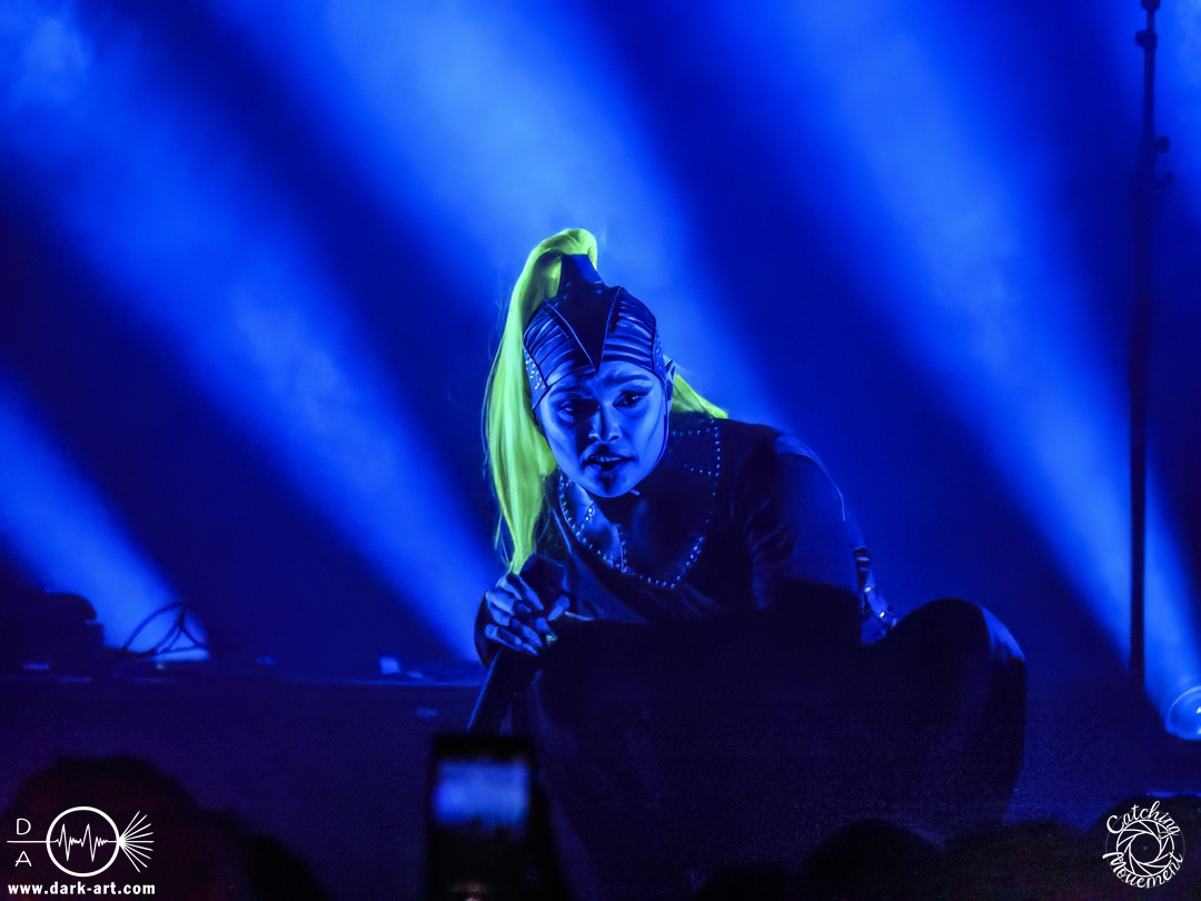 Pünktlich ging dann das Licht aus, der SKYND-Schriftzug im Hintergrund wurde rot angeleuchtet und das Intro erklang. Zunächst kam der Drummer auf die Bühne, anschließend Father, beide bekleidet mit Kapuzenumhängen und Masken tragend, damit man sie nicht erkennt. Skynd betrat dann unter Jubel die Bühne und es ging direkt mit Michelle Carter los. Die Künstlerin blieb nur am Mikro stehen und zeigte direkt ihr beeindruckendes Können. Wer nicht hinschaute, hätte locker davon ausgehen können, dass sich zwei, wenn nicht drei, singende Menschen auf Bühne befänden. Bei Elisa Liam kam sie dann auch etwas nach vorne auf die Boxen vor der Bühne und fixierte die Zuschauer der ersten Reihen während sie die Geschichte erzählte und mit ihrem „Ring, ding, down, ring-de-ding down“ richtig unangenehme Gänsehaut erzeugte. Für ihr neuestes Lied, Tamara Samsanova, besser bekannt als Granny Ripper oder Baba Yaga, bekam sie einen goldenen Umhang gebracht, denselben wie im Musikvideo. Während sie bei den beiden ersten Liedern noch relativ ruhig am Mikro stand, fing sie dann an mehr umherzulaufen und mit ihrem Ausdruck, den Armen und Händen die Atmosphäre zu verstärken.