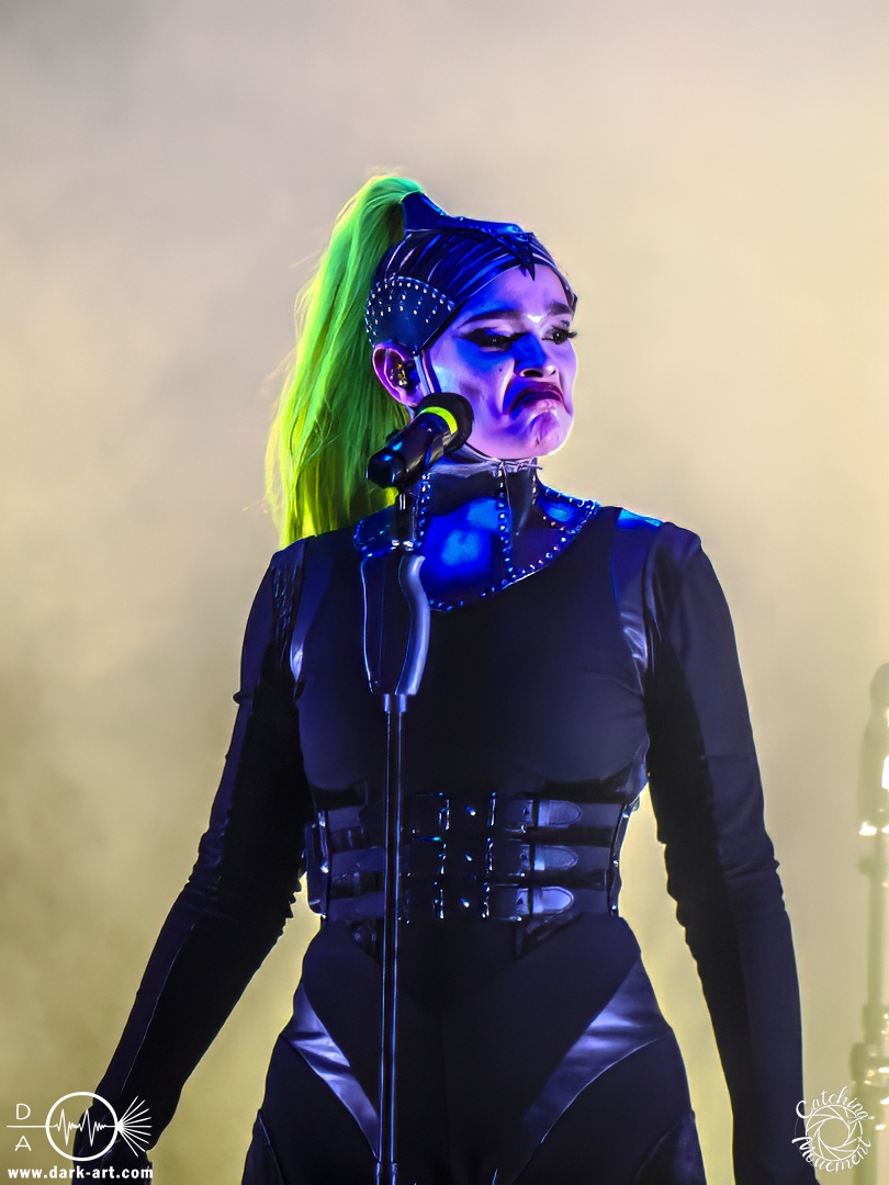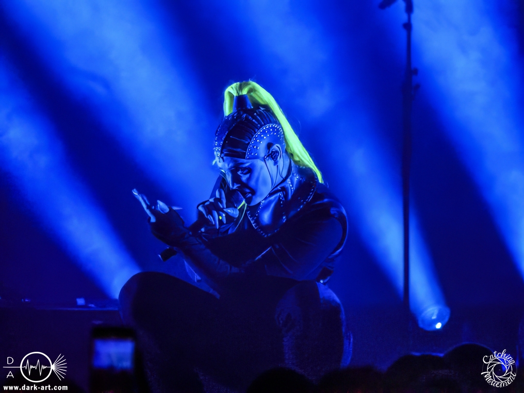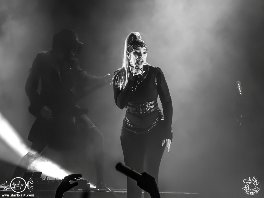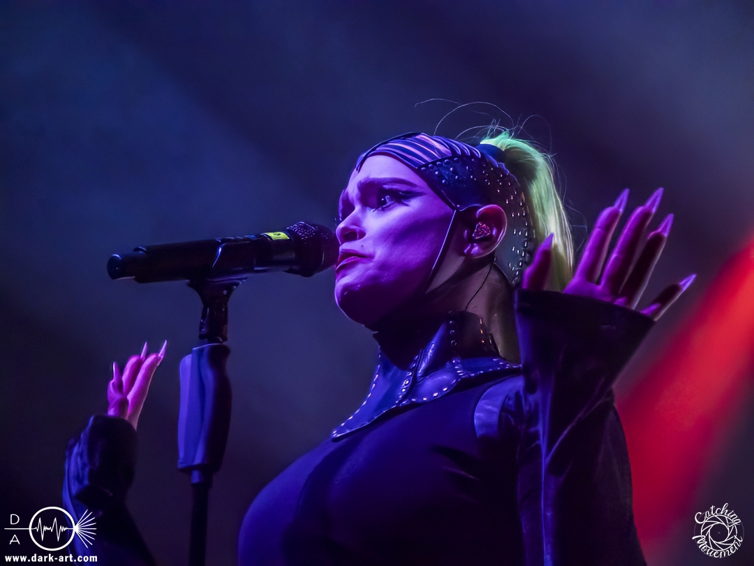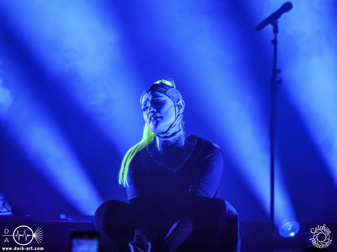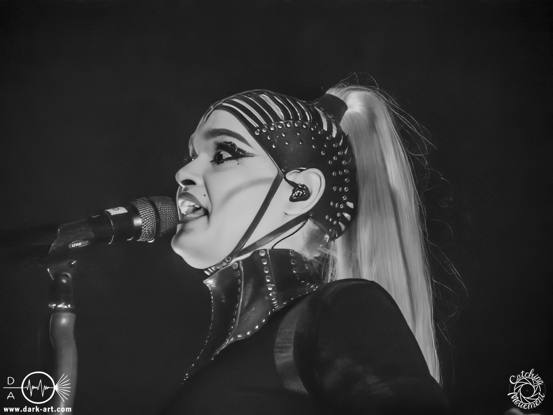 Pünktlich ging dann das Licht aus, der SKYND-Schriftzug im Hintergrund wurde rot angeleuchtet und das Intro erklang. Zunächst kam der Drummer auf die Bühne, anschließend Father, beide bekleidet mit Kapuzenumhängen und Masken tragend, damit man sie nicht erkennt. Skynd betrat dann unter Jubel die Bühne und es ging direkt mit Michelle Carter los. Die Künstlerin blieb nur am Mikro stehen und zeigte direkt ihr beeindruckendes Können. Wer nicht hinschaute, hätte locker davon ausgehen können, dass sich zwei, wenn nicht drei, singende Menschen auf Bühne befänden. Bei Elisa Liam kam sie dann auch etwas nach vorne auf die Boxen vor der Bühne und fixierte die Zuschauer der ersten Reihen während sie die Geschichte erzählte und mit ihrem „Ring, ding, down, ring-de-ding down“ richtig unangenehme Gänsehaut erzeugte. Für ihr neuestes Lied, Tamara Samsanova, besser bekannt als Granny Ripper oder Baba Yaga, bekam sie einen goldenen Umhang gebracht, denselben wie im Musikvideo. Während sie bei den beiden ersten Liedern noch relativ ruhig am Mikro stand, fing sie dann an mehr umherzulaufen und mit ihrem Ausdruck, den Armen und Händen die Atmosphäre zu verstärken.
