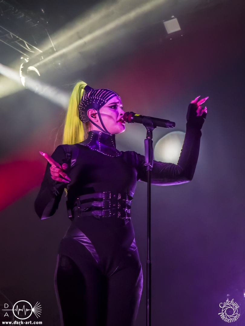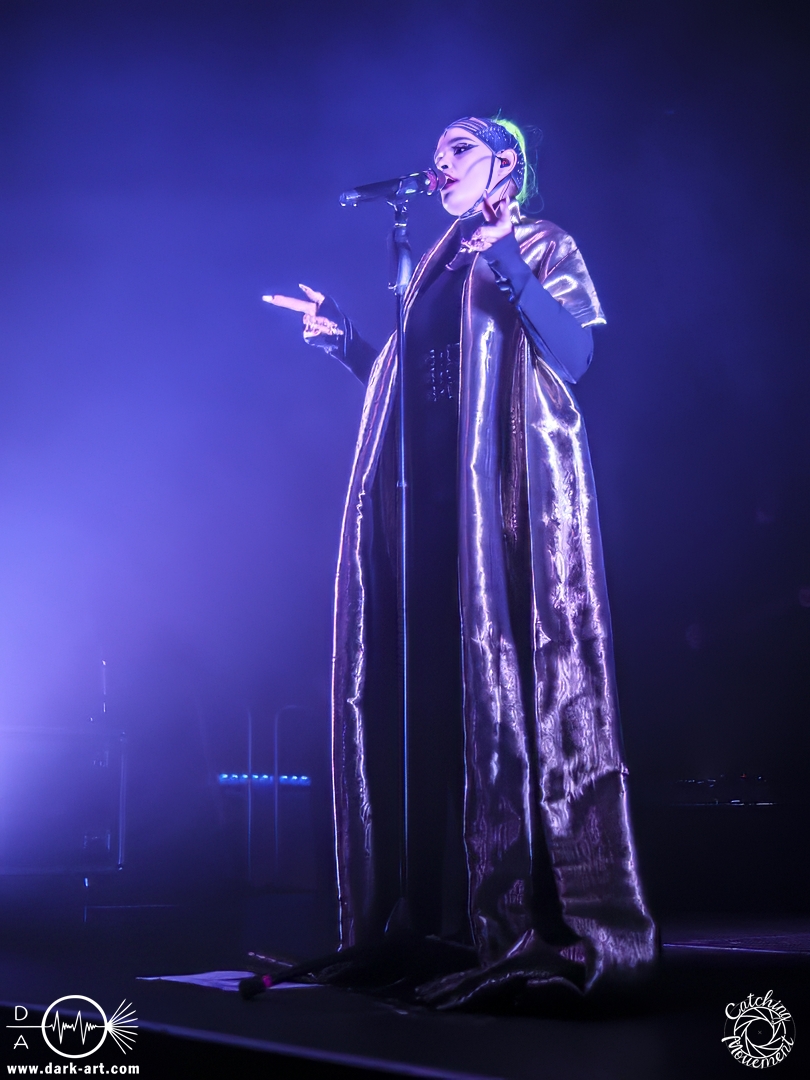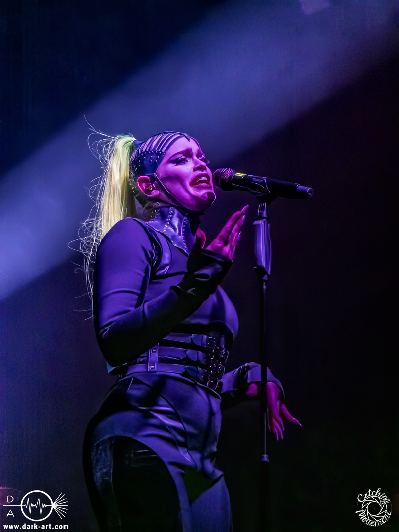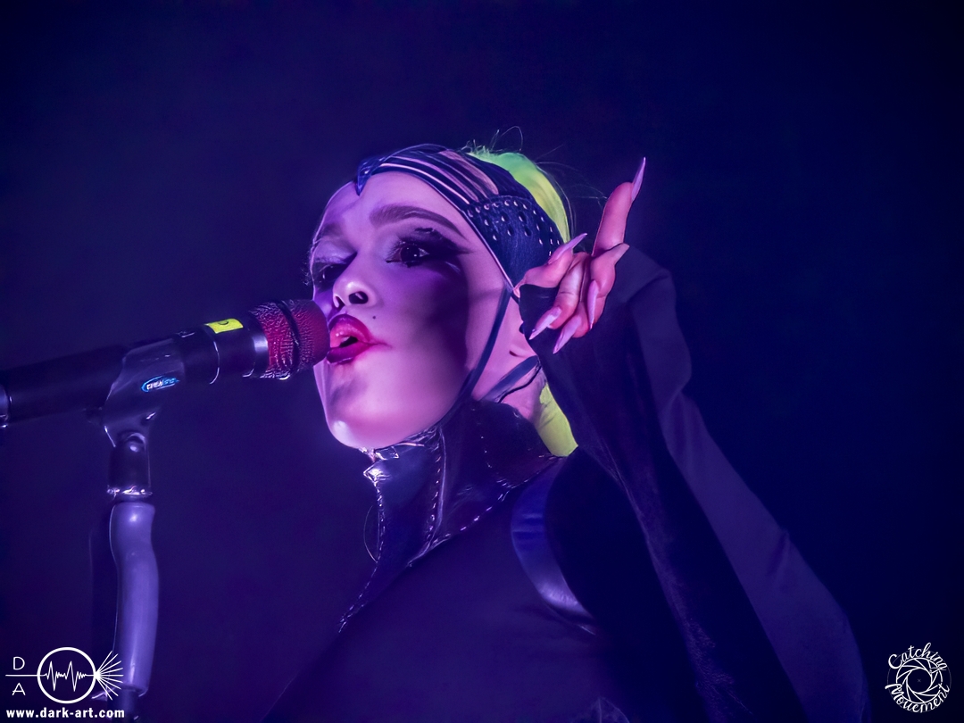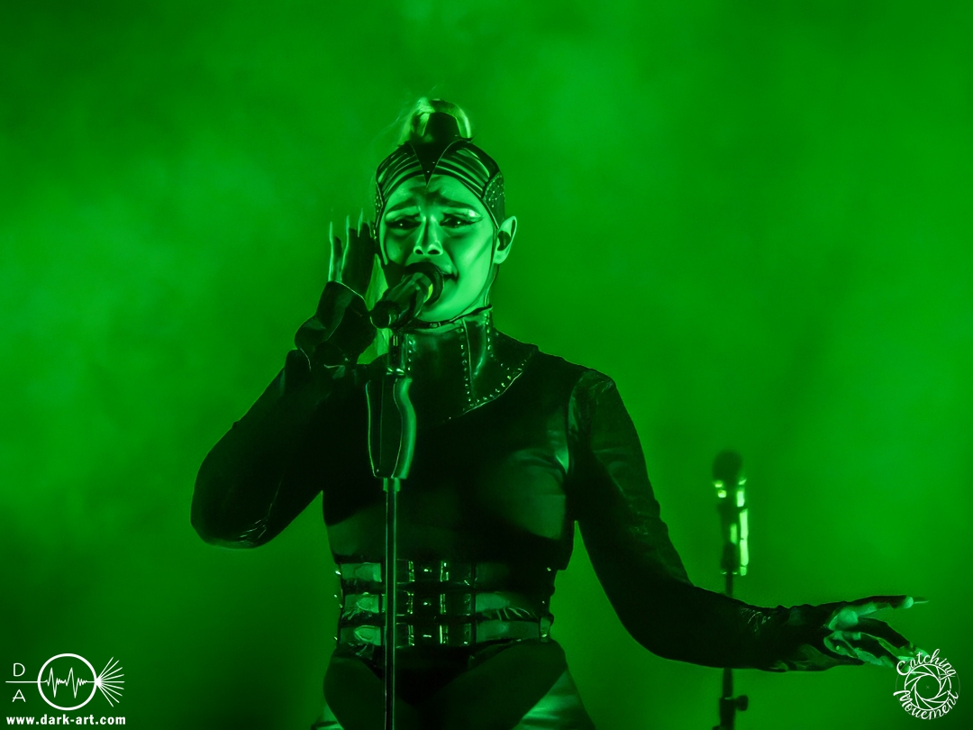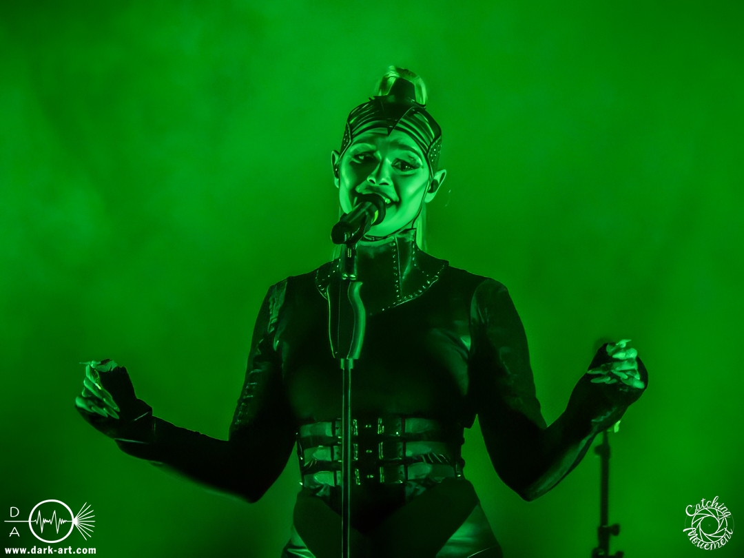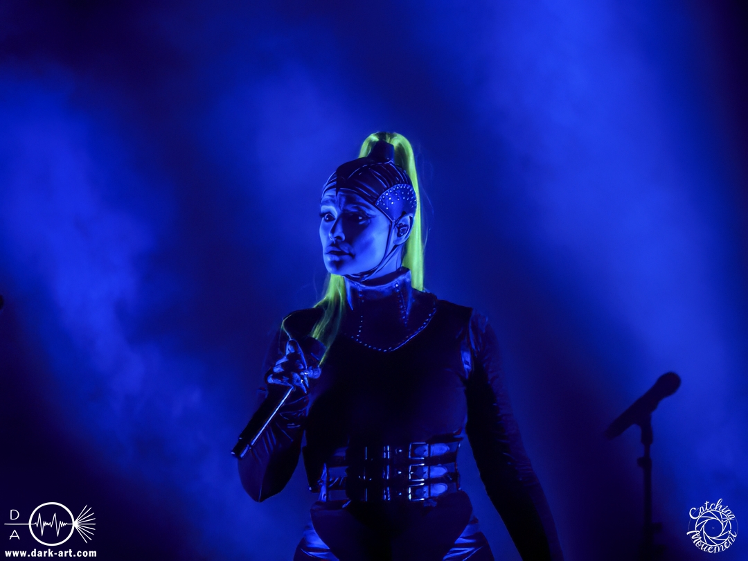 Pünktlich ging dann das Licht aus, der SKYND-Schriftzug im Hintergrund wurde rot angeleuchtet und das Intro erklang. Zunächst kam der Drummer auf die Bühne, anschließend Father, beide bekleidet mit Kapuzenumhängen und Masken tragend, damit man sie nicht erkennt. Skynd betrat dann unter Jubel die Bühne und es ging direkt mit Michelle Carter los. Die Künstlerin blieb nur am Mikro stehen und zeigte direkt ihr beeindruckendes Können. Wer nicht hinschaute, hätte locker davon ausgehen können, dass sich zwei, wenn nicht drei, singende Menschen auf Bühne befänden. Bei Elisa Liam kam sie dann auch etwas nach vorne auf die Boxen vor der Bühne und fixierte die Zuschauer der ersten Reihen während sie die Geschichte erzählte und mit ihrem „Ring, ding, down, ring-de-ding down“ richtig unangenehme Gänsehaut erzeugte. Für ihr neuestes Lied, Tamara Samsanova, besser bekannt als Granny Ripper oder Baba Yaga, bekam sie einen goldenen Umhang gebracht, denselben wie im Musikvideo. Während sie bei den beiden ersten Liedern noch relativ ruhig am Mikro stand, fing sie dann an mehr umherzulaufen und mit ihrem Ausdruck, den Armen und Händen die Atmosphäre zu verstärken.