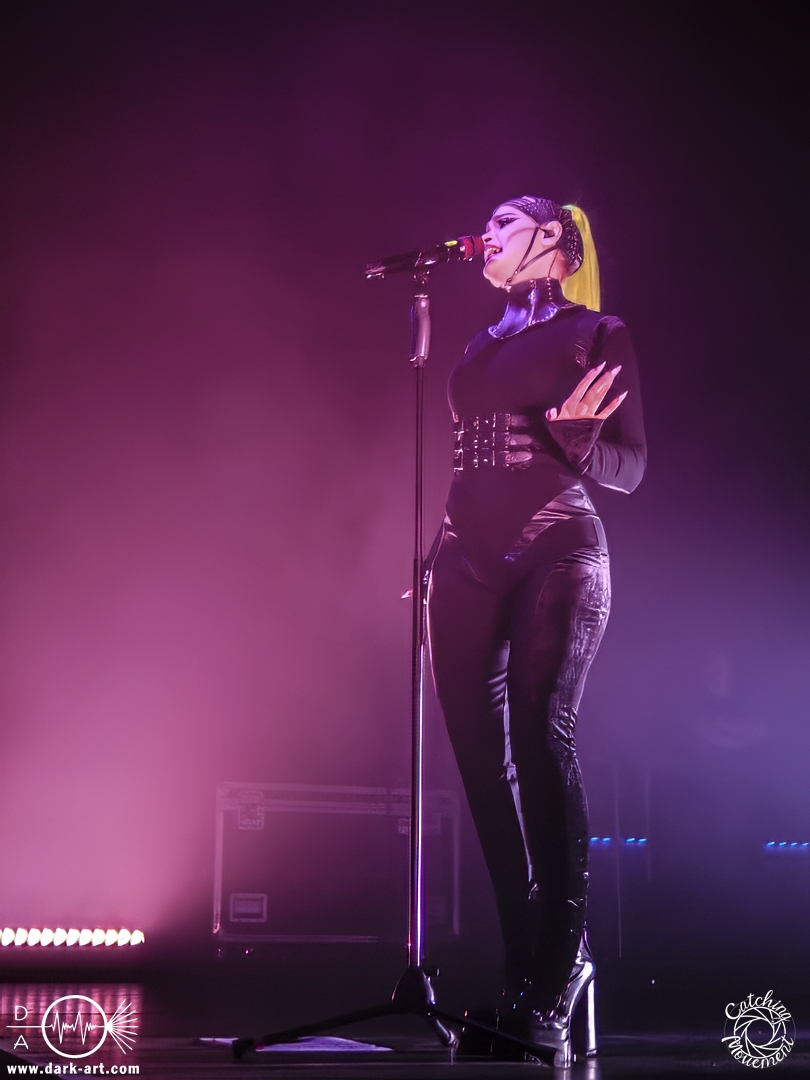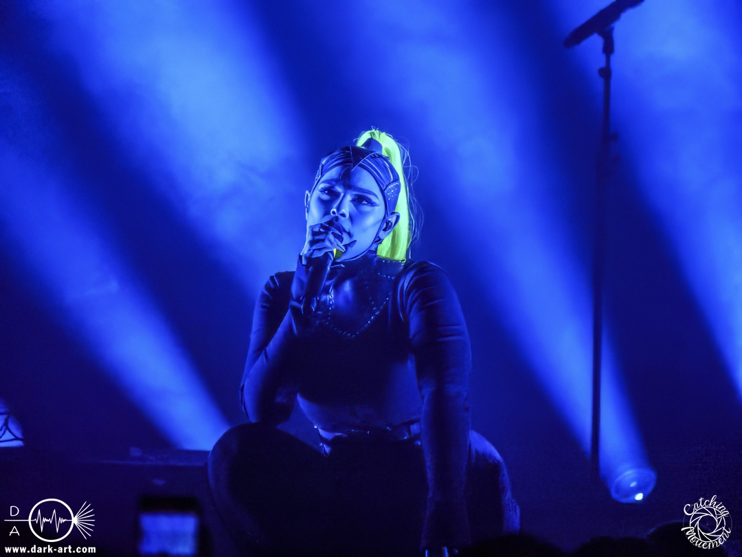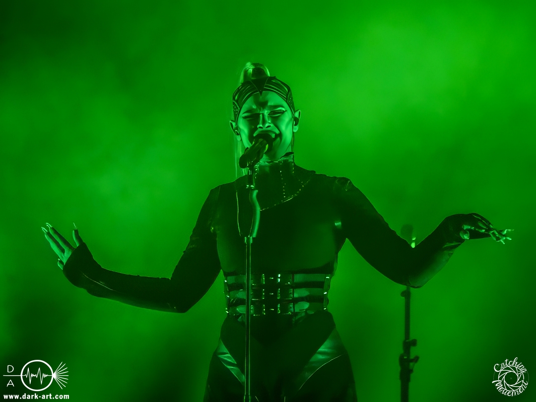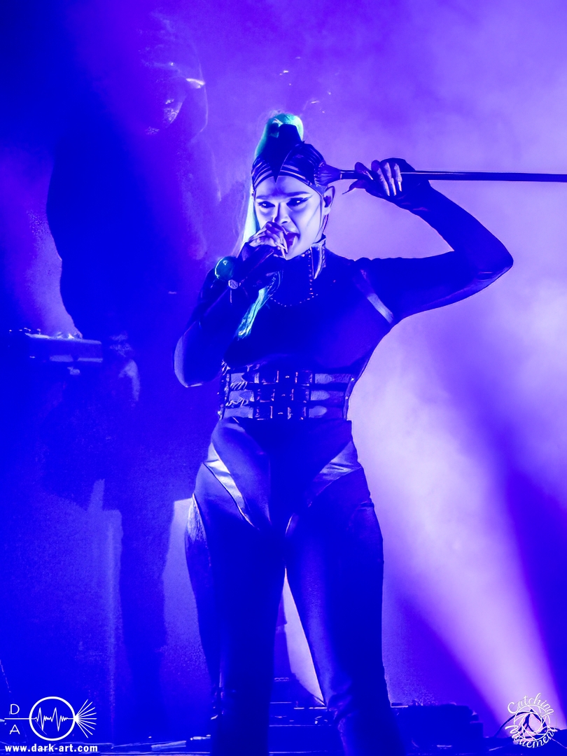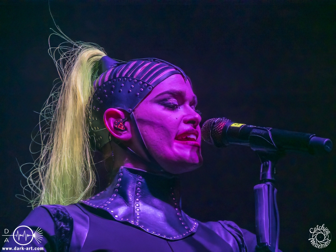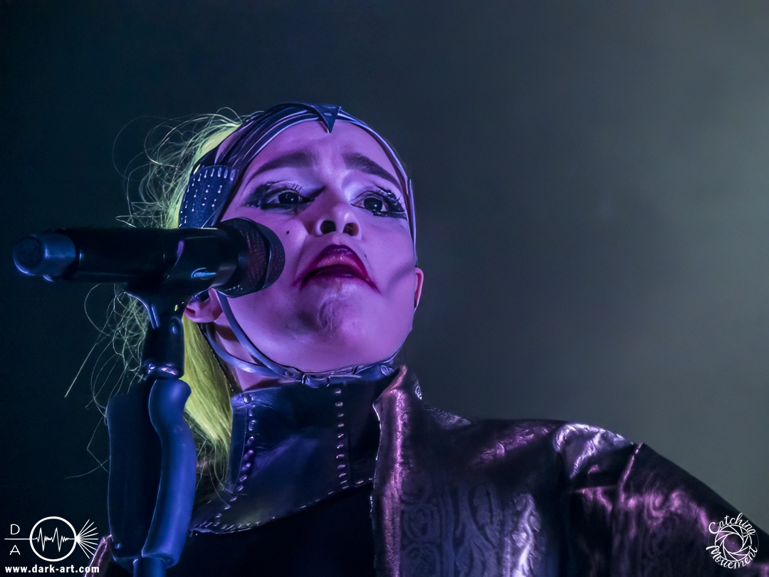 Pünktlich ging dann das Licht aus, der SKYND-Schriftzug im Hintergrund wurde rot angeleuchtet und das Intro erklang. Zunächst kam der Drummer auf die Bühne, anschließend Father, beide bekleidet mit Kapuzenumhängen und Masken tragend, damit man sie nicht erkennt. Skynd betrat dann unter Jubel die Bühne und es ging direkt mit Michelle Carter los. Die Künstlerin blieb nur am Mikro stehen und zeigte direkt ihr beeindruckendes Können. Wer nicht hinschaute, hätte locker davon ausgehen können, dass sich zwei, wenn nicht drei, singende Menschen auf Bühne befänden. Bei Elisa Liam kam sie dann auch etwas nach vorne auf die Boxen vor der Bühne und fixierte die Zuschauer der ersten Reihen während sie die Geschichte erzählte und mit ihrem „Ring, ding, down, ring-de-ding down“ richtig unangenehme Gänsehaut erzeugte. Für ihr neuestes Lied, Tamara Samsanova, besser bekannt als Granny Ripper oder Baba Yaga, bekam sie einen goldenen Umhang gebracht, denselben wie im Musikvideo. Während sie bei den beiden ersten Liedern noch relativ ruhig am Mikro stand, fing sie dann an mehr umherzulaufen und mit ihrem Ausdruck, den Armen und Händen die Atmosphäre zu verstärken.