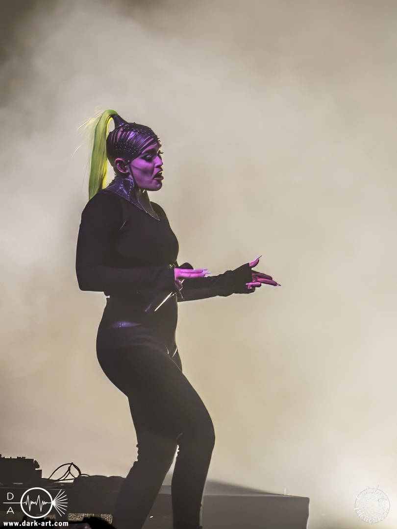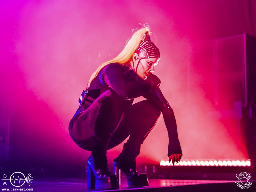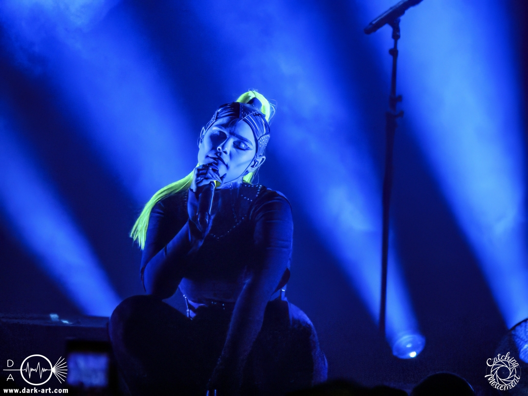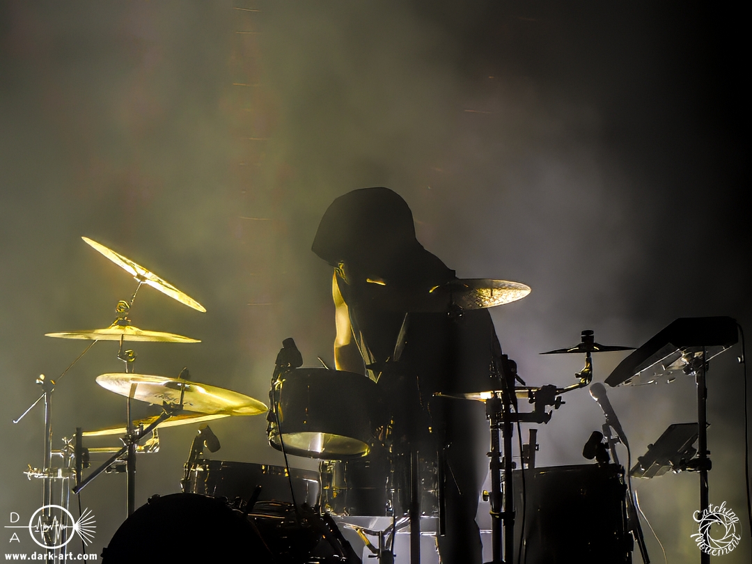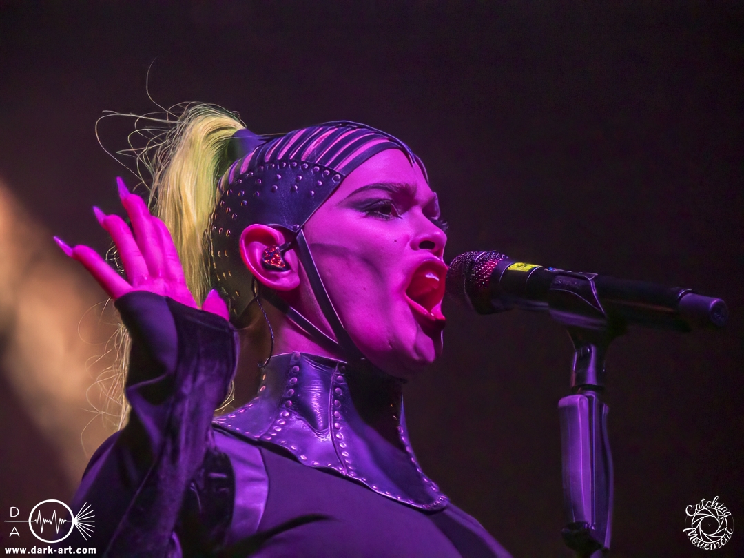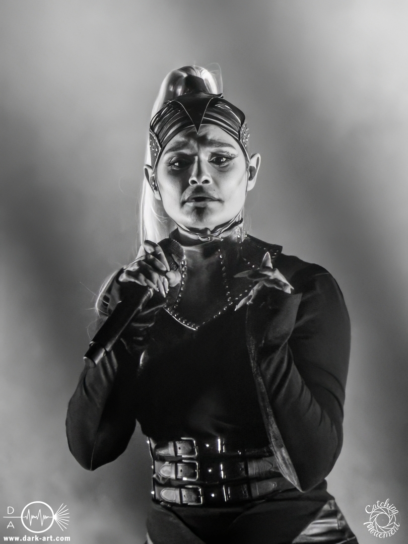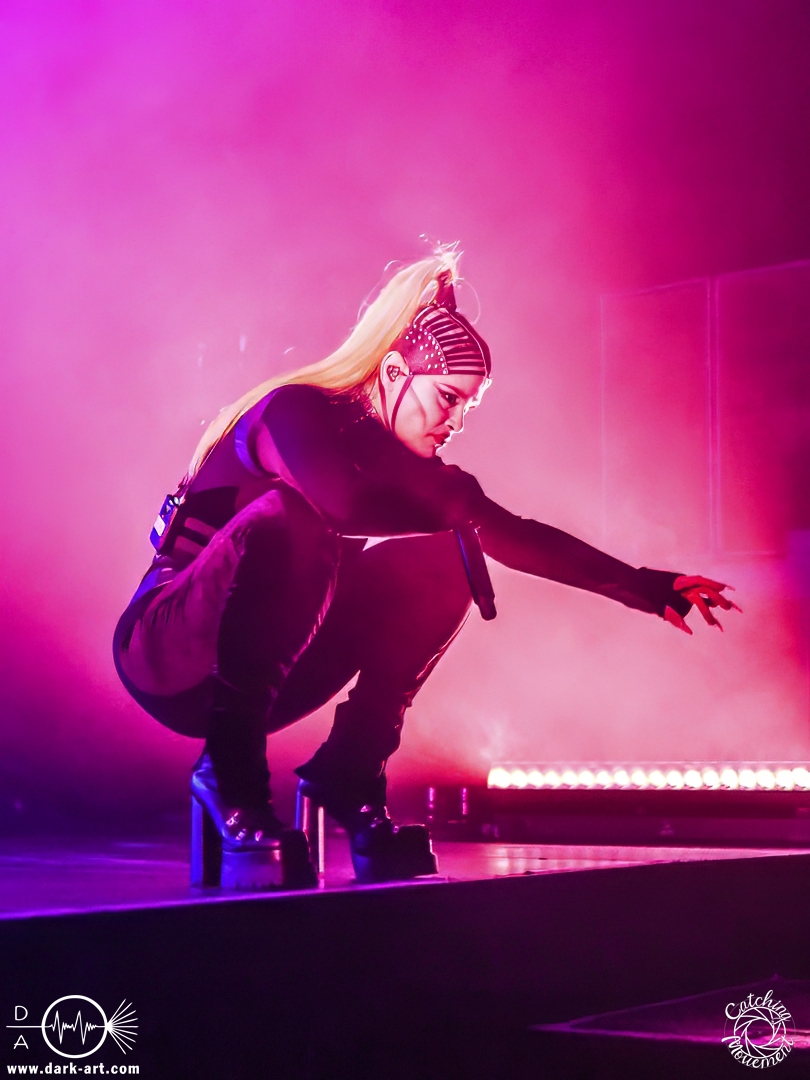 Pünktlich ging dann das Licht aus, der SKYND-Schriftzug im Hintergrund wurde rot angeleuchtet und das Intro erklang. Zunächst kam der Drummer auf die Bühne, anschließend Father, beide bekleidet mit Kapuzenumhängen und Masken tragend, damit man sie nicht erkennt. Skynd betrat dann unter Jubel die Bühne und es ging direkt mit Michelle Carter los. Die Künstlerin blieb nur am Mikro stehen und zeigte direkt ihr beeindruckendes Können. Wer nicht hinschaute, hätte locker davon ausgehen können, dass sich zwei, wenn nicht drei, singende Menschen auf Bühne befänden. Bei Elisa Liam kam sie dann auch etwas nach vorne auf die Boxen vor der Bühne und fixierte die Zuschauer der ersten Reihen während sie die Geschichte erzählte und mit ihrem „Ring, ding, down, ring-de-ding down“ richtig unangenehme Gänsehaut erzeugte. Für ihr neuestes Lied, Tamara Samsanova, besser bekannt als Granny Ripper oder Baba Yaga, bekam sie einen goldenen Umhang gebracht, denselben wie im Musikvideo. Während sie bei den beiden ersten Liedern noch relativ ruhig am Mikro stand, fing sie dann an mehr umherzulaufen und mit ihrem Ausdruck, den Armen und Händen die Atmosphäre zu verstärken.