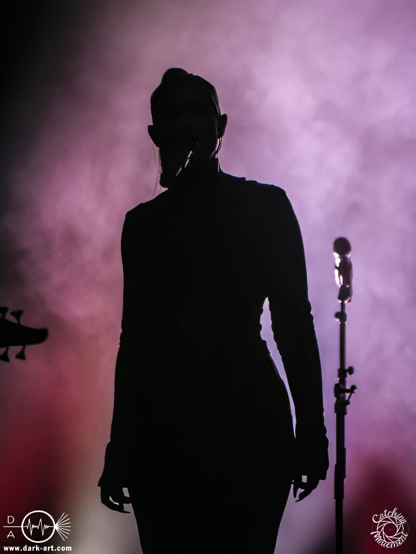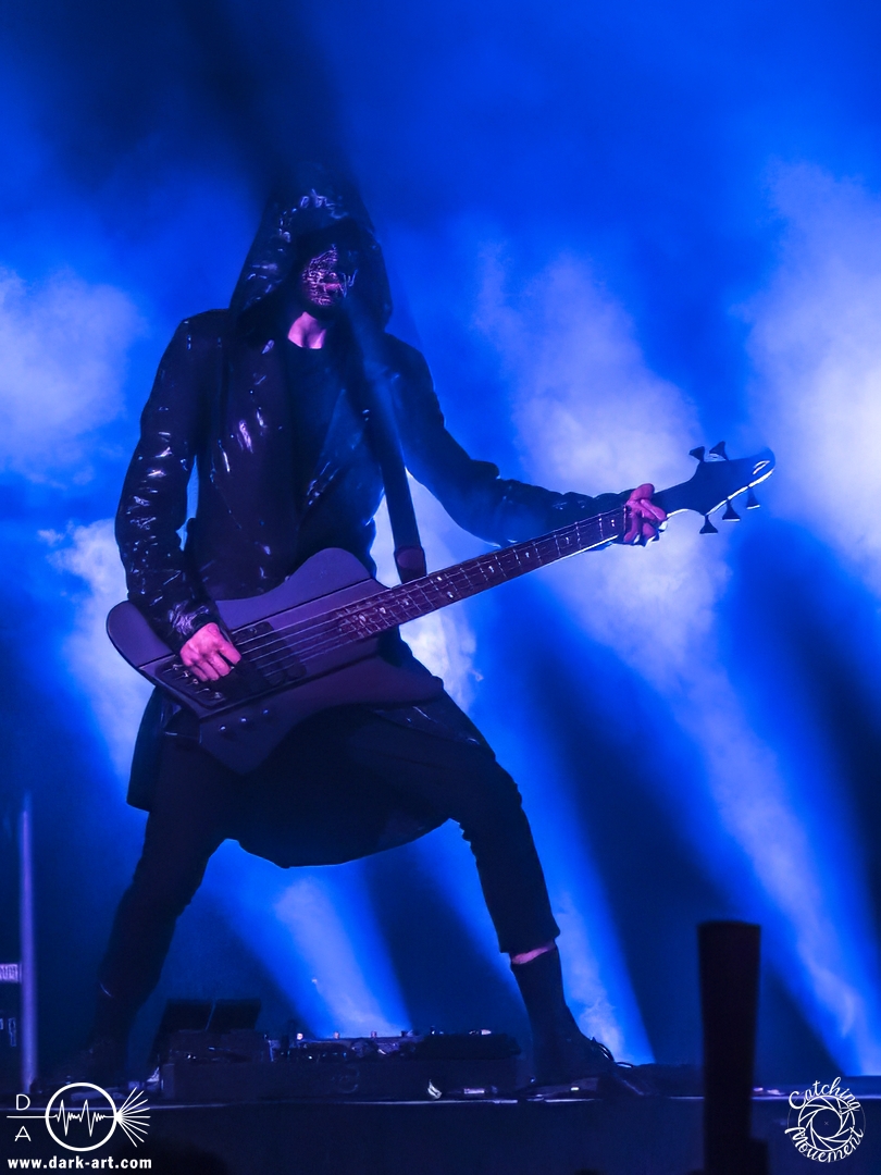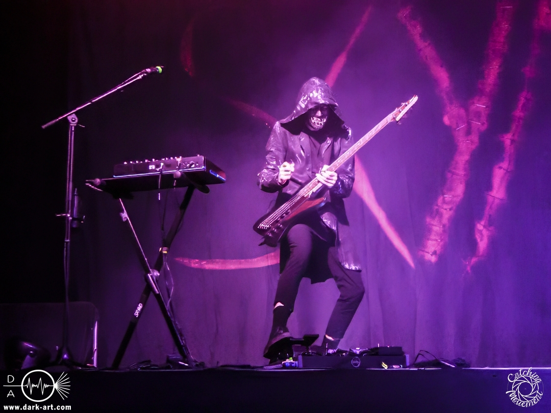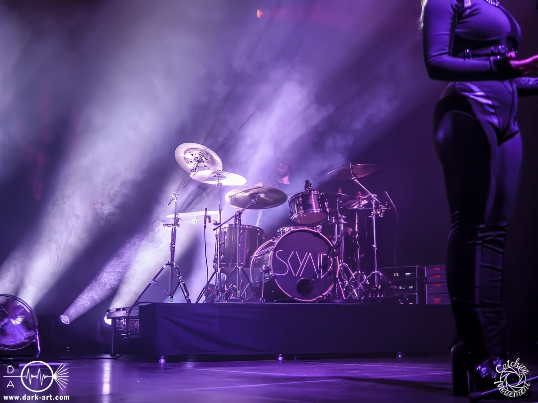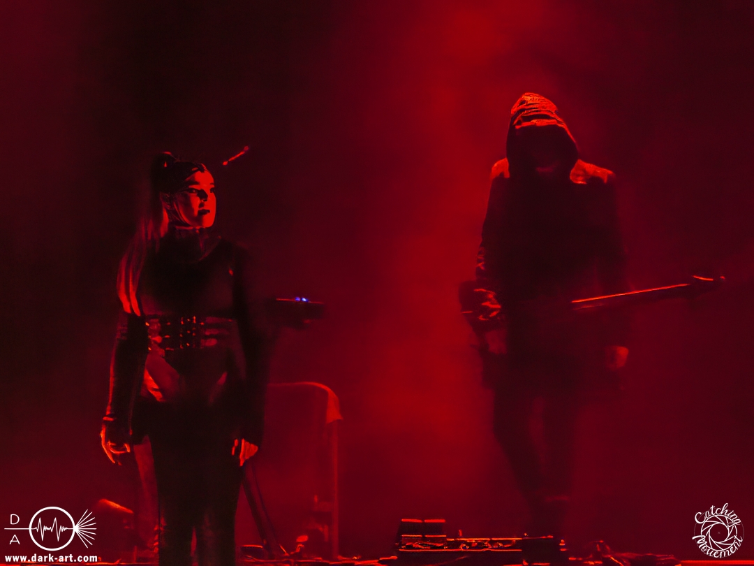 Für Armin Meiwes (aka der Kannibale von Rotenburg) hatte sie dann einen Gehstock in der Hand, welchen sie eindrucksvoll nutze, um die Stimmung deutlich zu machen, dabei wurde viel zwischen blauem und intensivem grünen Licht abgewechselt. Zu Edmund Kemper stand dann der Schlagzeuger zum ersten Mal auf, um im Stehen zu spielen. Dies wiederholte er dann auch im Laufe des Abends zu verschiedenen Liedern. Im Anschluss gab es eine kurze Verschnaufpause durch eine Transition begleitet durch Musik, bevor es dann mit Richard Ramirez weiter ging, einem 19-mal zum Tode verurteilten Serienmörder aus den USA, welcher auch als der Night Stalker bekannt war. Das Lied sorgte für eine etwas aufgekratzte Stimmung, durch die eher etwas rockigere Art und Weise. Zu Mary Bell zeigte Father, dass er nicht nur Bass spielen kann, sondern zeigte auch sein Können am Keyboard, zu einem Lied, welches in seiner Art, die besondere Grausamkeit der Geschichte hervorhebt und live noch mal eine Stufe stärker rüberkommt. Dasselbe galt auch für Columbine, welches für eine besonders verschreckende Stimmung gesorgt hat. Dabei hatte das stakkatoartig gesungene „Ra-ta-ta-ta-ta-ta“ einen besonderen Einfluss, da es live noch mal eine Stufe grausamer klingt. Für Tyler Jadley kam Father runter von seinem Podest und spielte neben Skynd. Mit Mikhail Popkov endete dann der Abend, von dem besonders die facettenreiche Ausdrucksweise von Skynd in Erinnerung bleiben wird, mit welcher sie die verschiedenen Momente besonders gut betonte, neben der eh schon durch die Musik erzeugten Atmosphäre und Stimmung, welche sehr gut zu den Geschichten passte. Die Band wurde dann unter großem Applaus, ohne Zugabe, verabschiedet. Der Abend war noch jung, was aber auch gut war, so konnte man sich noch von den teils verstörenden Geschichten erholen.