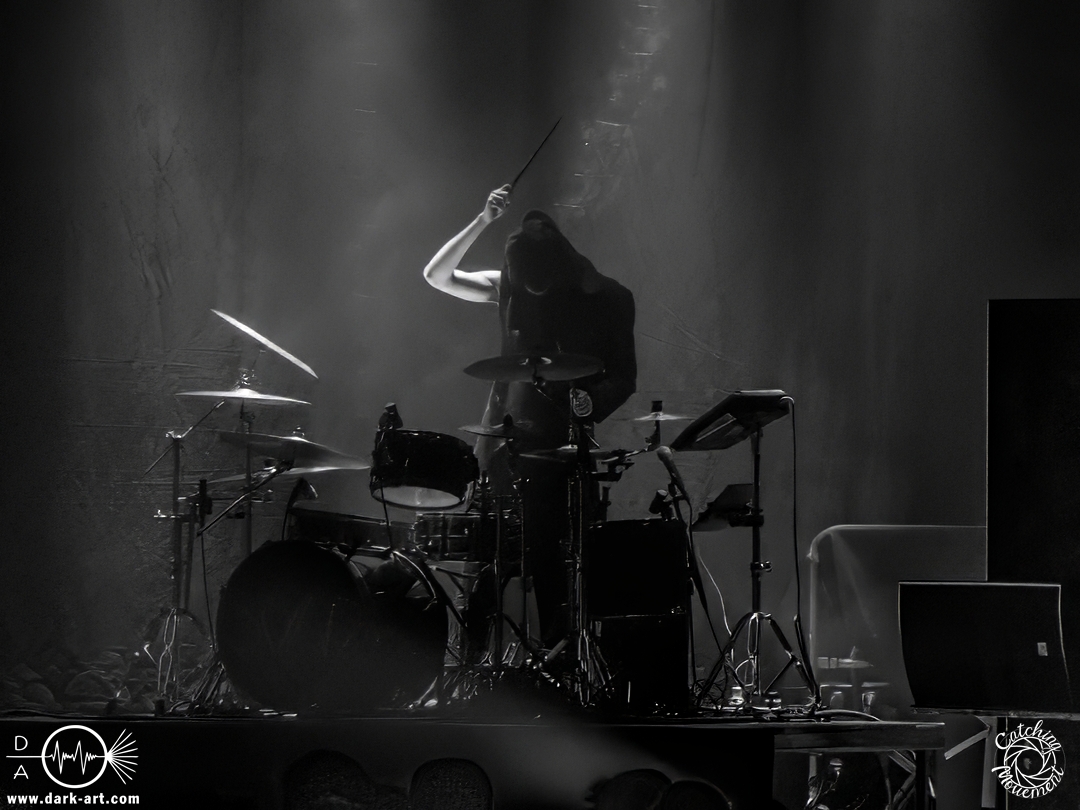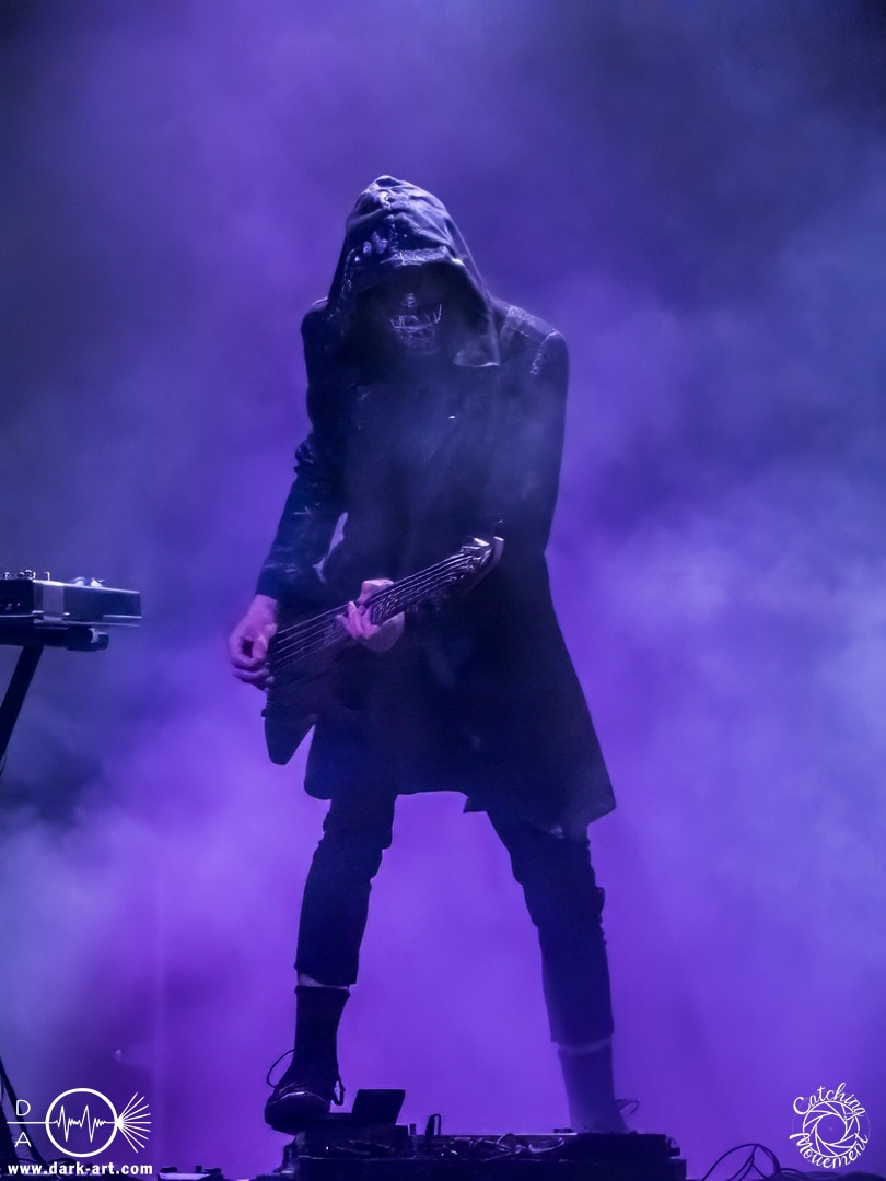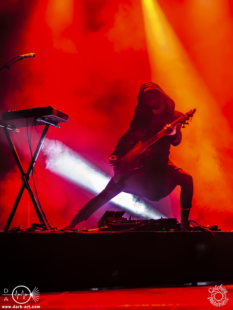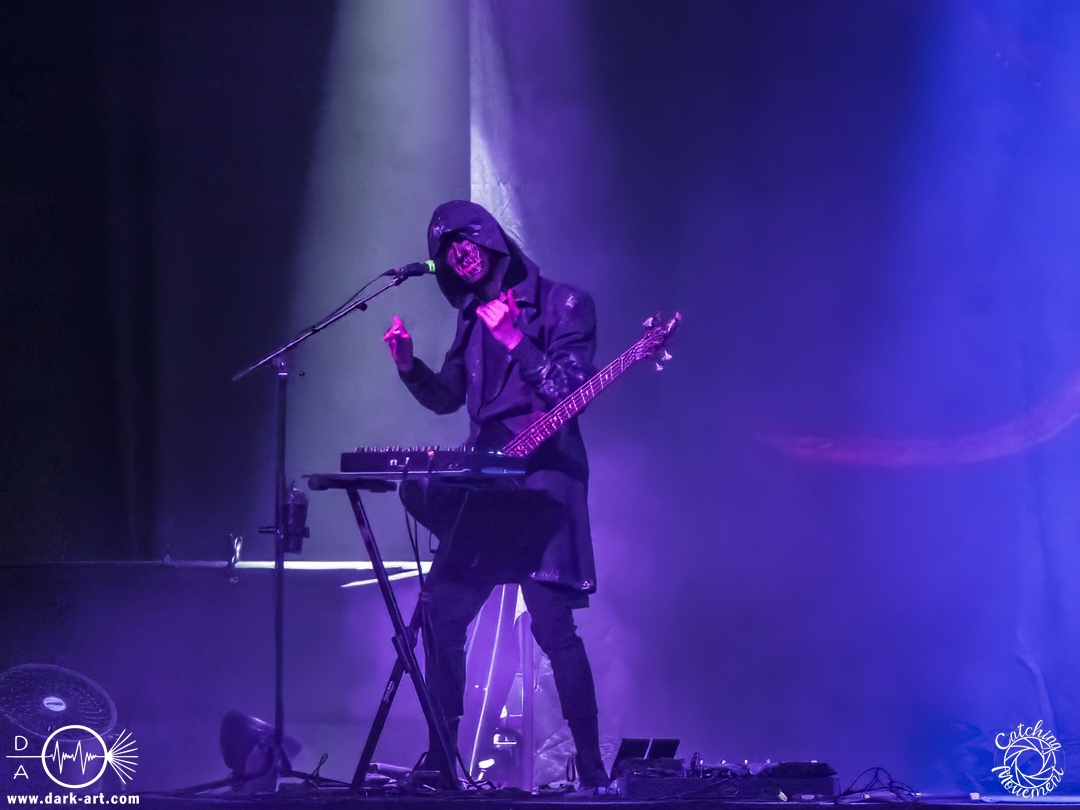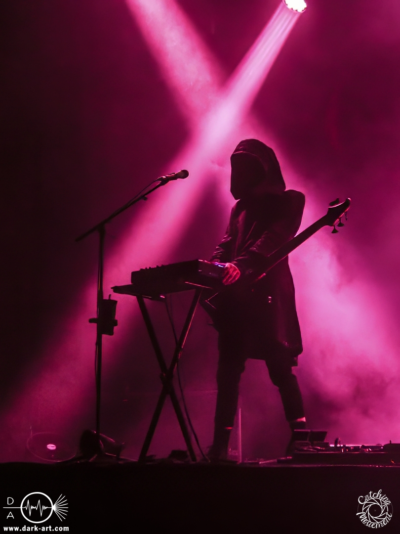 Für Armin Meiwes (aka der Kannibale von Rotenburg) hatte sie dann einen Gehstock in der Hand, welchen sie eindrucksvoll nutze, um die Stimmung deutlich zu machen, dabei wurde viel zwischen blauem und intensivem grünen Licht abgewechselt. Zu Edmund Kemper stand dann der Schlagzeuger zum ersten Mal auf, um im Stehen zu spielen. Dies wiederholte er dann auch im Laufe des Abends zu verschiedenen Liedern. Im Anschluss gab es eine kurze Verschnaufpause durch eine Transition begleitet durch Musik, bevor es dann mit Richard Ramirez weiter ging, einem 19-mal zum Tode verurteilten Serienmörder aus den USA, welcher auch als der Night Stalker bekannt war. Das Lied sorgte für eine etwas aufgekratzte Stimmung, durch die eher etwas rockigere Art und Weise. Zu Mary Bell zeigte Father, dass er nicht nur Bass spielen kann, sondern zeigte auch sein Können am Keyboard, zu einem Lied, welches in seiner Art, die besondere Grausamkeit der Geschichte hervorhebt und live noch mal eine Stufe stärker rüberkommt. Dasselbe galt auch für Columbine, welches für eine besonders verschreckende Stimmung gesorgt hat. Dabei hatte das stakkatoartig gesungene „Ra-ta-ta-ta-ta-ta“ einen besonderen Einfluss, da es live noch mal eine Stufe grausamer klingt. Für Tyler Jadley kam Father runter von seinem Podest und spielte neben Skynd. Mit Mikhail Popkov endete dann der Abend, von dem besonders die facettenreiche Ausdrucksweise von Skynd in Erinnerung bleiben wird, mit welcher sie die verschiedenen Momente besonders gut betonte, neben der eh schon durch die Musik erzeugten Atmosphäre und Stimmung, welche sehr gut zu den Geschichten passte. Die Band wurde dann unter großem Applaus, ohne Zugabe, verabschiedet. Der Abend war noch jung, was aber auch gut war, so konnte man sich noch von den teils verstörenden Geschichten erholen.