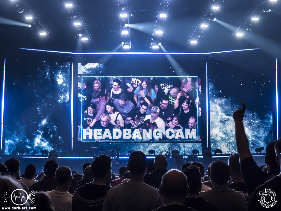 Der Übergang zum Auftritt von The Offspring wurde in der Festhalle Frankfurt mit einer unterhaltsamen Umbaupause inszeniert. Ein Zeppelin schwebte über die erste Hälfte des Publikums, ausgestattet mit Kamera und einem auffälligen Werbebanner: „Fuck yeah“. Ein Stadionsprecher animierte die Zuschauenden zu verschiedenen Aktionen. Auf der Bühne erschien ein Affe in einer Offspring-Kutte – der Auftakt zu einer Reihe interaktiver Kameraformate: Action-Cam, Sing-Cam, Boot-Cam und mehr. Besonders die Look-Likes-Cam, bei der Stars, Comicfiguren und Filmszenen eingeblendet wurden, sorgte für Heiterkeit. Das Highlight bildete die Kiss-Cam, deren Reaktionen von echten Küssen bis zu pantomimischen Einlagen reichten. Die Umbaupause verging dank dieser kreativen Einlagen wie im Flug.