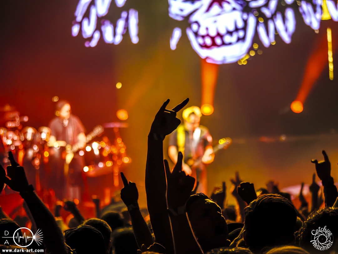 Die Festhalle Frankfurt wurde dunkel, Skelette tanzten auf den LED-Bildschirmen und Thunderstruck von AC/DC erschallte. Mit Countdown, „Make some noise!“-Rufen und dem Affen wurde die Stimmung angeheizt. Das Intro verdunkelte die Bühne, Drums und Licht stimmten ein – die Band kam auf die Bühne. Mit Come Out and Play eröffnete die Punk-Sause. Ab dem ersten Song entstanden Moshpits im Innenraum, die sich nur bei ruhigeren Songs kurz beruhigten. Es war ein Fest, dem Cardio-Training im Innenraum zuzusehen.