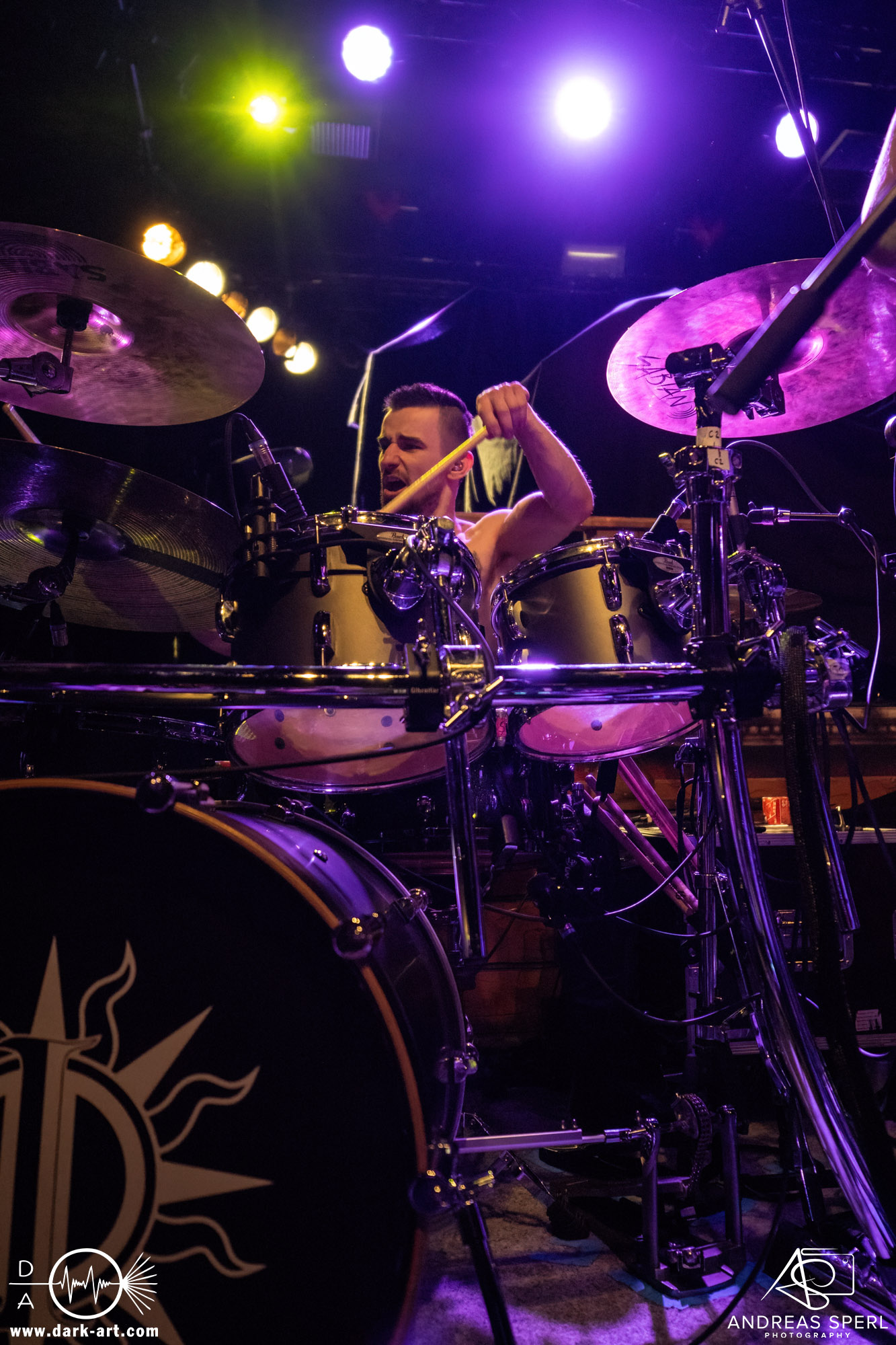 Nachdem Induction ihre Instrumente abgebaut hatten, wurde es Zeit herauszufinden, welche Band als nächstes auftreten würde. Warkings und Visions of Atlantis tauschten im Verlauf der Tour regelmäßig den Headliner-Slot, und auch wir im Team wussten nicht, wer in Berlin zuerst spielen würde. Als die Plane fiel, kamen Planken, eine Reling und mittig platzierte Drums zum Vorschein: Visions of Atlantis eröffneten an diesem Abend den Reigen.