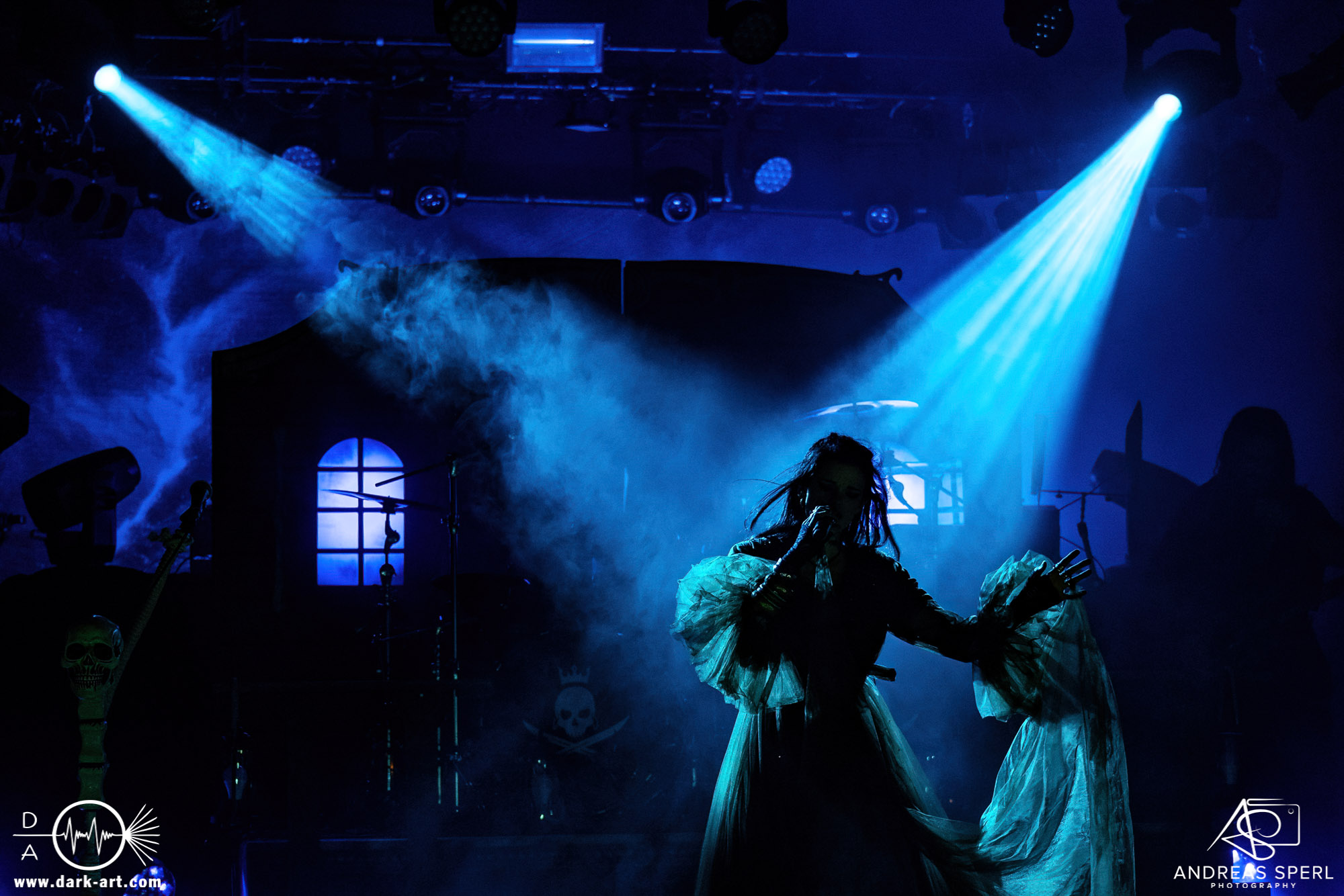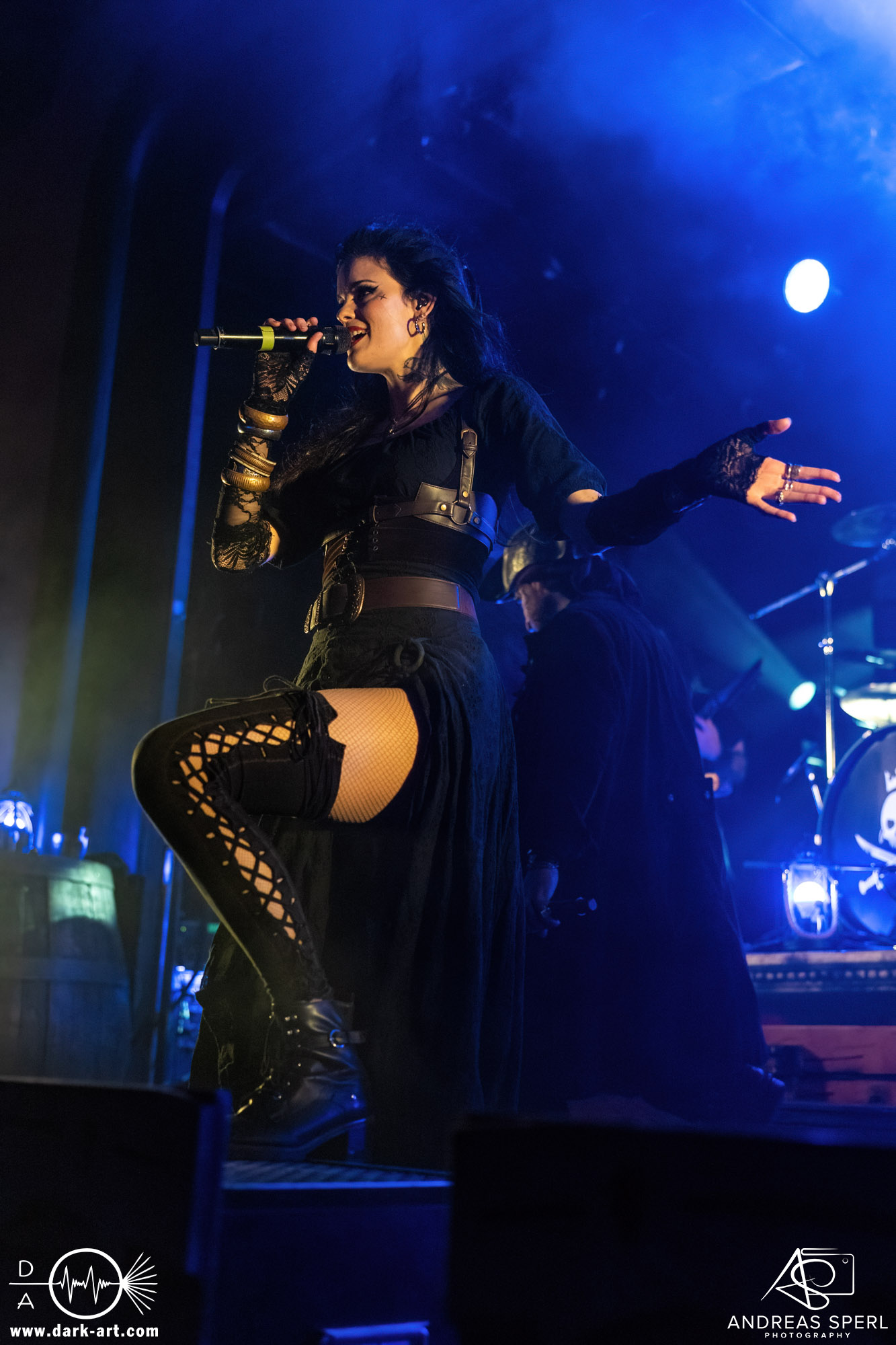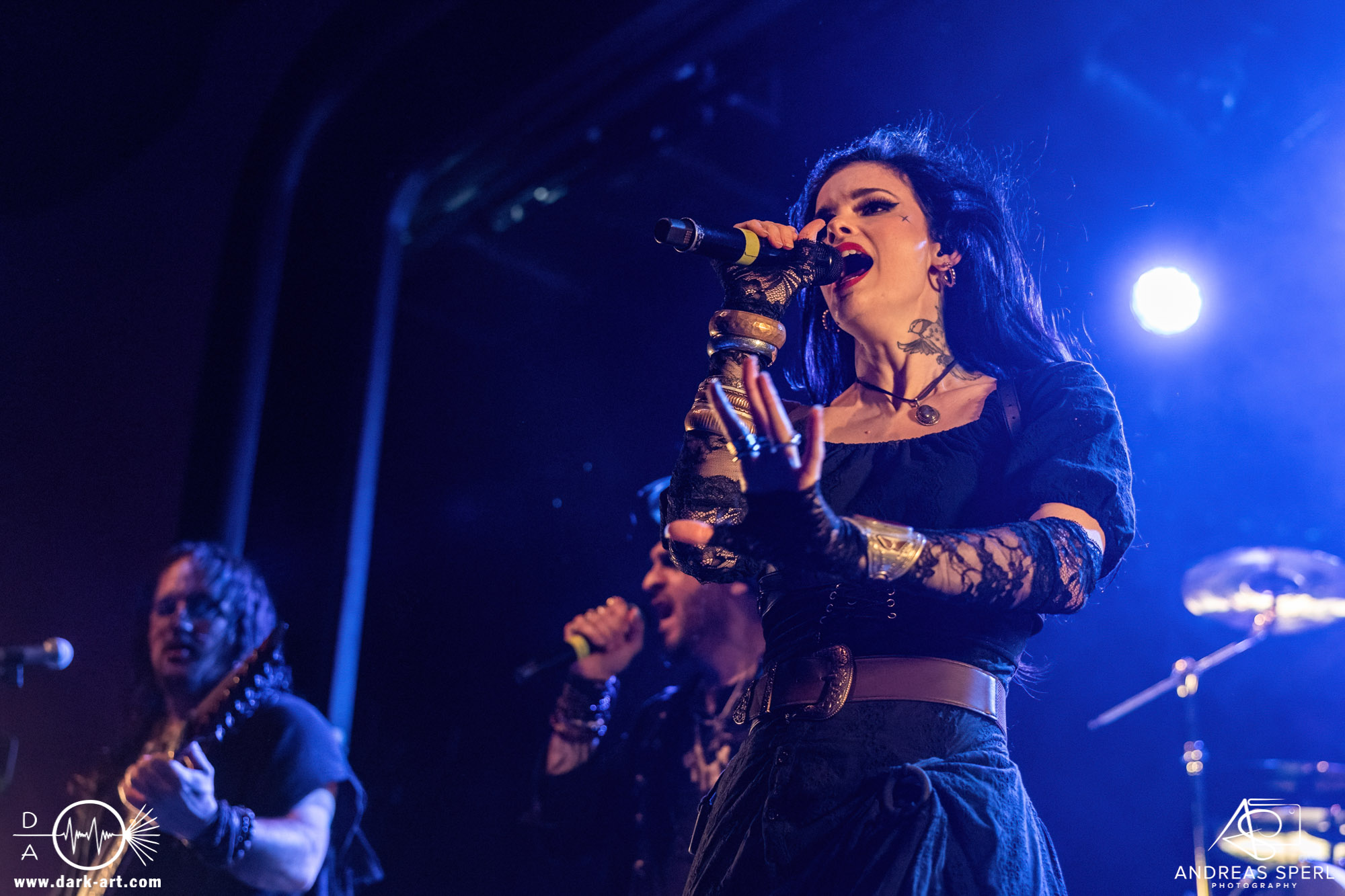 Passend zur Tour holten die uralten Kriegerlegenden für Pirates and Kings die Seefahrer*innen von Visions of Atlantis zurück auf die Bühne. Clémentine trug zu ihrem Dreispitz ein langes rotes Kleid. Gemeinsam mit ihren Gitarristen Dushi und dem Sänger Michele Guaitoli standen nun drei weitere Personen auf der Bühne, wodurch es schlagartig hektisch und unübersichtlich wurde. Die vier Sänger*innen interagierten untereinander und mit den übrigen Musiker, und an jeder Ecke der Bühne geschah etwas, sodass ich unmöglich alles gleichzeitig erfassen konnte.