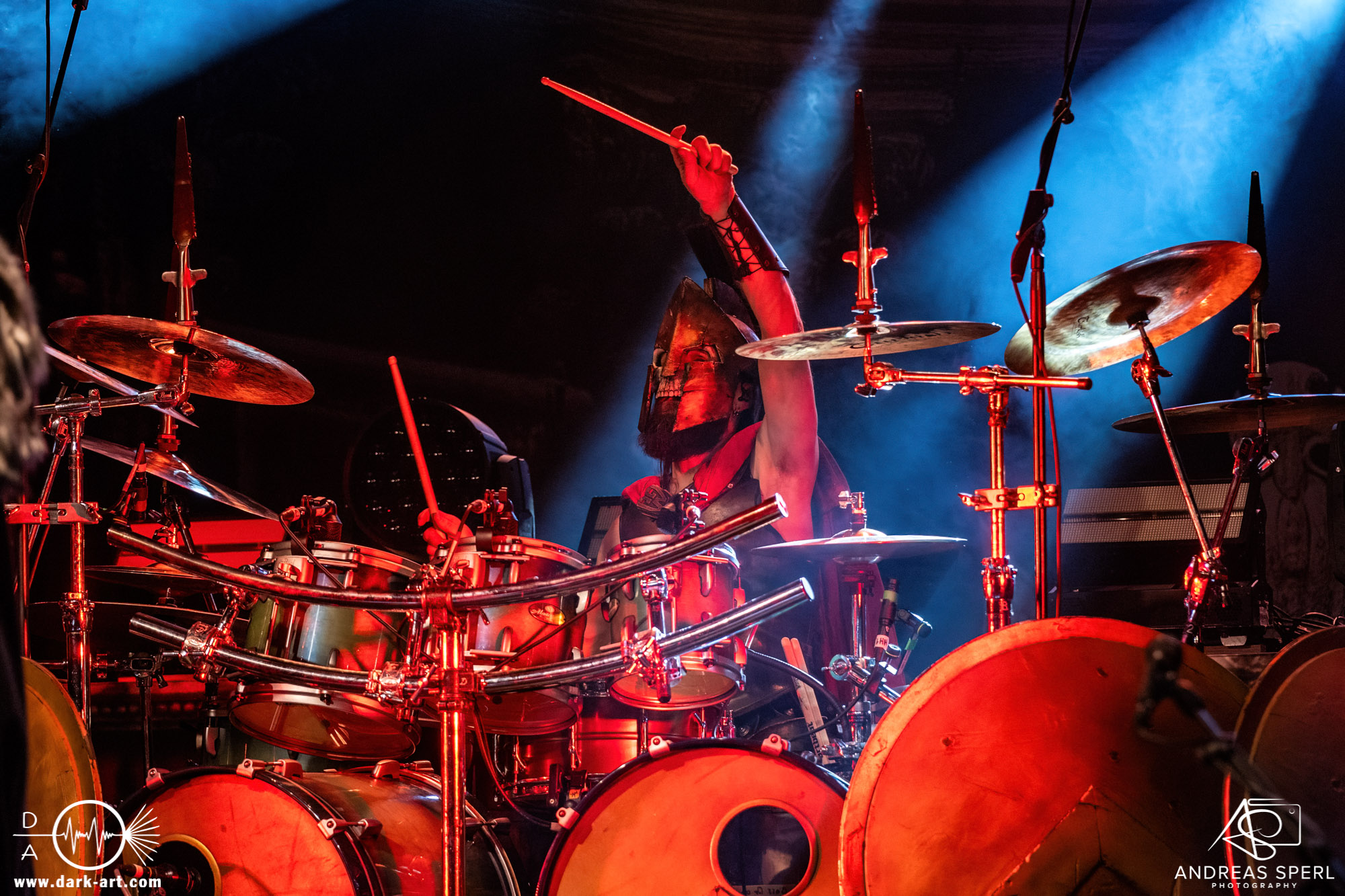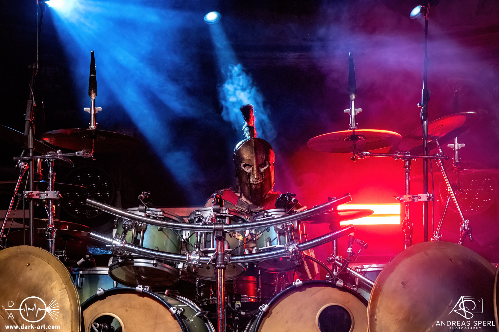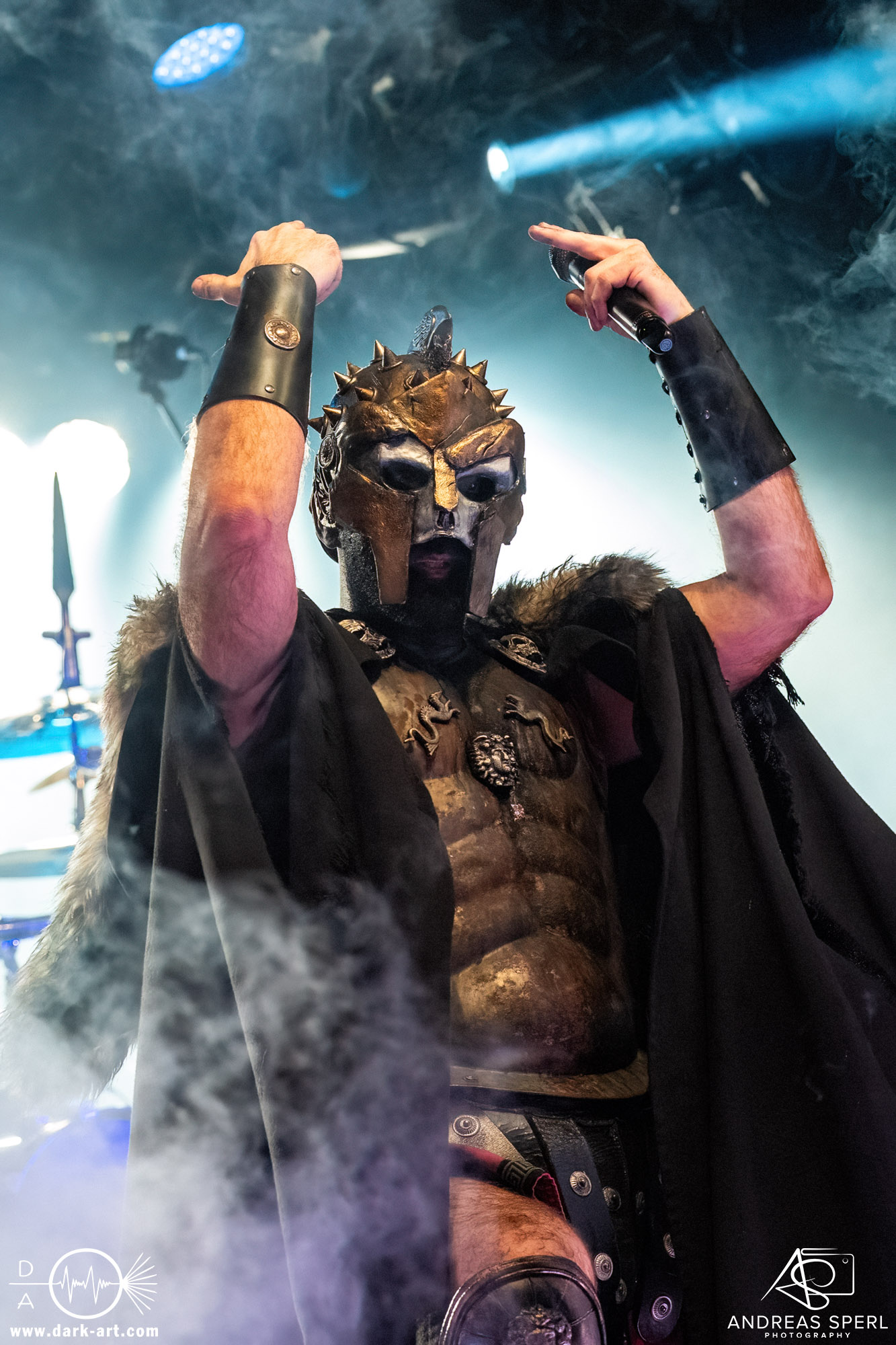 Das Schiff wurde zurück ins Trockendock geschoben, und stattdessen entstanden auf der Bühne die Hallen alter Krieger. Römische Standarten und spartanische Schilde am Schlagzeug kündigten das bevorstehende Konzert an. Um die Stimmung weiter anzuheizen, lief Manowar aus den Lautsprechern, und die Halle sang lautstark mit. Ich war dabei nicht der Einzige, der die Arme in der bekannten Pose über den Kopf hielt.