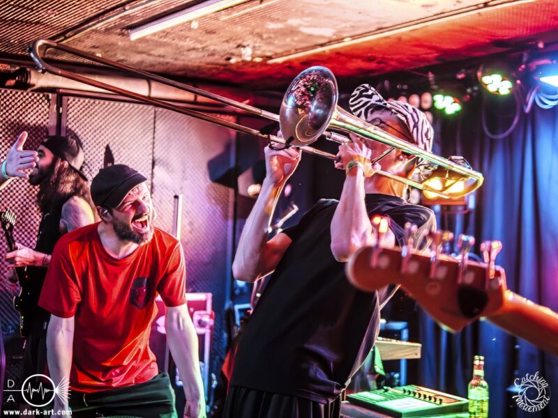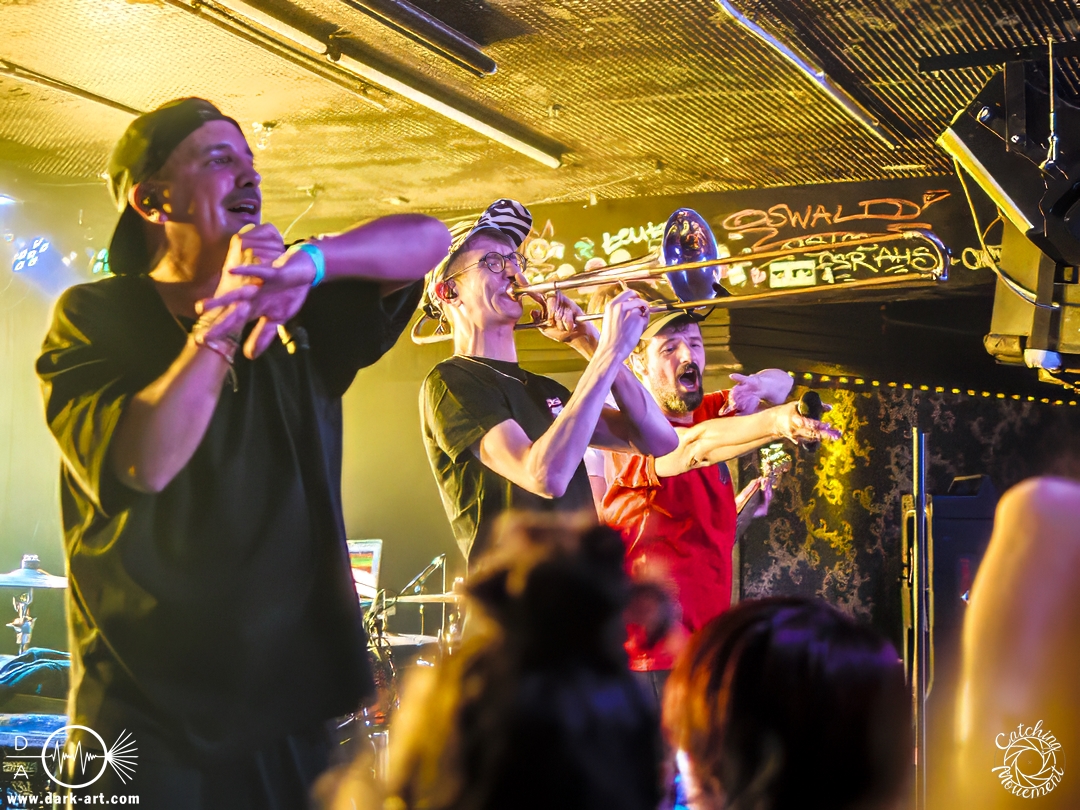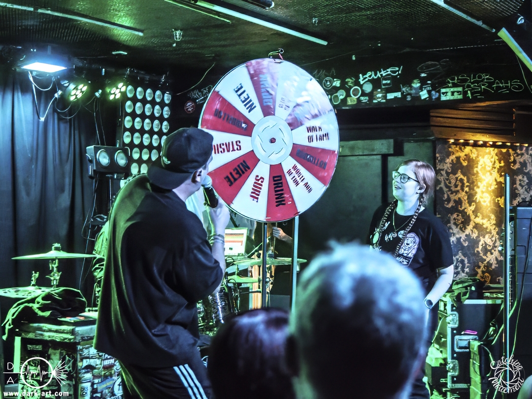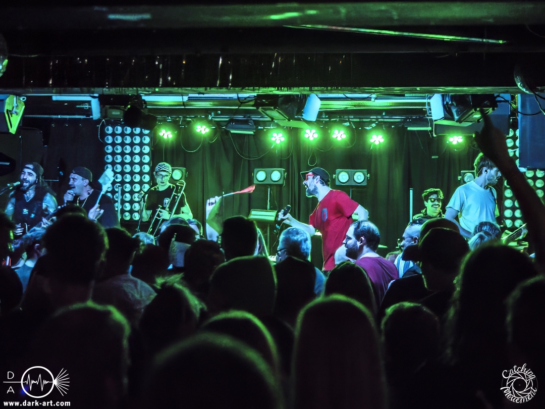 Doch dann brauchte die Band doch mal eine Pause und baute ein Spiel ein. Ein Spiel mit einem Rad, an welchem man drehen konnte und verschiedene Dinge gewinnen konnte. Oder auch nichts, wenn man auf Niete landete. Nun, das Rad wurde dreimal gedreht, zweimal gab es eine Niete und nur einmal gewann jemand etwas. Und genau diese Person hatte an dem Abend sogar noch Geburtstag und sie gewann zwei Rubbellose… welche sie auch gleich freirubbelte und gigantische ein (!!!) Euro gewann. Der Abend war gerettet. Feiernd ging es dann weiter, und bei Gepäckträger gab es dann sogar eine spontane Wall of Death im Publikum, ohne dass die Band dazu aufrief. Danach, natürlich nach einer kurzen Pause, kam die Zugabe und was für eine. Viele kleine „20 Jahre Le Fly“ Minifähnchen wurden im Publikum geschwenkt, auf der Bühne eine großes „Le Fly Tanzmusik“ Banner. Zum Abschluss wurde dann zum Party Train aufgerufen mit Señorita Bam Bam. Es war Zeit für die Polonaise. Einer im Publikum wurde ausgedeutet und vorausging, alle sollten sich hinten dran hängen. Schmiddlfinga sprang, bzw. im Nachtleben eigentlich eher, stieg, dann als erster von der Bühne und mischte sich irgendwo mitten rein in die Schlange. Und irgendwie bewegte sich diese dann durch das ausverkaufte Haus, dann auch mit Hampi irgendwo drin. Den Überblick zu behalten und zu sehen, wo die zwei waren, war nicht mehr möglich. Aber auch nicht wichtig, MKS mischte sich in der Zwischenzeit auch dazu und macht die Bühne voll. Damit war das Konzert auch fertig. Eigentlich, denn beide Bands beendeten dann den Abend mit einer spontan aufgeführten Choreo zu Felicità und Samba de Janeiro. Damit war dann die fast 2 Stunden andauernde Party zu Ende.