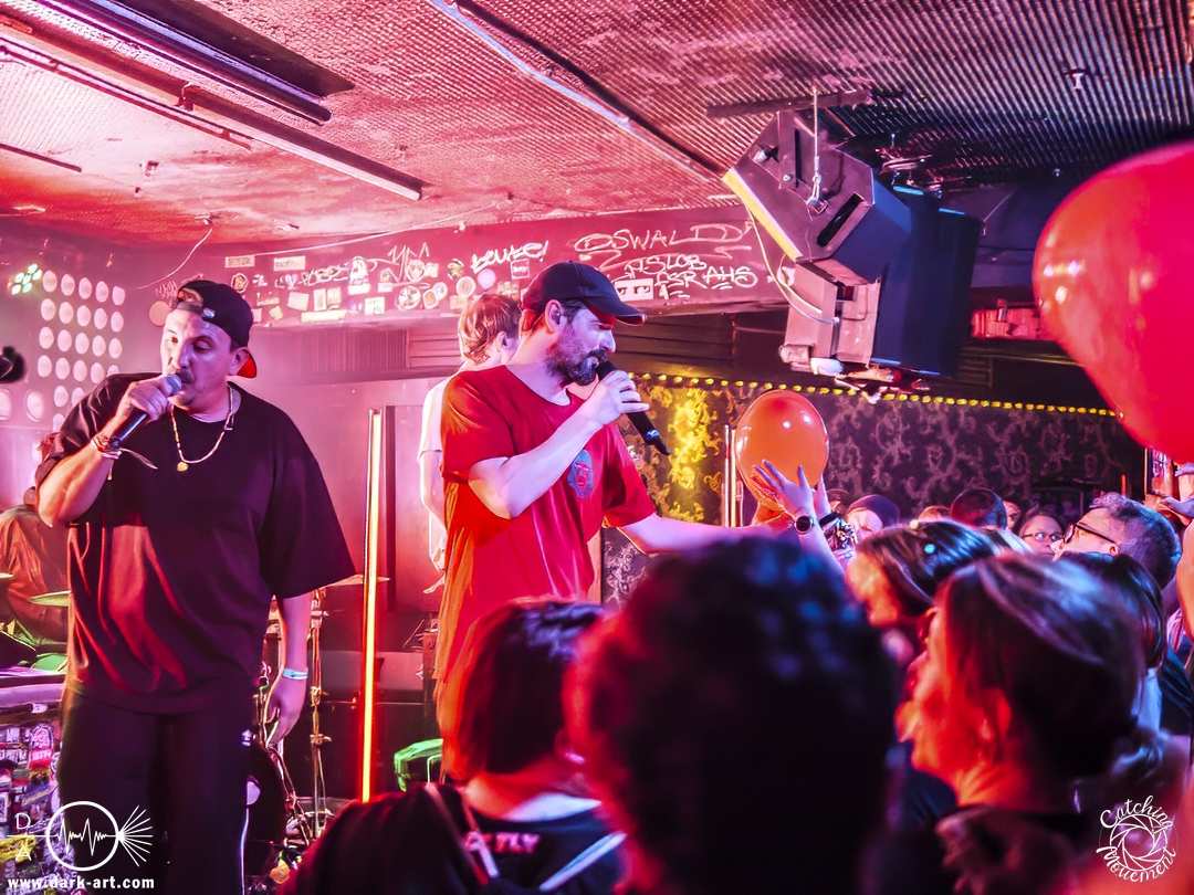 Und dann ging es los mit der Tanzmusik. Gleich ab dem ersten Ton hatte die Band die Menschen unter Kontrolle. Dem „Jump! Jump! Jump!“ folgte der ganze Saal und es bebte förmlich. Es wurde viel getanzt und auch gemosht, Bier wurde durch die Luft geschleudert. Party halt. Die Band steht neben Party, aber auch für mehr Zusammenhalt und Verbindung. Was sie auch einforderte, „Wir wollen uns alle etwas mehr verbinden. Vorher alle Hände hoch links und rechts die Hände der anderen greifen und die Welle machen mit den Armen der Nachbarn.“ Und weiter ging es. Aber auch gemeinsames Tanzen war angesagt, alle tanzten gleichzeitig nach links und zurück nach rechts. Und mitten drin Schlagzeuger Benedikt von MKS. Und die Specials im Publikum rissen nicht ab, gab es bei Mutter Natur Knicklichter fürs Publikum, flog ein aufblasbares Flugzeug mit der Aufschrift Le Fly über das Publikum bei Fliegen. Ein Lied, welches schon 2005 auf dem allerersten Konzert der Band gespielt wurde. Nicht nur ein 20-jähriges Lied gab es zu hören, auch ein Fan welcher seit 20 Jahren dabei ist, sprang auf die Bühne, schnappte sich das Mikro von Hampi und rappte, als ob er nie was anderes gemacht hatte und schon immer Teil der Band ist. L’amour wurde durch Herzluftballons und einer „Kein Bock auf Nazis“ Fahne auf der Bühne bekräftigt. Bis dahin eine Show ohne Pause, sehr schweißtreibend, aber mit viel Laune und Spaß.