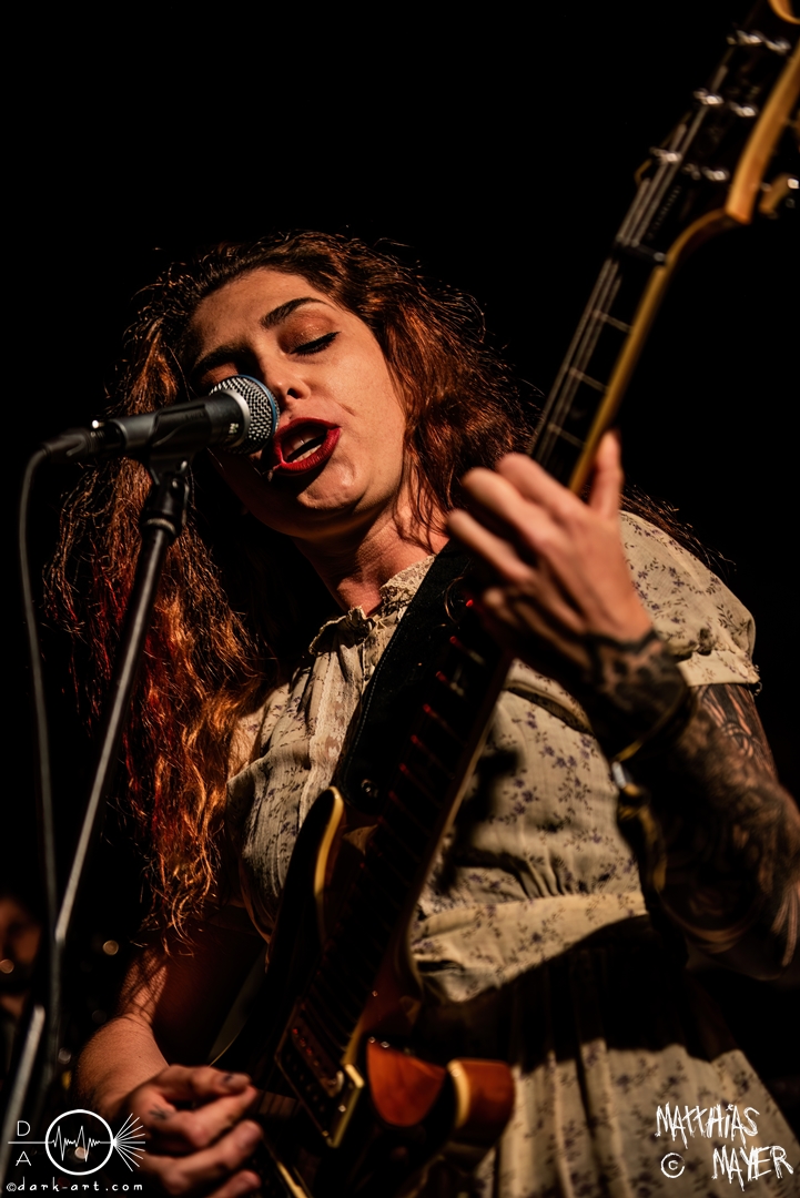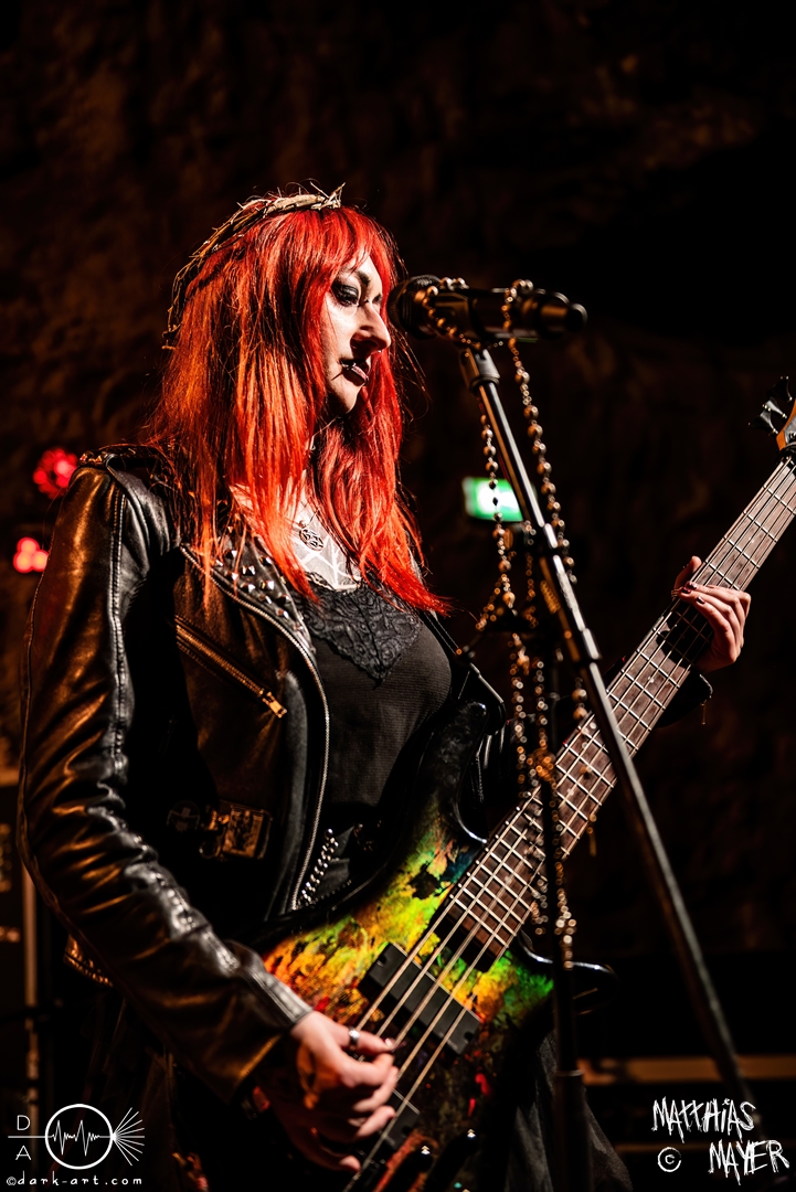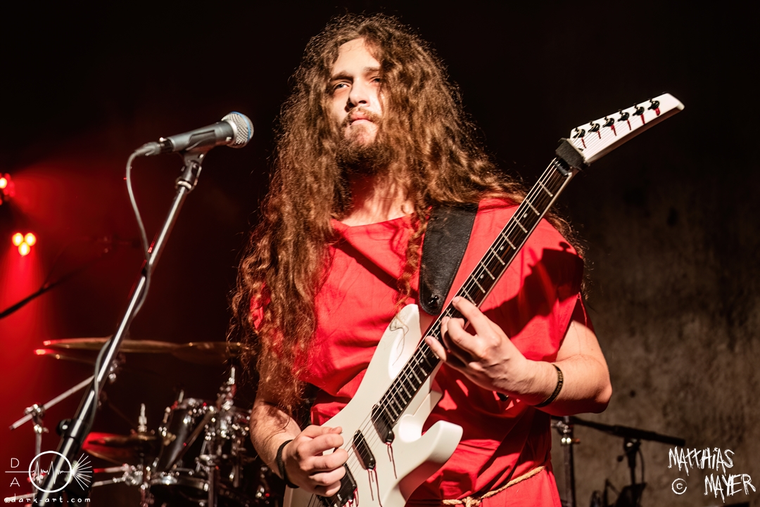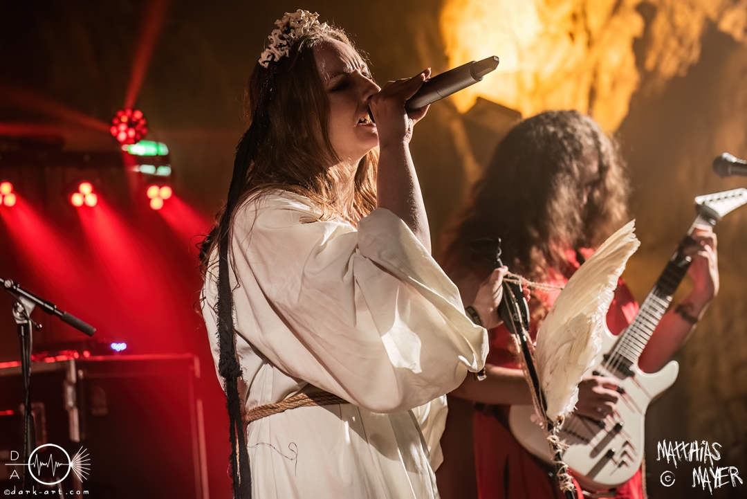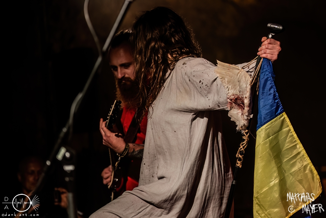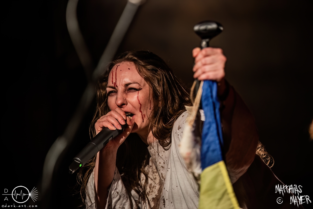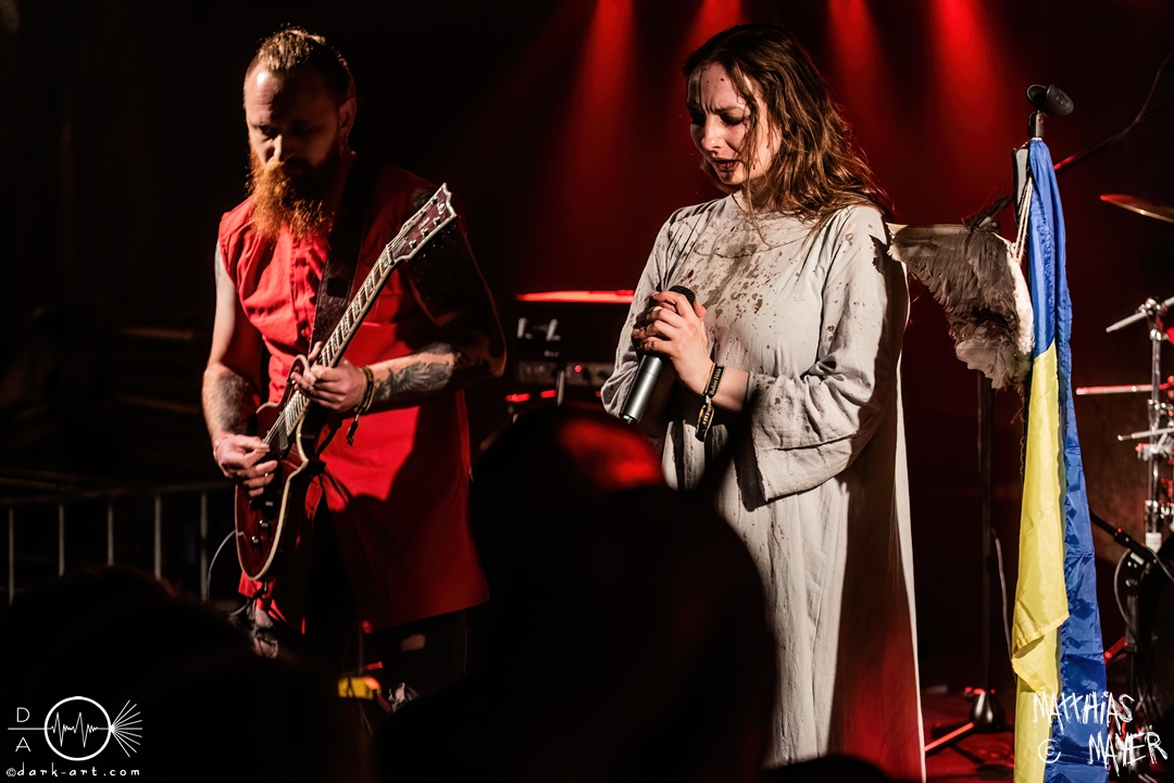 Weiter ging es auf der Nebenbühne mit der ehemals aus Weißrussland stammenden Doom/Post-Metal Band Dymna Lotva. Die Musiker, in rote Gewandungen gekleidet, wurden optisch kontrastiert von Sängerin Nokt, die im langen weißen Kleid und mit einem Haarreif aus Knochen auf die Bühne kam, der Mikrofonständer war verziert mit einer blutigen Vogelschwinge. Mit ihrem gesamten Auftritt schafft es die Truppe, die Emotion ihrer Musik zu transportieren und zu Recht drängen sich hier viele Besucher vor der Bühne. Auch scheut sich die Band nicht vor politischen Ansagen, und in der zweiten Show zierte zusätzlich eine Ukraine-Flagge die Bühne. Insgesamt war das zweite Set musikalisch etwas härter.
