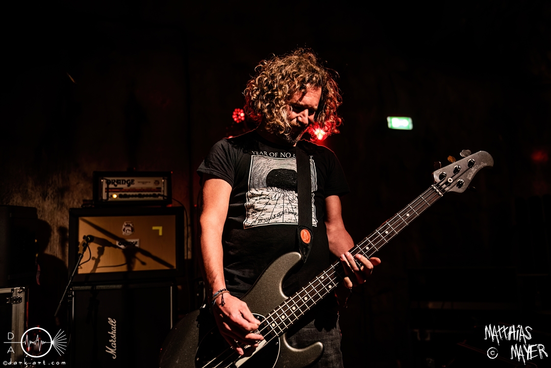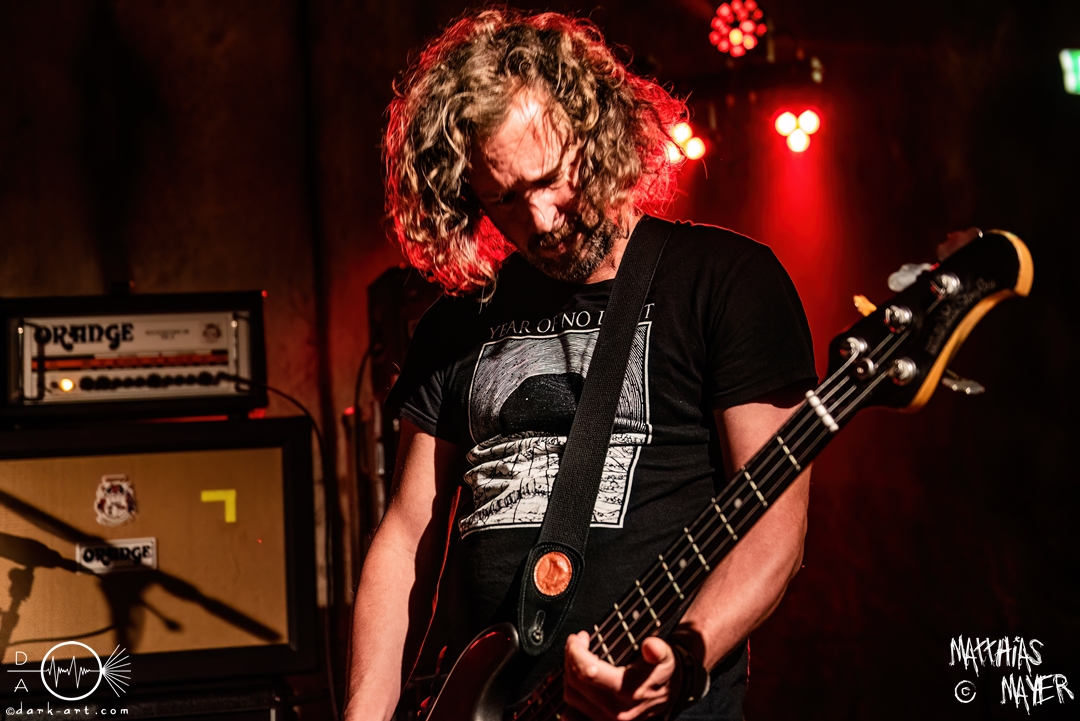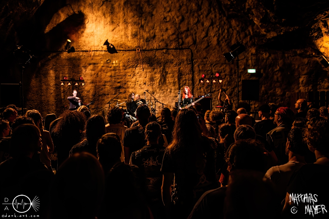 Der Samstag startete nun planmäßig auf der Hauptbühne im Höhleneingang mit E:L:R. Zwei weibliche Stimmen, zwei Saiteninstrumente, ein Schlagzeug und ganz viel Atmospheric Doom/Post-Metal. Die Melodie, getragen vom unsichtbaren Schlagwerk, unsichtbar, weil die dicke Nebelwand in Verbindung mit dem roten und weißen Licht die Sicht versperrte, bewirkte, dass alle perfekt aufeinander abgestimmt wirkte. Der Sound trug sanft durch den ersten Auftritt des Tages.
