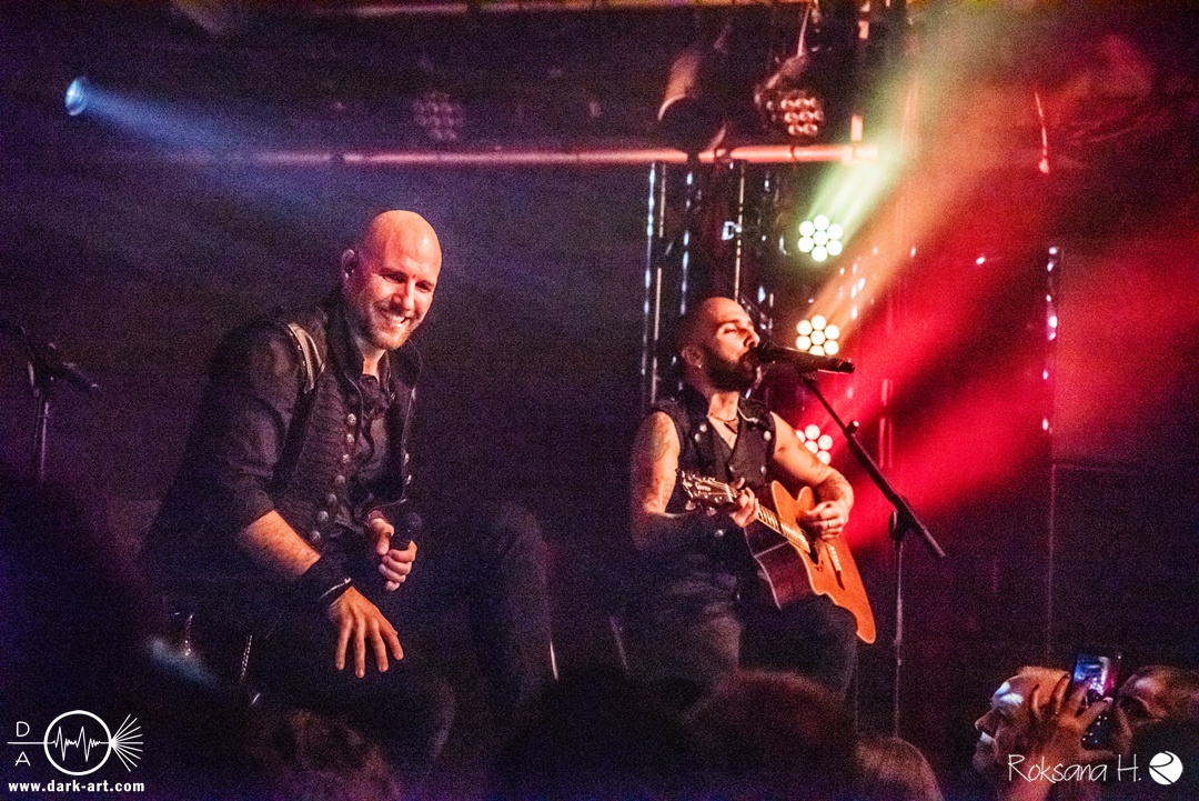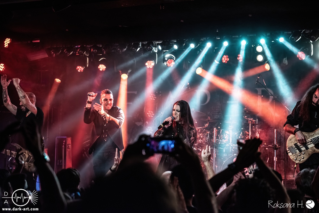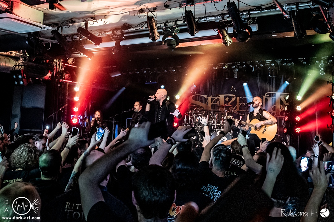 Zu guter Letzt Serenity, die österreichische Band, hat kürzlich erst ihr neues Album Nemesis A.D. veröffentlicht und ist dabei, es mit aller Energie auf die Bühne zu bringen! Das Album handelt von den Werken des Künstlers Albrecht Dürer, worauf sich das A.D. bezieht. Die Band ließ das Publikum jedoch die Bedeutung raten, und sie bekam allerlei Lustiges zu hören, wofür es stehen könnte, doch die Aschaffenburger waren mehr oder minder im Thema, zumindest wusste mindestens einer im Publikum die Antwort. Mit Ritter Tod und Teufel von der aktuellen Scheibe zeigte sich auch, dass das Publikum bereits textsicher war. Zwischen all den Ansagen und dem ein oder anderen Witz, auf seine Kosten oder die der Kollegen, gab es einiges an Musik. So holte Sänger Georg zu Souls and Sins den Temprance-Sänger Michele auf die Bühne, was das Publikum massiv begeistern konnte. Und ein begeistertes Publikum lässt alles mit sich machen, so ließen Serenity die Crowd zu Set the World on Fire auch etwas gegen die Schwerkraft ankämpfen und springen! Dem Ganzen folgte auch ein Akustikblock, bei dem die Band, reduziert auf Georg und Marco, noch einen ihrer Songs wiedergab, sowie einen von dem gemeinsamen Akustik-Projekt Fallen Senctury.