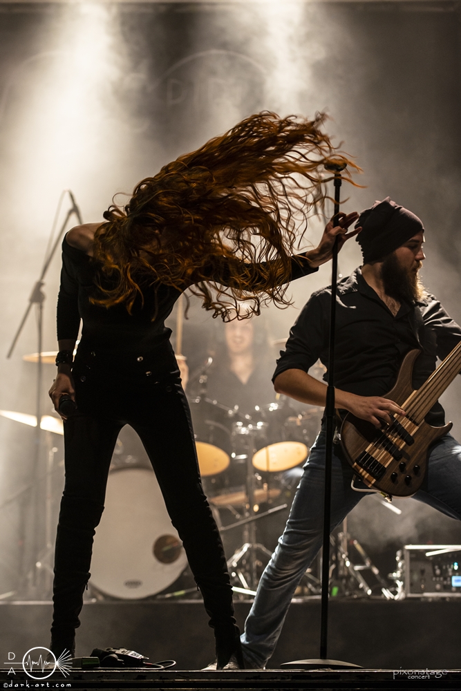 Man bemerkte kaum, wie die Zeit verging und nach einer kurzen Umbaupause wart es schon so weit, dass die vorletzte Kapelle des Abends in Ihre Show startete. „Snow White Blood“ hießen die Zauberworte, welche bereits eine märchenhafte Atmosphäre vermuten lassen. Und dafür stehen die vier Musiker aus Hessen auch. Sowohl musikalisch als auch optisch geht das Konzept voll auf. Wenn dann noch die 2016 Erstveröffentlichung „Once Upon A Fairytale“ betitelt wird, sind alle Fragen hierzu spätestens aus der Welt geschaffen. Und mit der Bewegungsfreiheit, die für alle Musiker zur Verfügung stand, konnte auch voller Energie und mythischer Atmosphäre durchgestartet werden. „Drop a Stitch“ und „The Court“ bildeten hier nur den Anfang und ließen die richtige Vermutung zu, dass die Spitze des Eisbergs noch in weiter Ferne liegt und man noch viel zu erwarten hatte. Symphonic Metal in einem sehr „modernen“ Gewand, der aber auch zum Träumen einlädt und dabei nichts an seiner rockigen Attitüde einbüßt. Darüber eine Stimme, die im Ansatz an Größen wie „Within Temptation“ erinnert, ließen auch die „The Court Jester“, „Mirror on the Wall“ (von der 2016er EP) oder „Longing for the Sea“ ausdrucksstark zur Geltung kommen. Ich muss an dieser Stelle gestehen, dass ich „Snow White Blood“ bis dato nur von den Aufnahmen her kannte und mir vorher schwermütige Gedanken um die Live Umsetzung gemacht hatte, da ich mir nicht sicher war, ob die Band wirklich das ausdrücken können wird, was ich beim Hören vermutete, dass dargestellt werden soll. Doch nachdem „Shadows of our Yesterdays“ und „Shared Hearts“ mich fast schon vor Begeisterung der Darbietung erdrückten, war mir klar, dass all meine Sorgen und Zweifel über Bord geworfen wurden. Denn wie es sich für eine „gute Band“ in meinen Augen gehört, war „Snow White Blood“ Live noch überzeugender, stärker und genialer, als man es von den Aufnahmen her gewohnt war. „Lullaby for the Undead“ wurde nun ausgepackt und das in der erst letztes Jahr erschienenen Edit Version, welche 2019 noch einmal als Single veröffentlicht wurde, bevor „Shehezerade“ als letzter Song und großes Finale kamen. Zusammengefasst, bleibt mir hier nur noch einmal zu erwähnen, dass „Snow White Blood“, genau wie alle anderen Bands des Abends, für jeden Genreliebhaber immer einen Besuch wert sind und man dieses Risiko nach Möglichkeit eingehen sollte, da nicht mit einer Enttäuschung zu rechnen ist, man jedoch ehr eine neue Band für seine private Playlist entdecken wird. Im Übrigen für alle die Neugierig geworden sind, am 16.10. erscheint der Song „Shared Hearts“ als Singleauskopplung für den sich Sängerin „Ulli Perhonen“ im Studio als Duettpartnerin keine andere als Lilly Seth (Aeranea & Hereafter) zur Unterstützung holte. Also stay tuned!!!