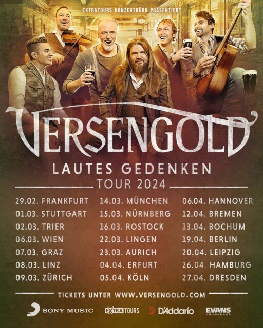 Die deutsche Folk-Rock-Band Versengold hat ihre Lautes Gedenken Tour 2024 angekündigt. Mit ihrem neuesten und neunten Album im Gepäck, das der Tour seinen Namen leiht, geht es am 29. Februar in der Frankfurter Batschkapp los und umfasst 21 Städte in Deutschland, Österreich und der Schweiz. Dort werden Versengold euch Lautes Gedenken präsentieren, welches am 3. November 2023, zu ihrem großen Jubiläumskonzert in Hamburg, veröffentlicht wurde. Die Tickets für die Shows sind bereits im Vorverkauf erhältlich und einige Shows ausverkauft, also haltet euch besser dran.