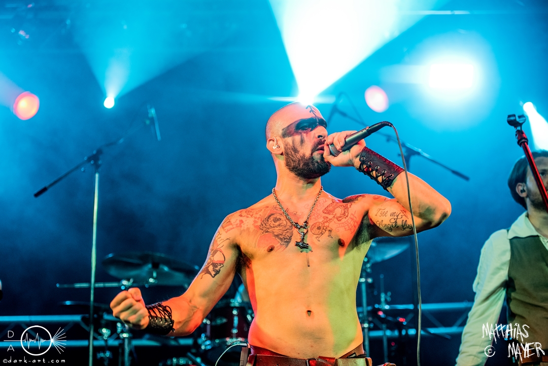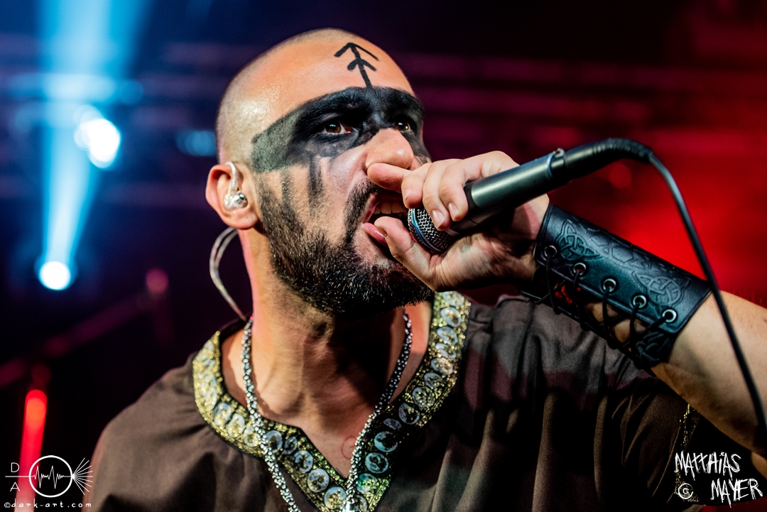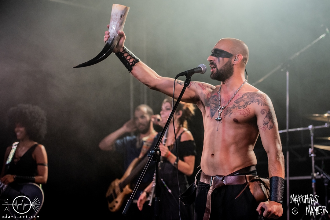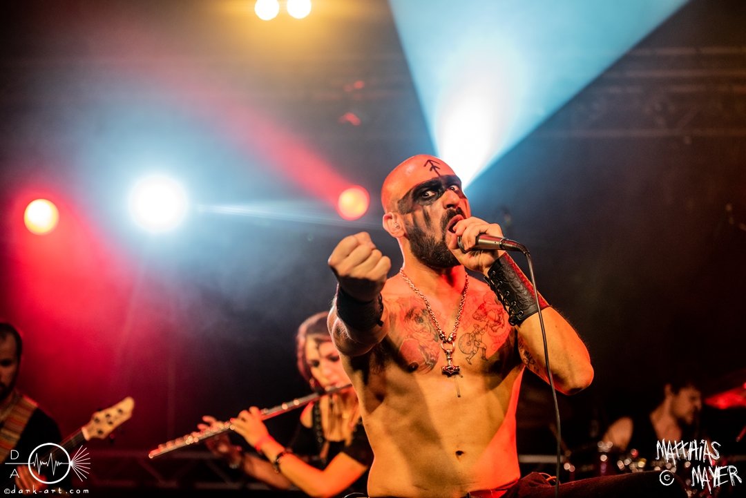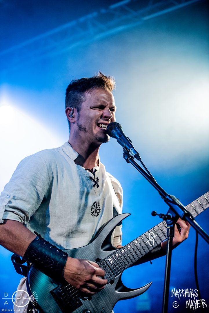Dann betraten die acht Jungs und Mädels von Aexylium die Bühne. Musikalisch präsentieren sie sich sehr viel schneller als die vorherige Band und beweisen, dass sie in der Lage sind richtig Stimmung zu machen. Von Partynummern wie Skal, epischen Geschichten wie Into the Jaws of Fenrir sowie ruhgien instrumentalen Stücken ist alles dabei, was das Folk Metal Herz erfreut. Wer sich im Nachhinein die CDs angehört hat wird dabei gemerkt haben, dass die weiblichen Vocals weggefallen sind, eine Version der Songs, die ebenfalls sehr gut ankommt. Besonders Sänger Steven unterhielt das Publikum hervorragend.