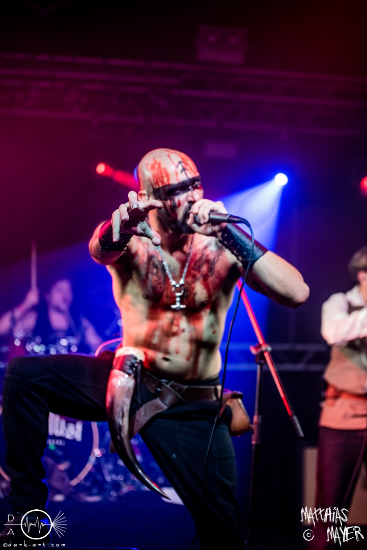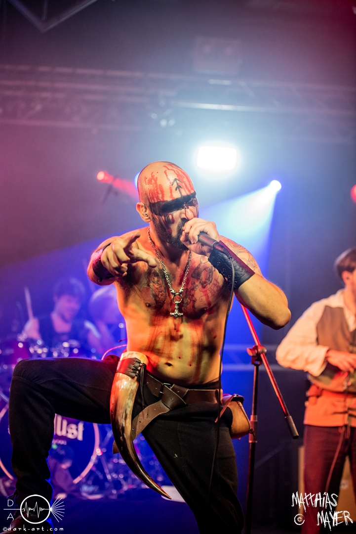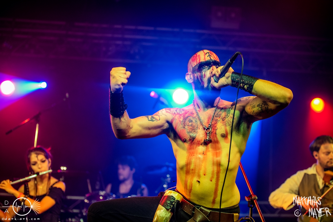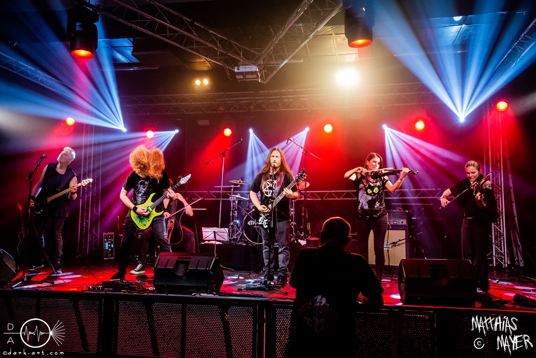 Dann betraten die acht Jungs und Mädels von Aexylium die Bühne. Musikalisch präsentieren sie sich sehr viel schneller als die vorherige Band und beweisen, dass sie in der Lage sind richtig Stimmung zu machen. Von Partynummern wie Skal, epischen Geschichten wie Into the Jaws of Fenrir sowie ruhgien instrumentalen Stücken ist alles dabei, was das Folk Metal Herz erfreut. Wer sich im Nachhinein die CDs angehört hat wird dabei gemerkt haben, dass die weiblichen Vocals weggefallen sind, eine Version der Songs, die ebenfalls sehr gut ankommt. Besonders Sänger Steven unterhielt das Publikum hervorragend.