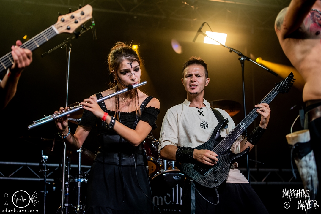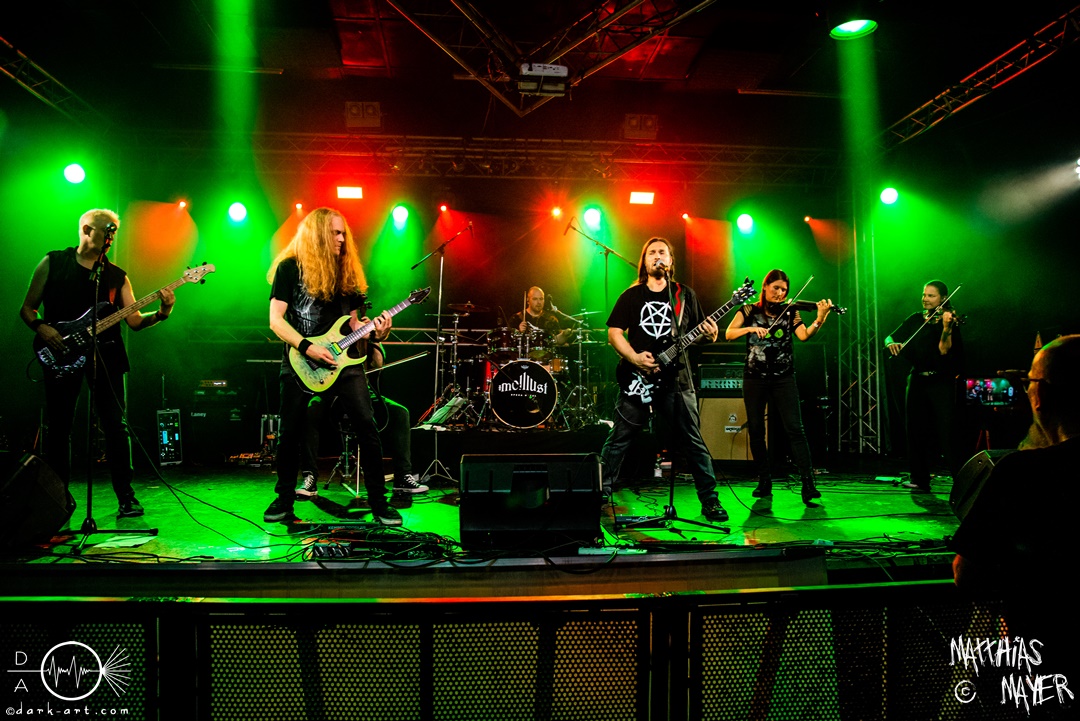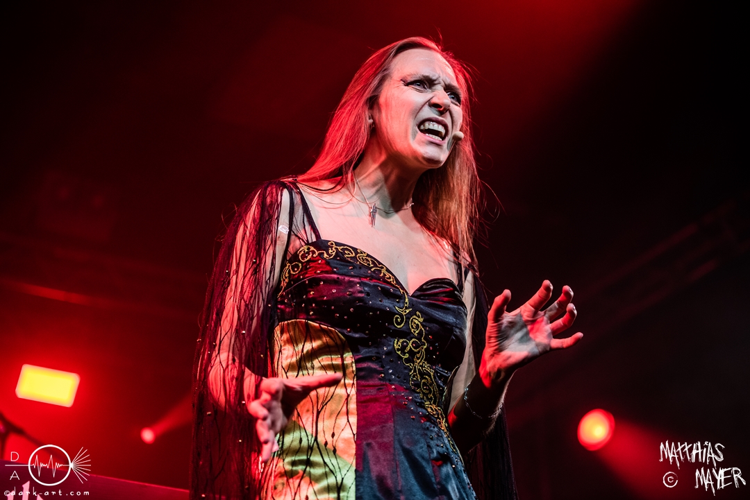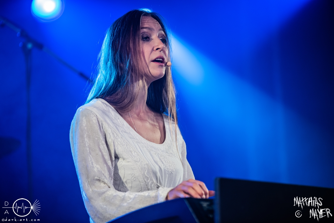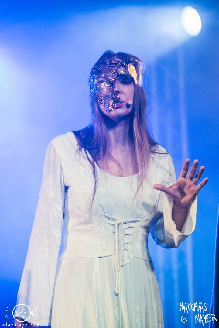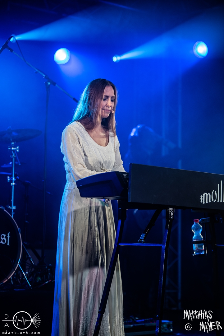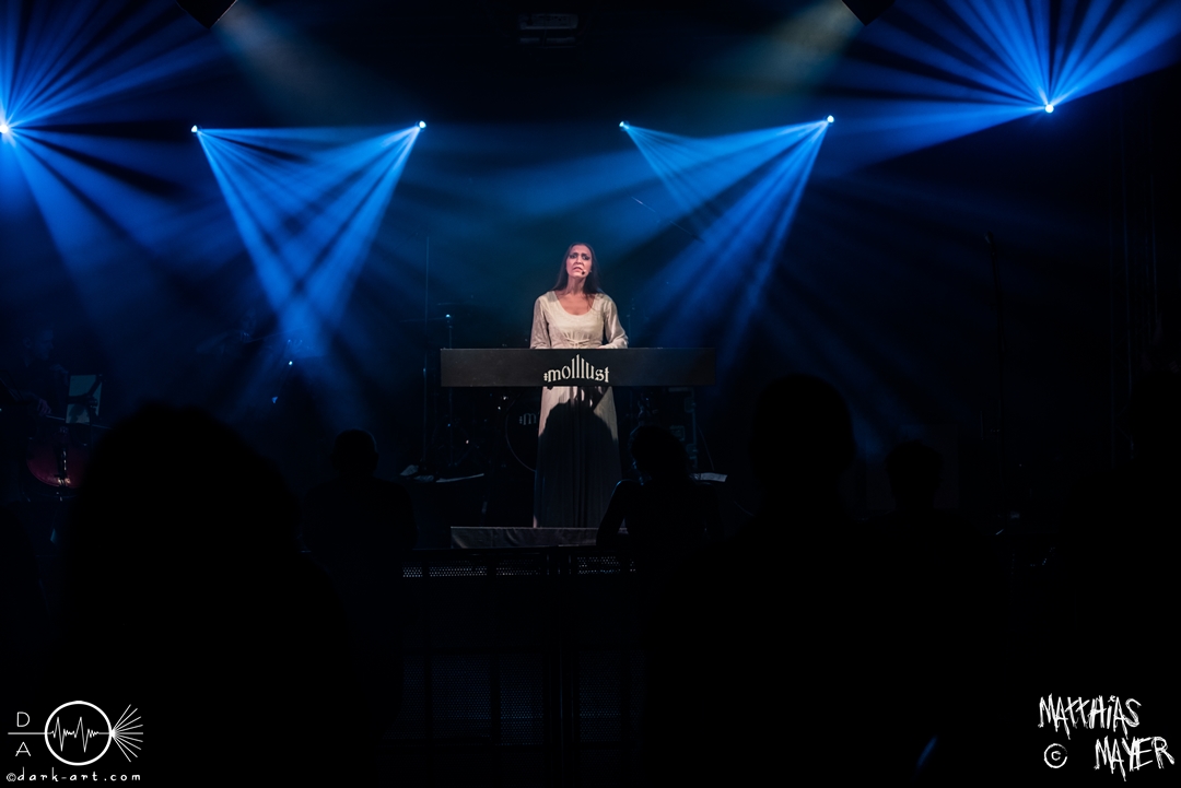 molllustDen Abschluss bildeten traditionell die Gastgeber molllust, die in neuer Besetzung die Bühne betraten und ihren zweiten Bassisten Niklas erstmalig mit auf der Bühne hatten. Wer die Band kennt war zum Beginn auch nicht überrascht. Während der erste Teil des Auftritts dem entspricht was man schon von molllust kennt. In einer kurze Pause, in der Janika die Bühne verlässt, stellt Frank nun die Band vor, während nun Bassist Simon die Bühne betritt und Niklas ersetzt. Im wunderschönen schwarzen Kleid kommt nun auch Janika zurück und präsentiert das neue Kleid passend zum neuen Album. Denn nun werden auch die neuen Songs präsentiert. Mit den 4 Songs zu Venus, Saturn, Mars und Pluto präsentiert die Band einen großzügigen Ausblick auf’s neue Album, welches im Herbst erscheint. Bei Pluto erscheint